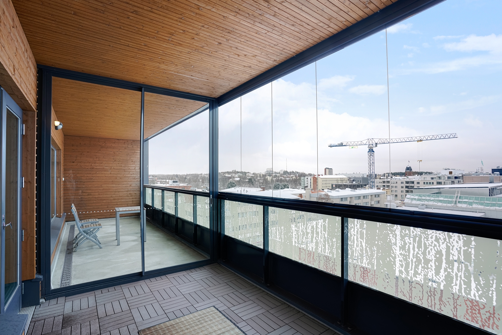 | Seinämateriaalien kuvaus | Parvekkeesta puolet lasitettu ja puolet ei lasitettu, tilat erottaa lasiseinä |