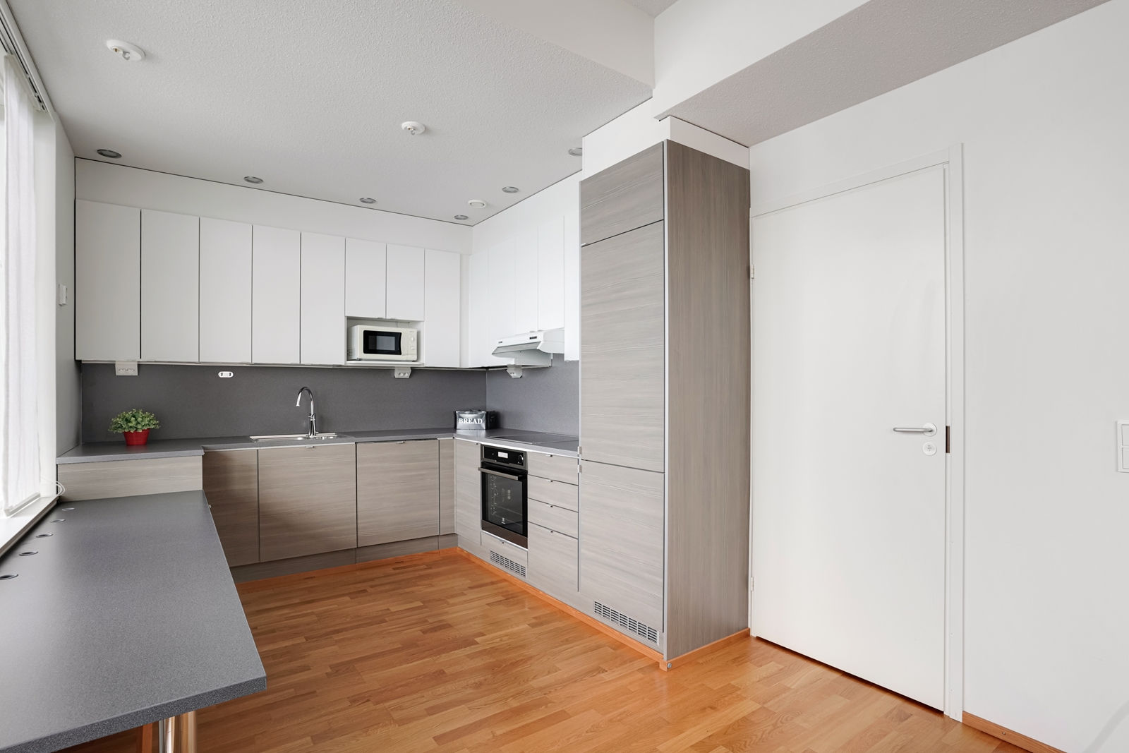 | Keittiön kuvaus | Liesi (Keraaminen liesi), työtasot (laminaatti), seinät (maali), lattiat (parketti), jää-viileäkaappi, liesi, liesituuletin ja astianpesukone |