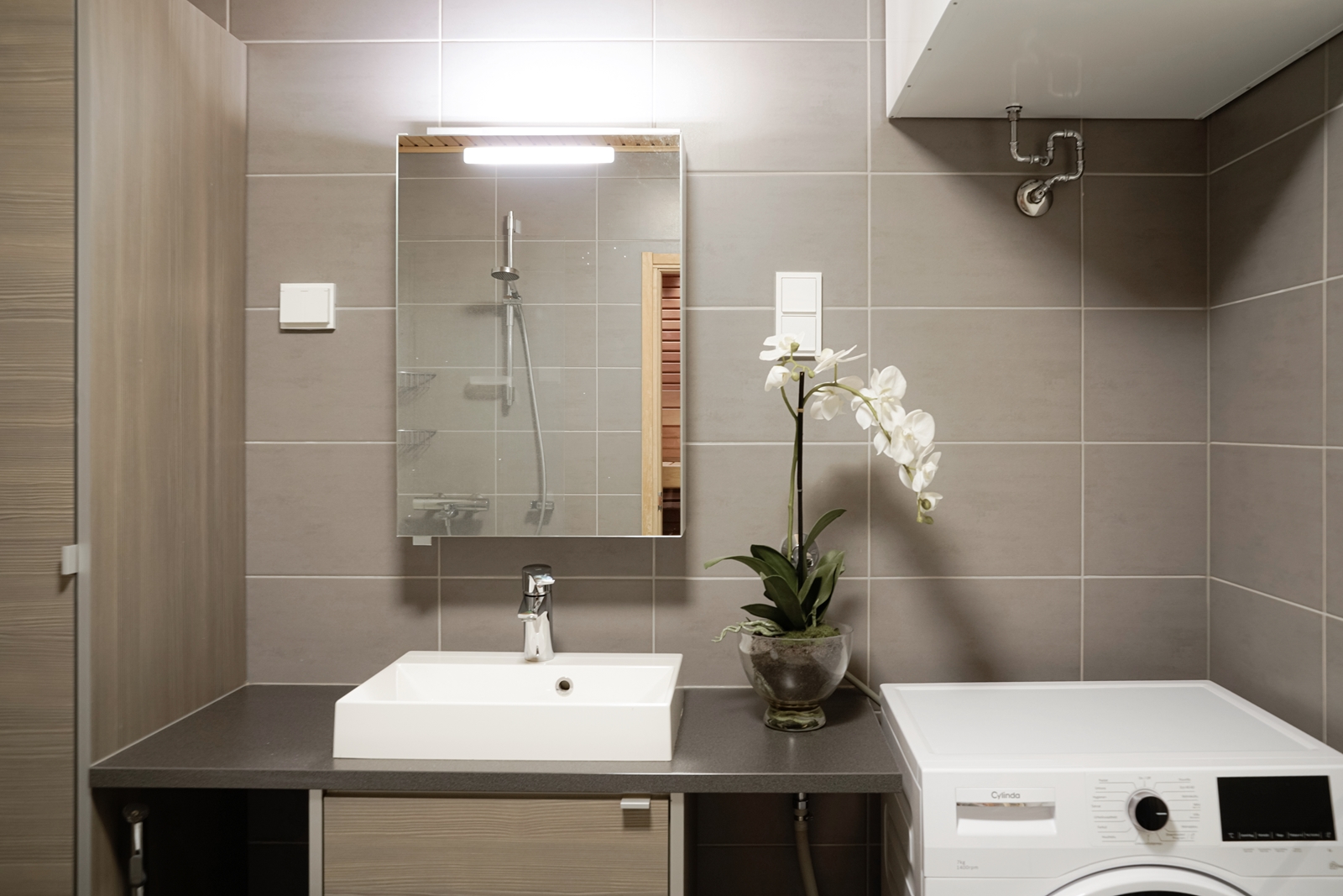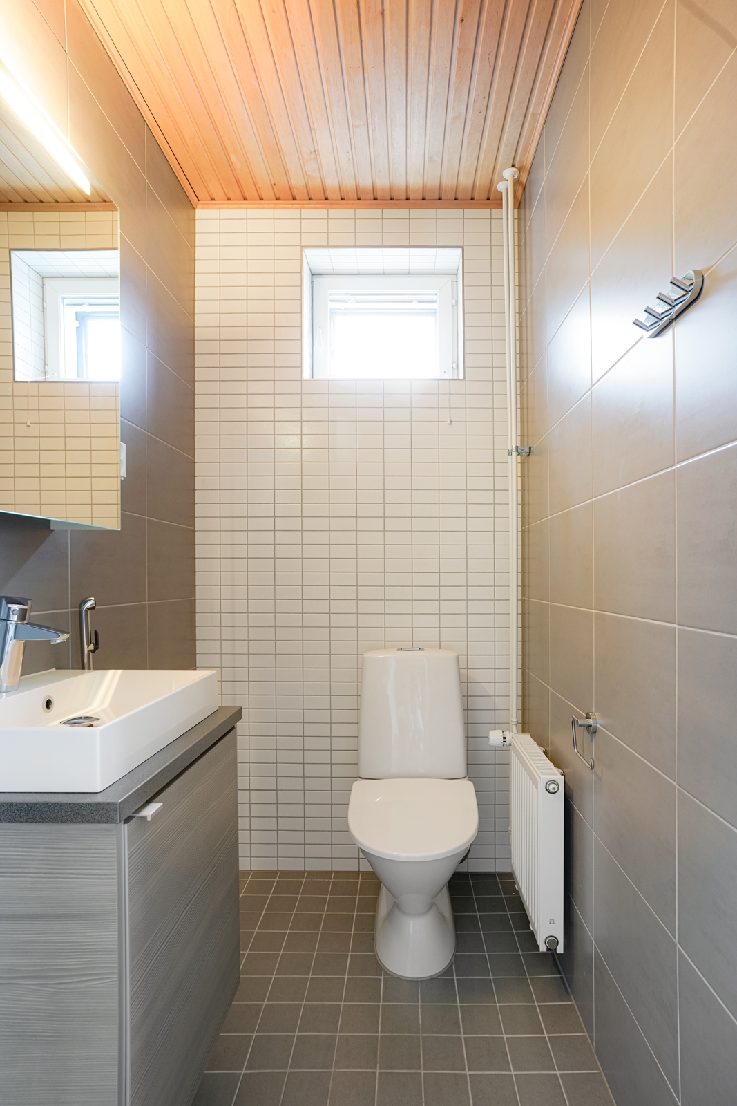 | Kylpyhuoneen kuvaus | WC-istuin, suihku, suihkuseinä, pesukoneliitäntä ja lattialämmitys, seinät (kaakeli), lattiat (laatta) |