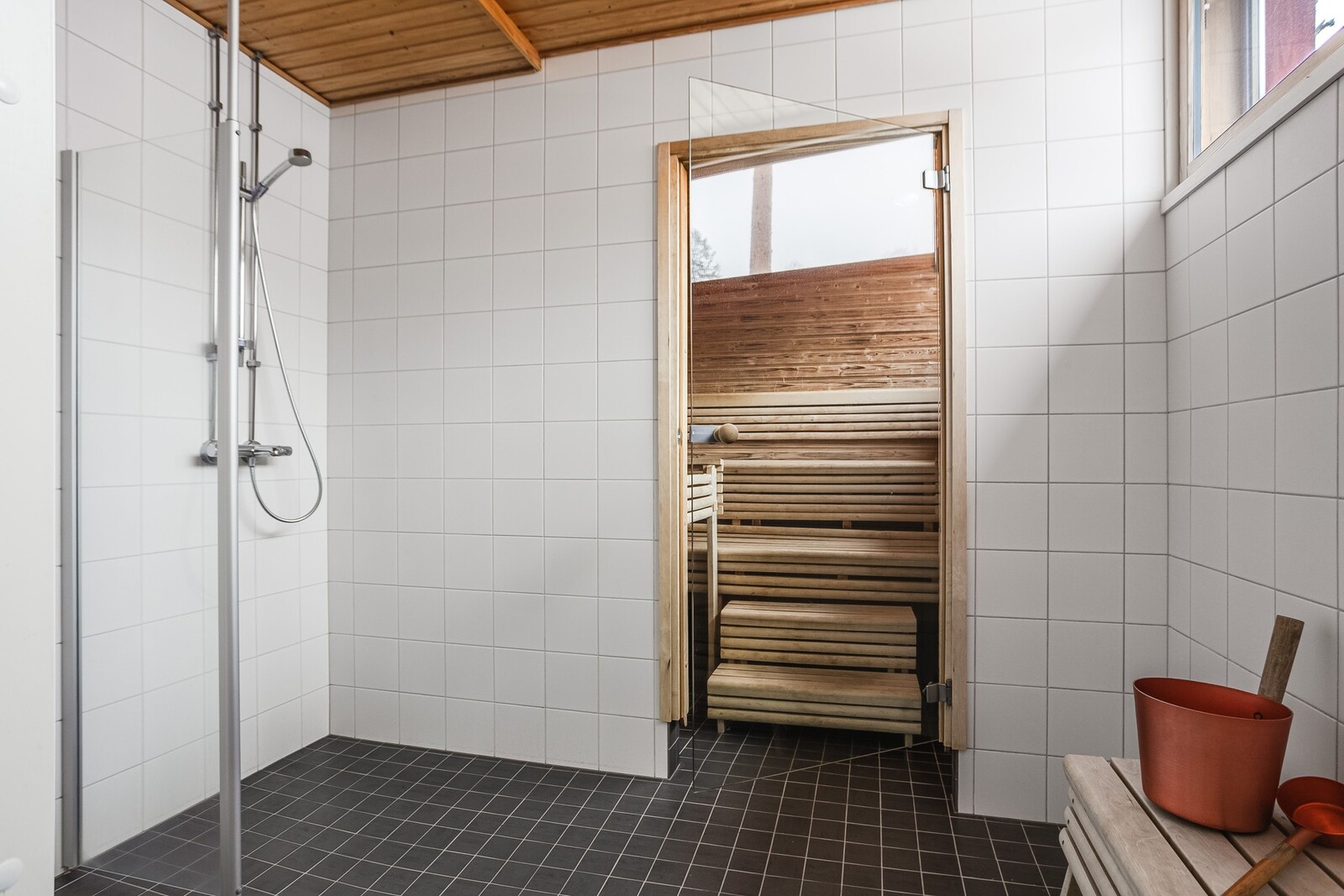 Taloyhtiössä hyvät yhteiset tilat ja saunaosasto erillisessä piharakennuksessa.