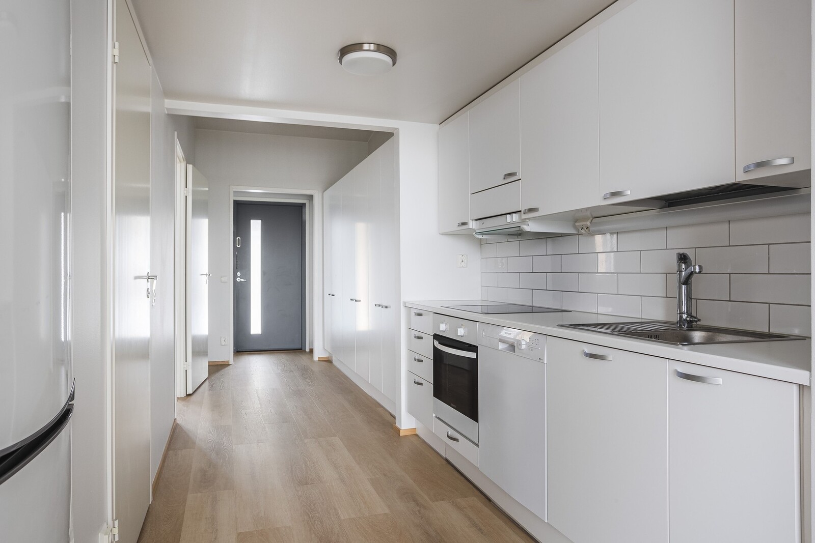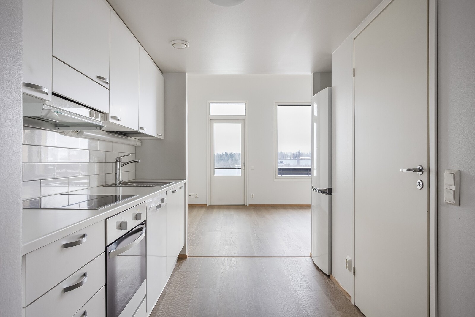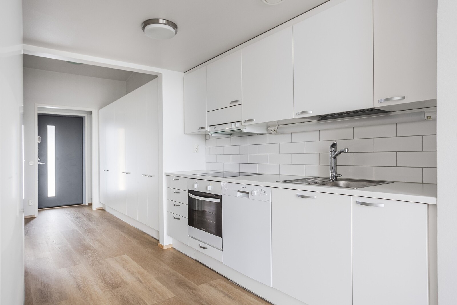 Liesi (erillisuuni, liesitaso), työtasot (laminaatti), seinät (maali), lattiat (vinyylikorkki), jääkaappipakastin, erillisuuni, astianpesukone ja kiinteät valaisimet, liesitaso, liesituuletin / hormi |
