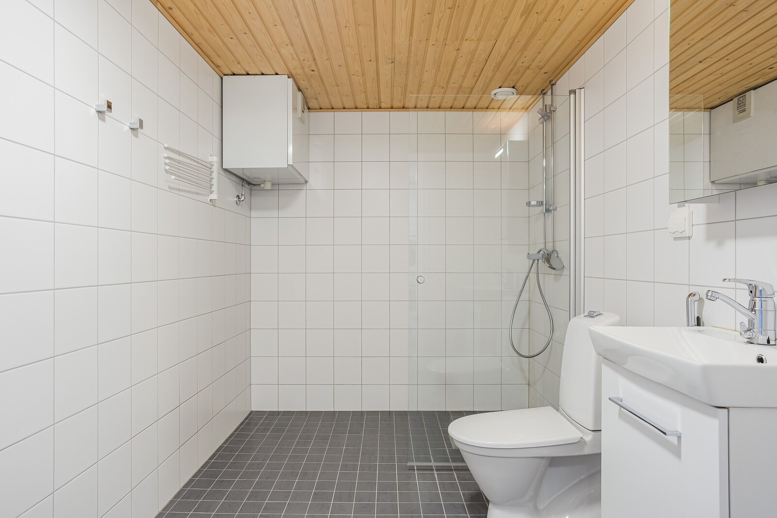 Lattialämmitys, peili, suihkuseinä, suihku, wc-istuin, pesukoneliitäntä ja kiinteät valaisimet, seinät (kaakeli), lattiat (laatta) |
