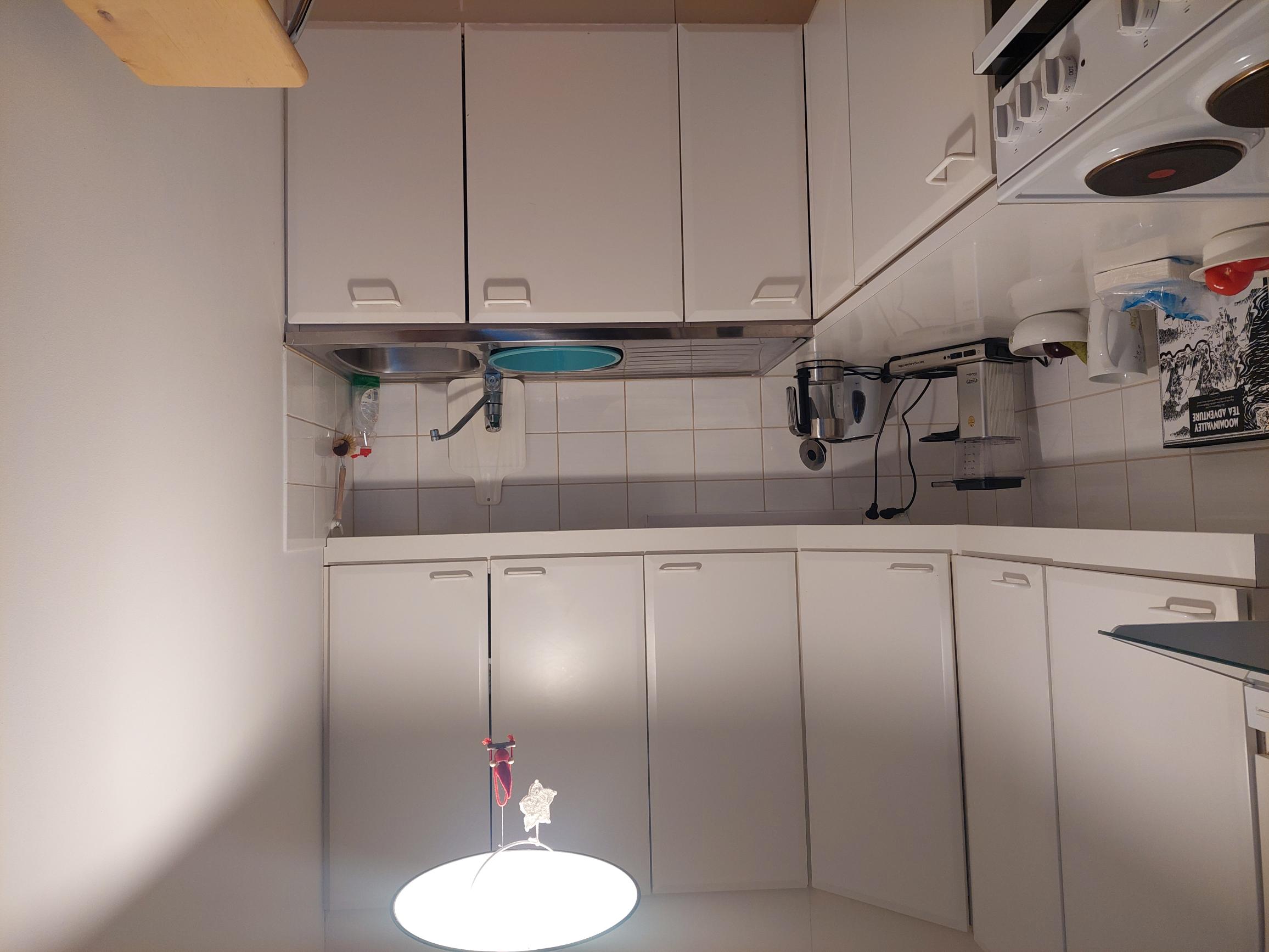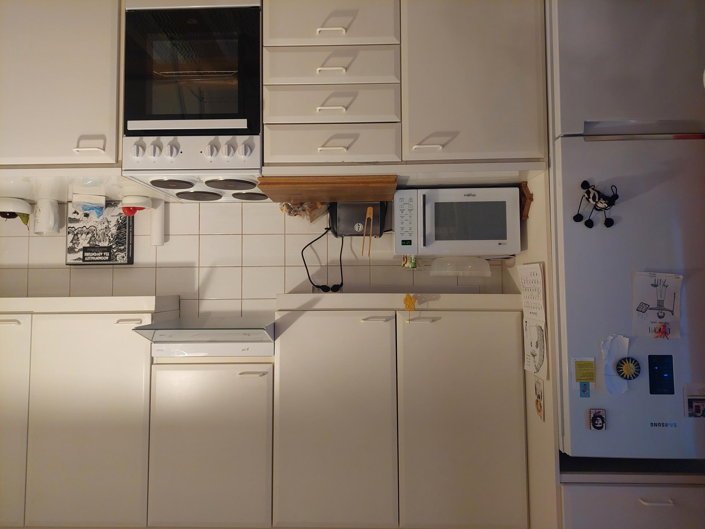 | Keittiön kuvaus | Liesi (Sähköhella), työtasot (laminaatti), seinät (maali ja kaakeli), lattiat (parketti), jääkaappipakastin |
