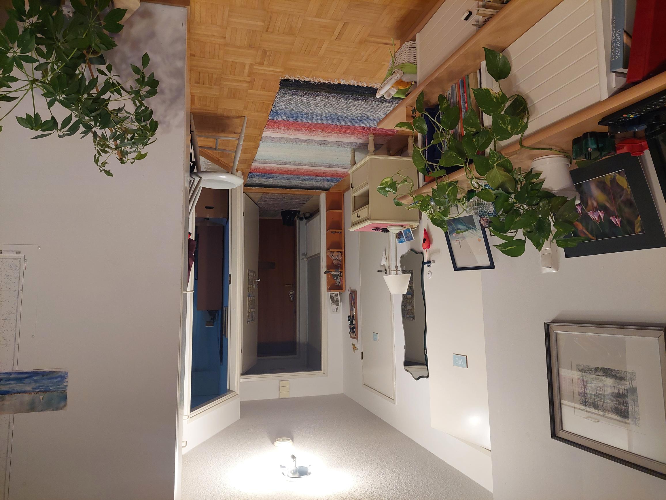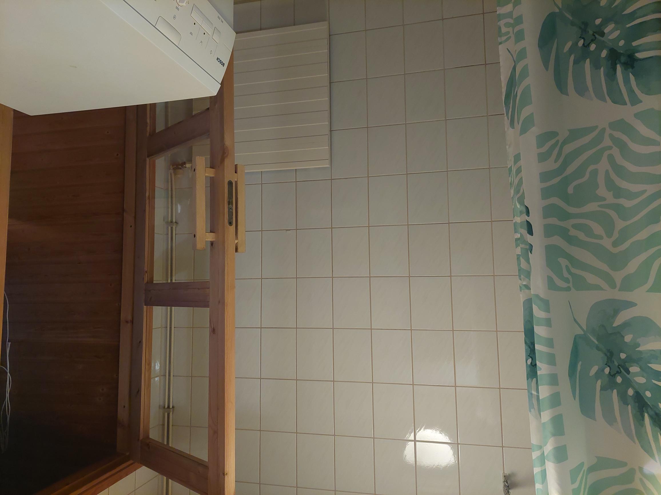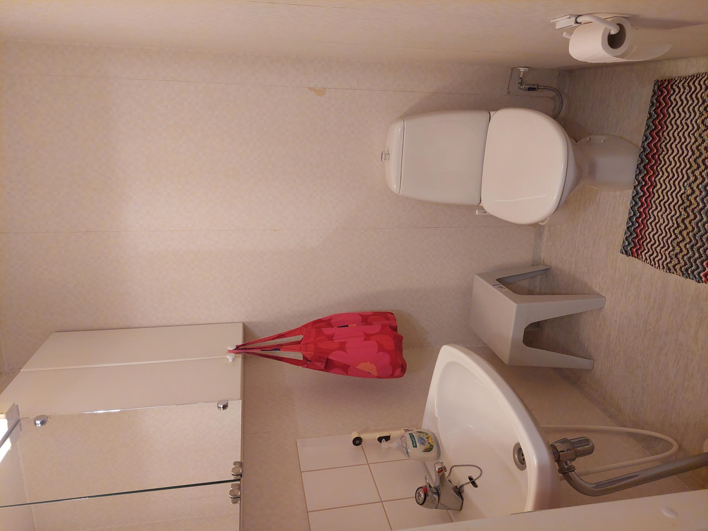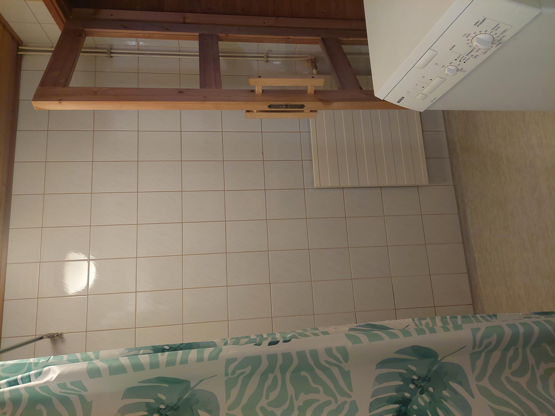 | Kylpyhuoneen kuvaus | Suihku ja pesukoneliitäntä, seinät (kaakeli), lattiat (muovimatto) |