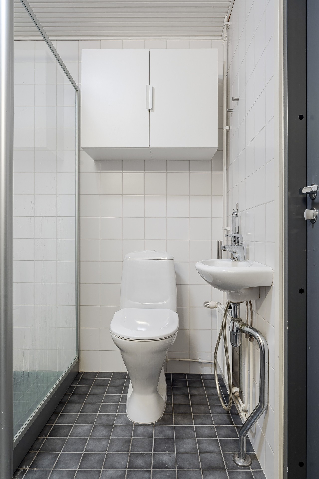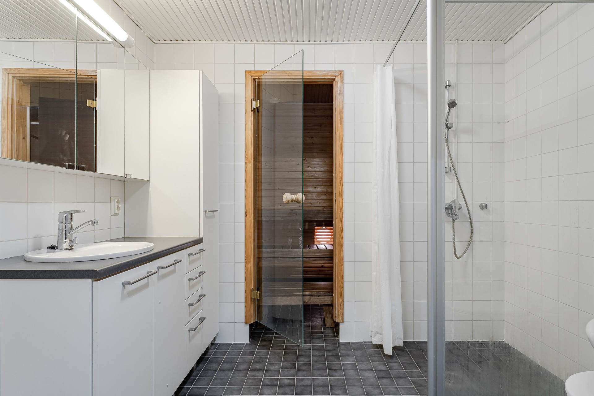 | Kylpyhuoneen kuvaus | WC-istuin, suihku, suihkuseinä, allaskaappi, bidee-suihku, pesuallas, peilikaappi, pesukoneliitäntä ja korkeakaappi, seinät (kaakeli), lattiat (laatta) |