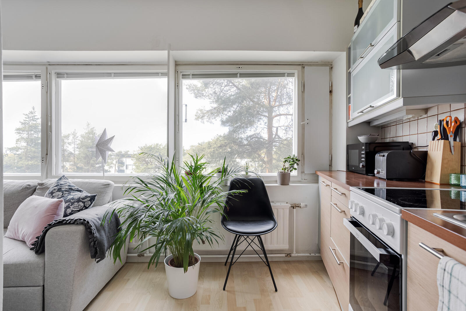 Liesi (Keraaminen liesi), lattiat (laminaatti), liesituuletin ja jääkaappipakastin |