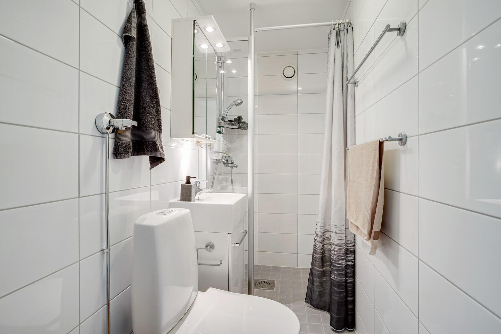 Suihku, wc-istuin, lattialämmitys, peilikaappi, pesukoneliitäntä ja suihkuseinä, seinät (kaakeli), lattiat (laatta) |