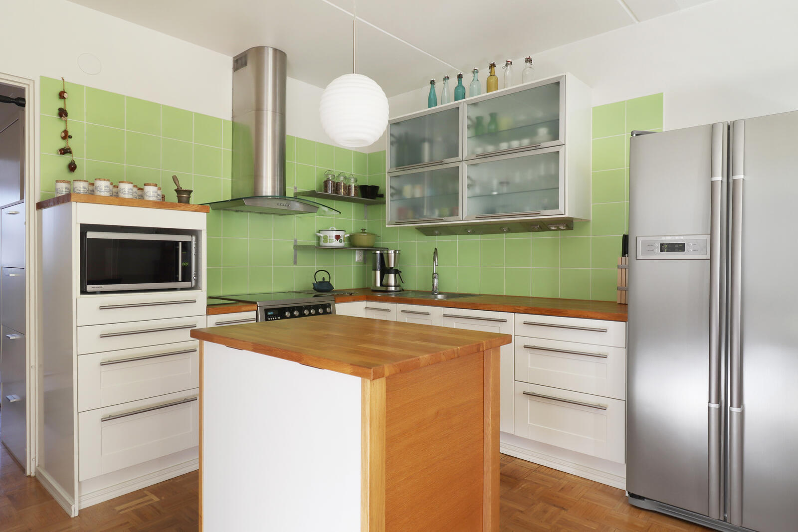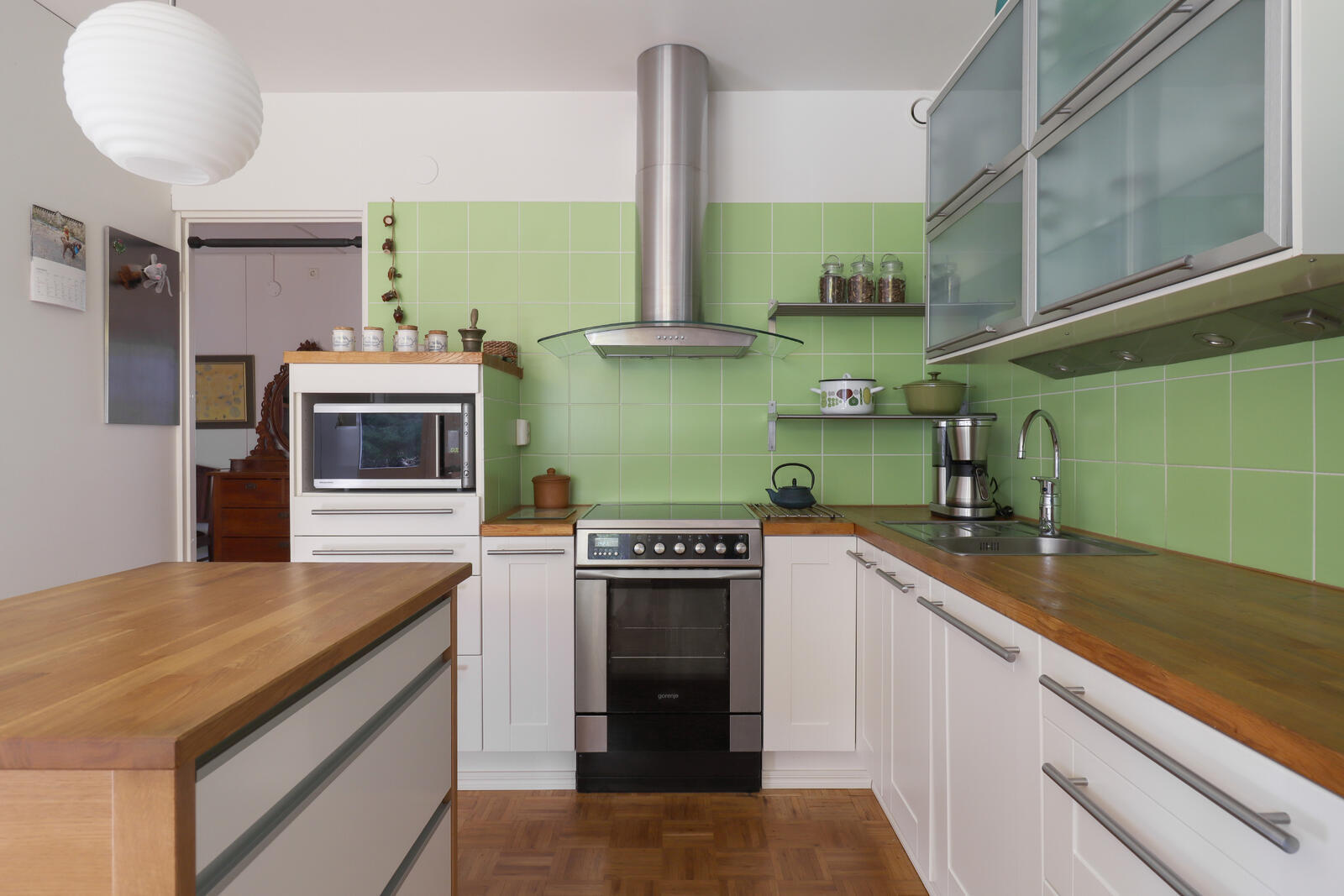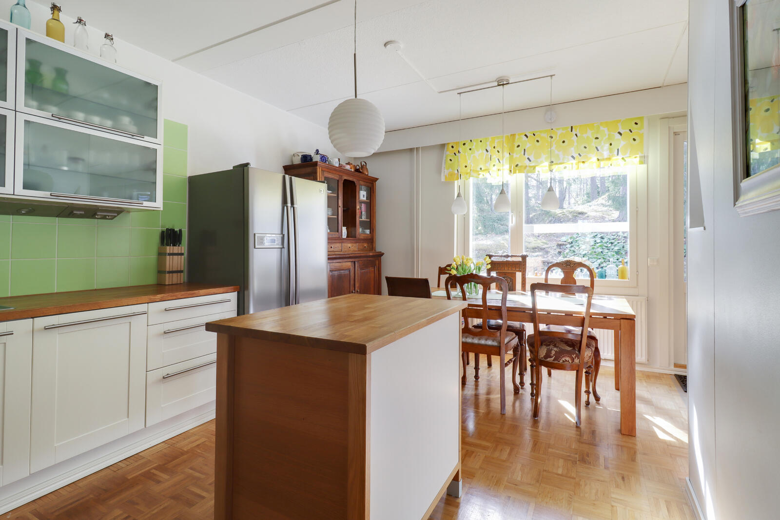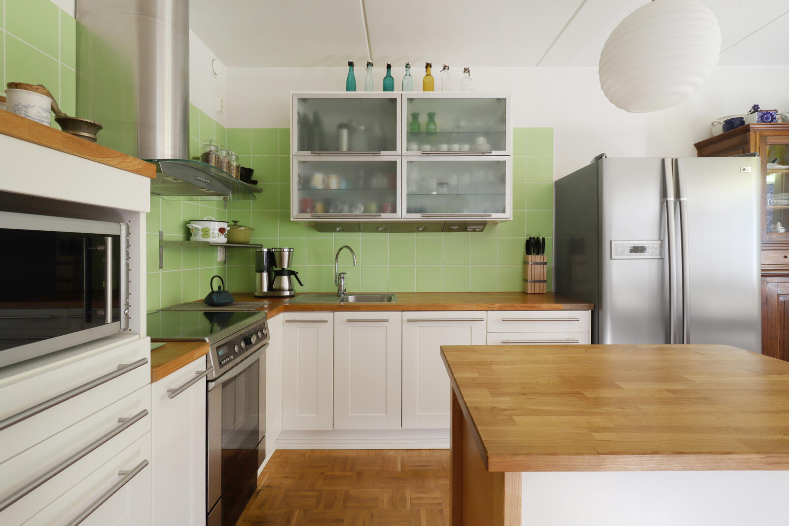 Liesi (Keraaminen liesi), työtasot (puu), seinät (laatta ja maali), lattiat (parketti), astianpesukone, liesituuletin, jääkaappipakastin ja kiinteät valaisimet |