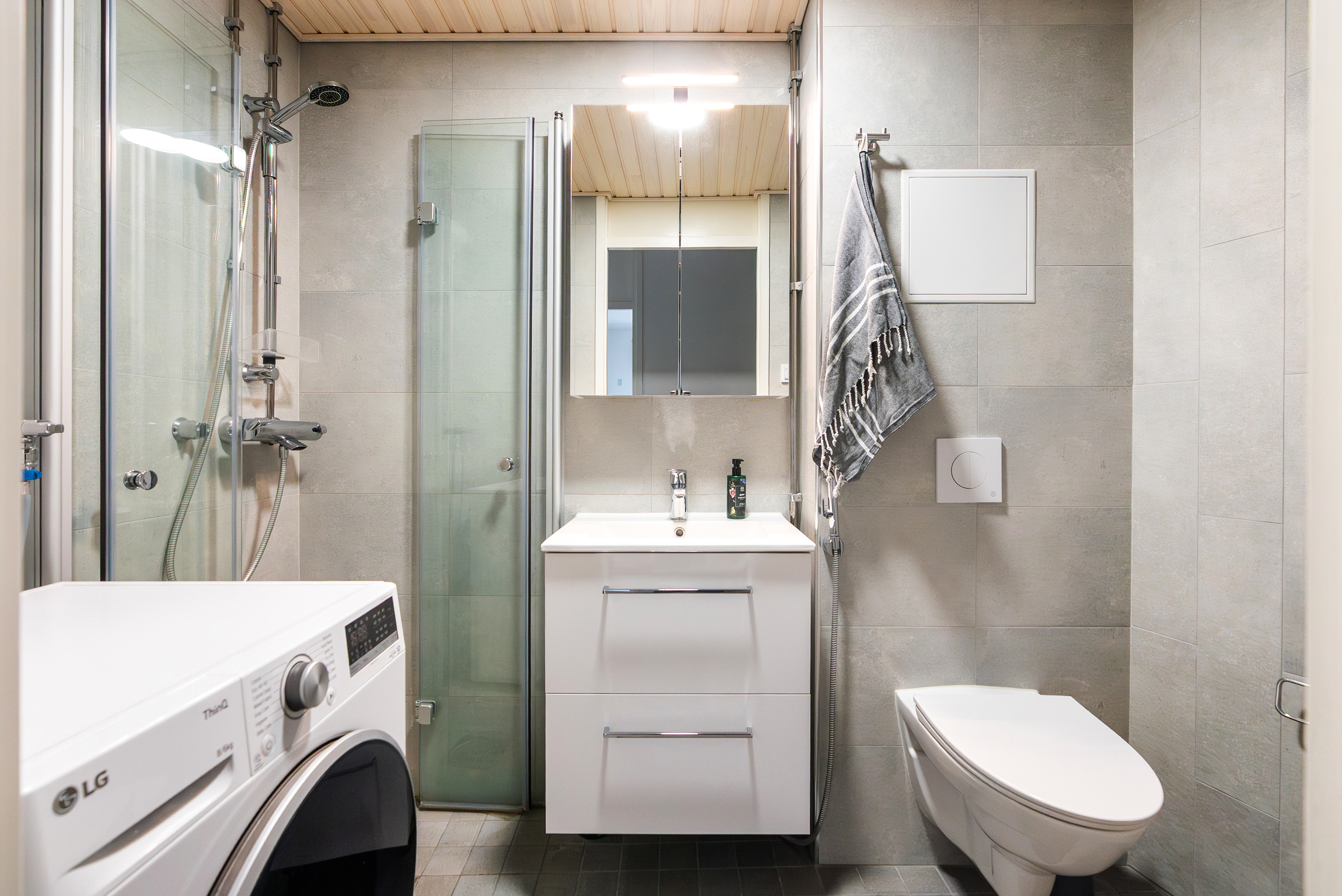 | Kylpyhuoneen kuvaus | WC-istuin, suihku, pesukoneliitäntä, lattialämmitys, bidee-suihku ja pesuallas, seinät (kaakeli), lattiat (laatta) |