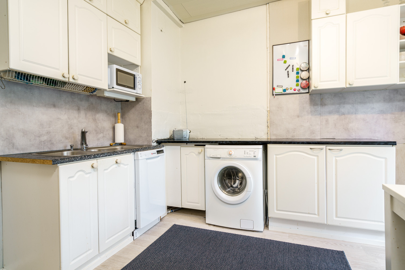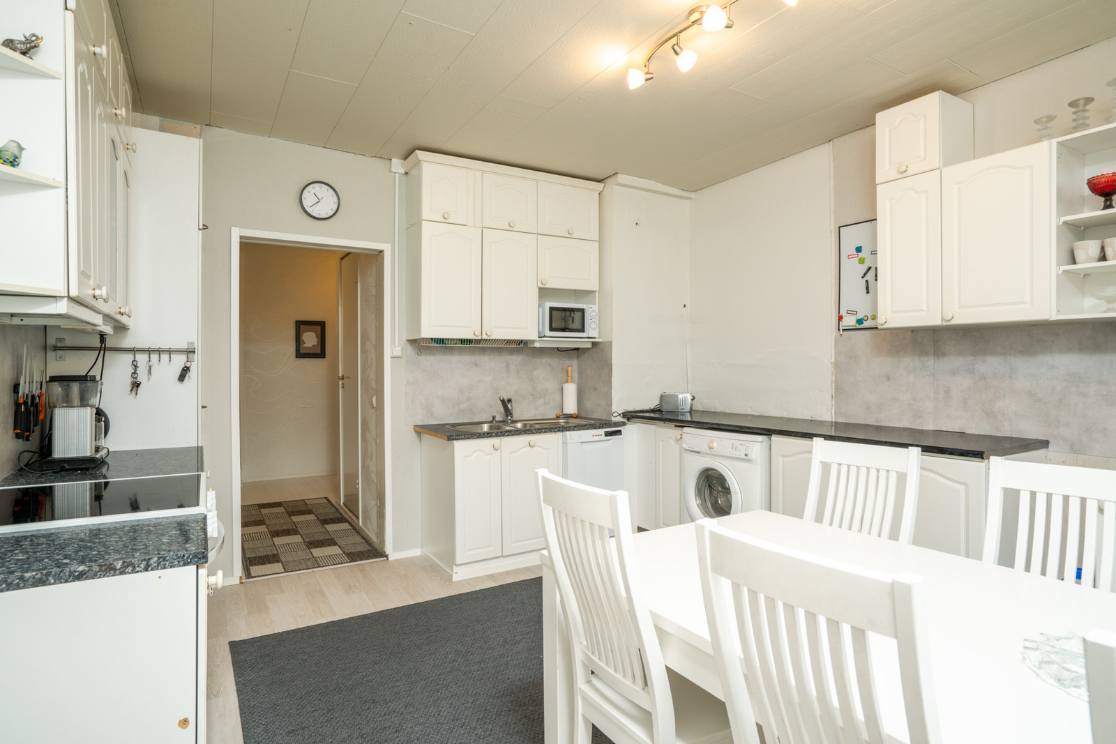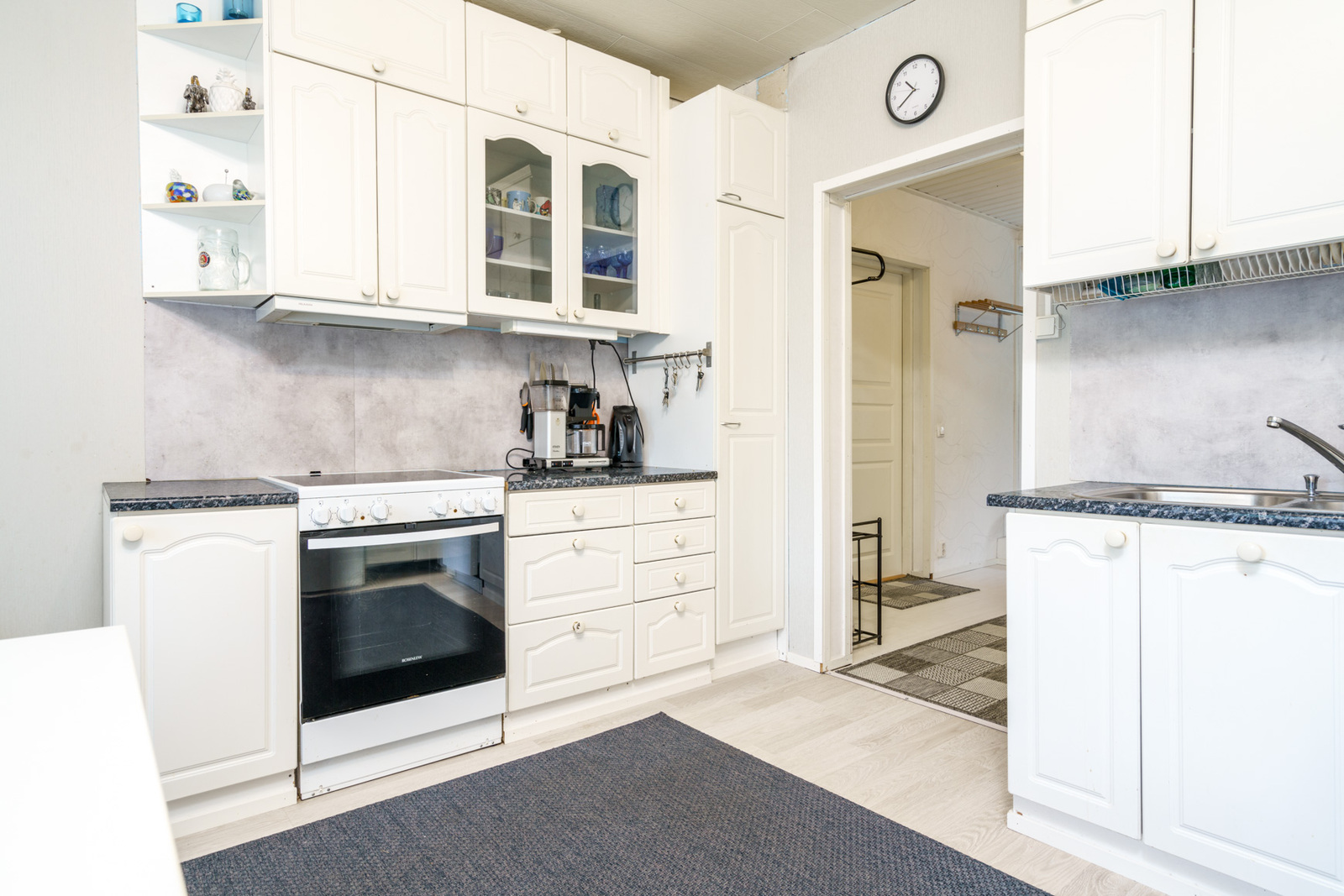 Liesi (Keraaminen liesi), työtasot (laminaatti), seinät (tapetti), lattiat (laminaatti), astianpesukone, jääkaappipakastin, liesituuletin ja liesi |