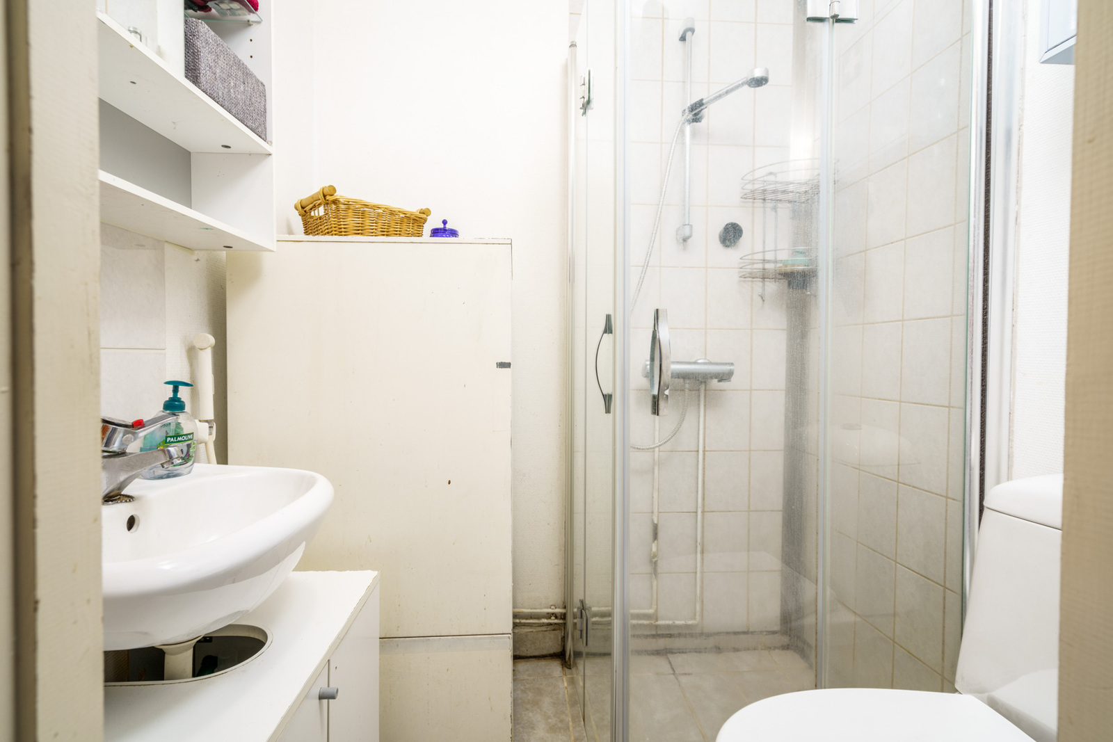 Suihkuseinä, peilikaappi, suihku ja wc-istuin, seinät (kaakeli ja lasikuitutapetti), lattiat (laatta) |