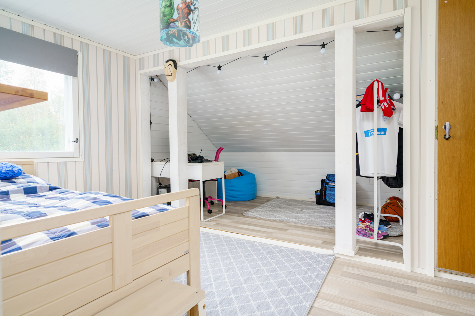 Alakerran makuuhuoneessa ja keittiössä haltex-levy, muuaalla puupaneelia. |