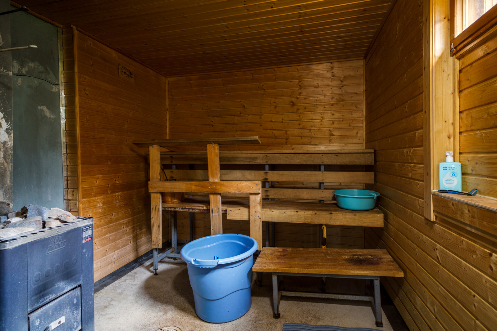 Seinät (kivi ja puu), lattiat (betoni), Puukiuas, Sauna piharakennuksessa |