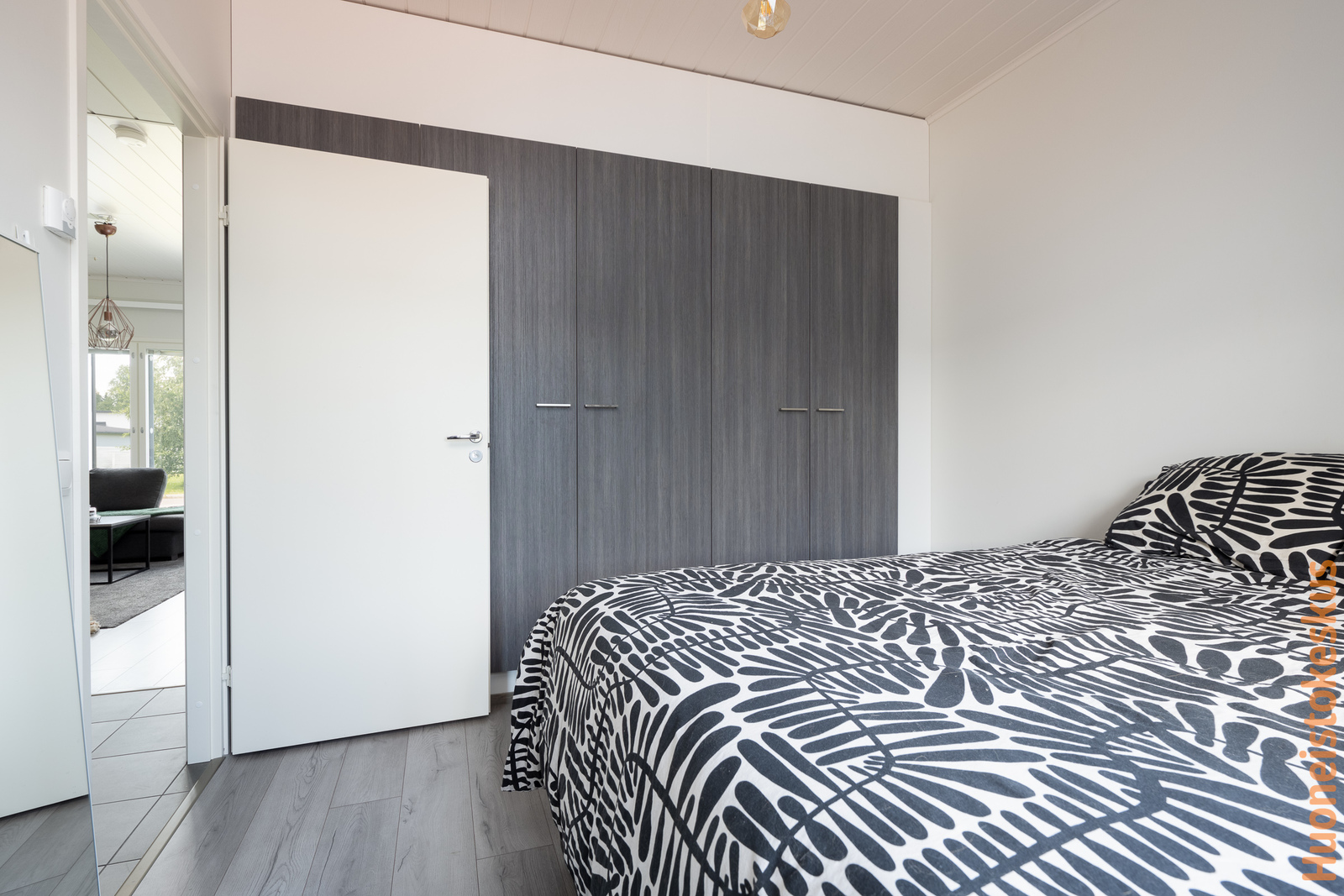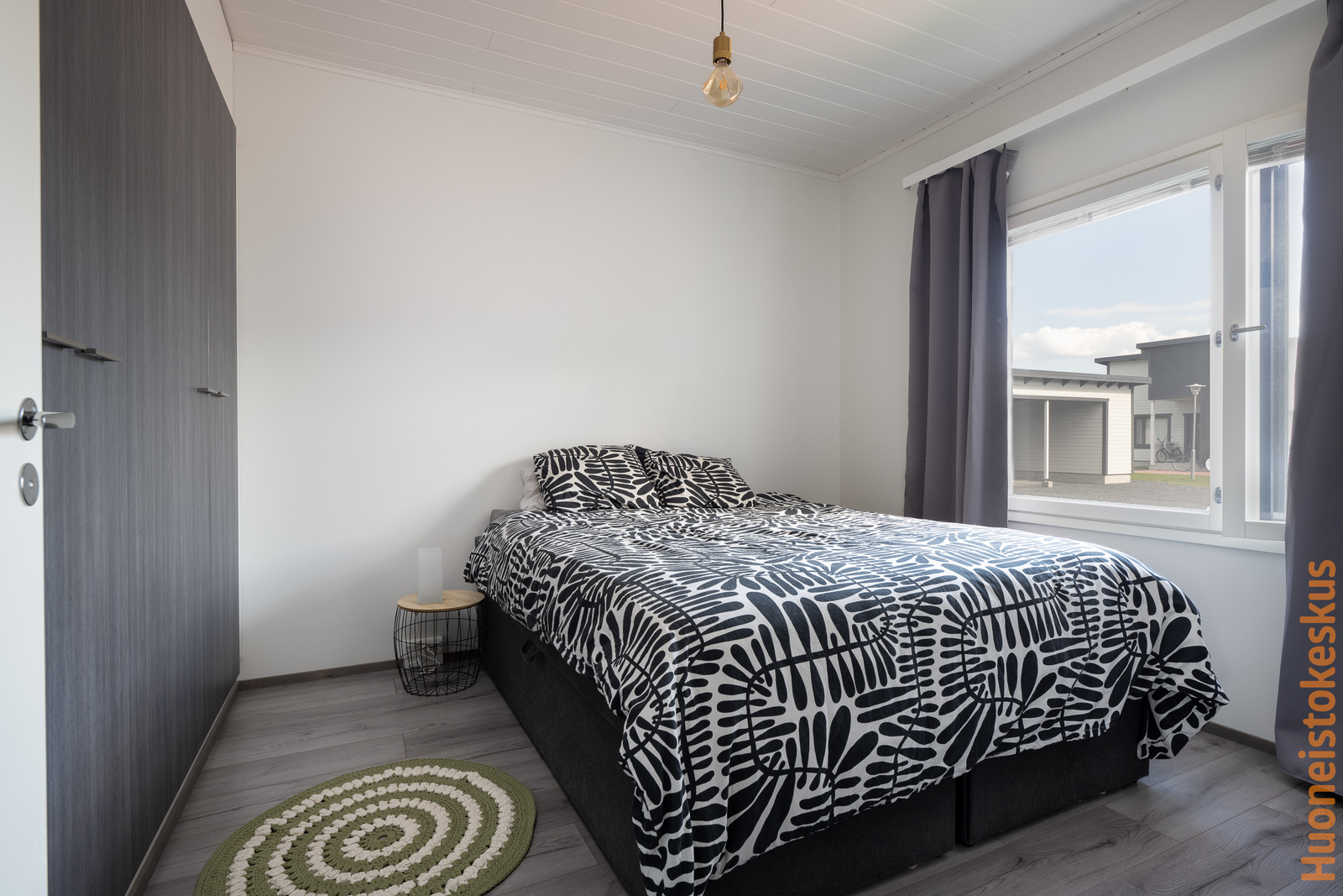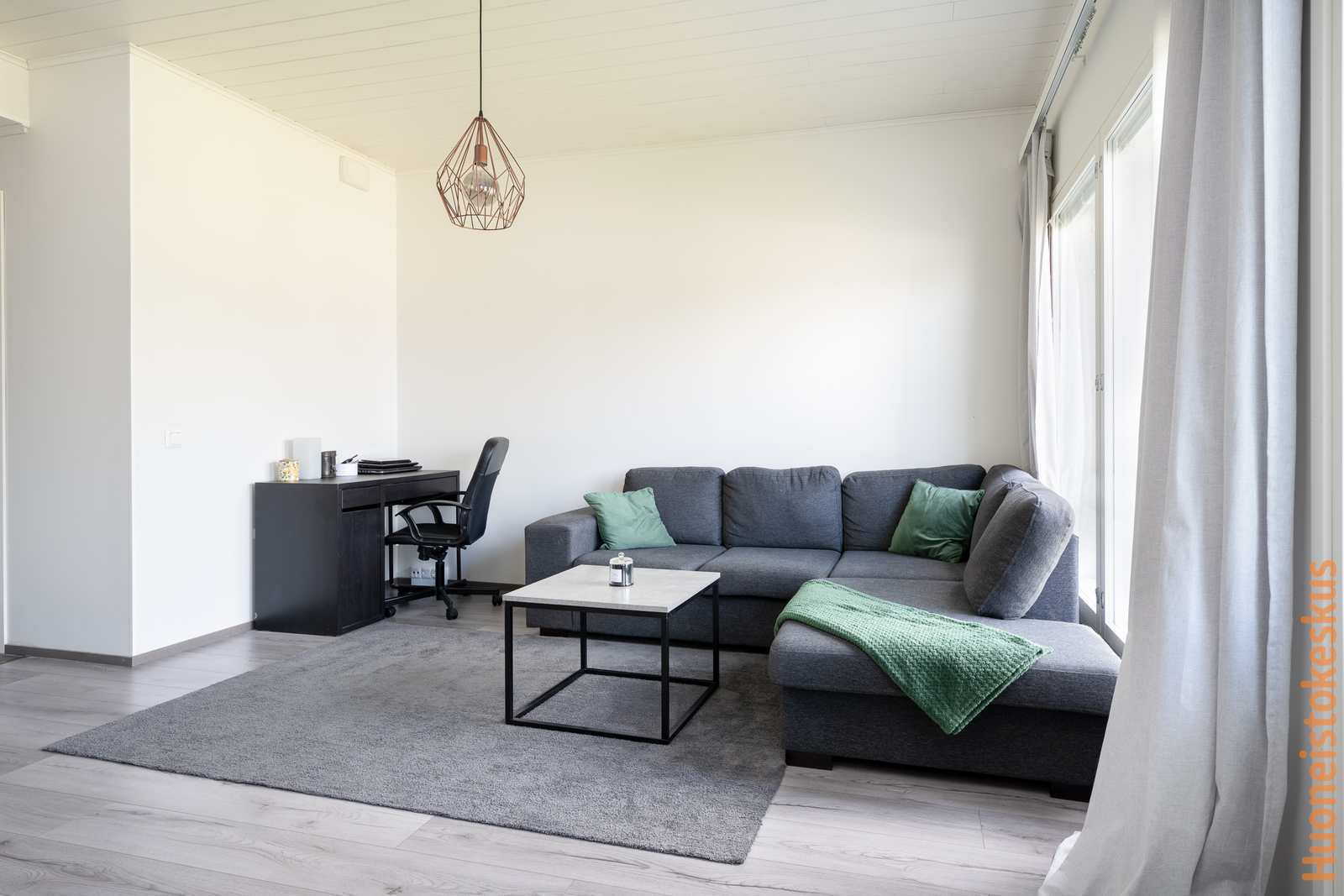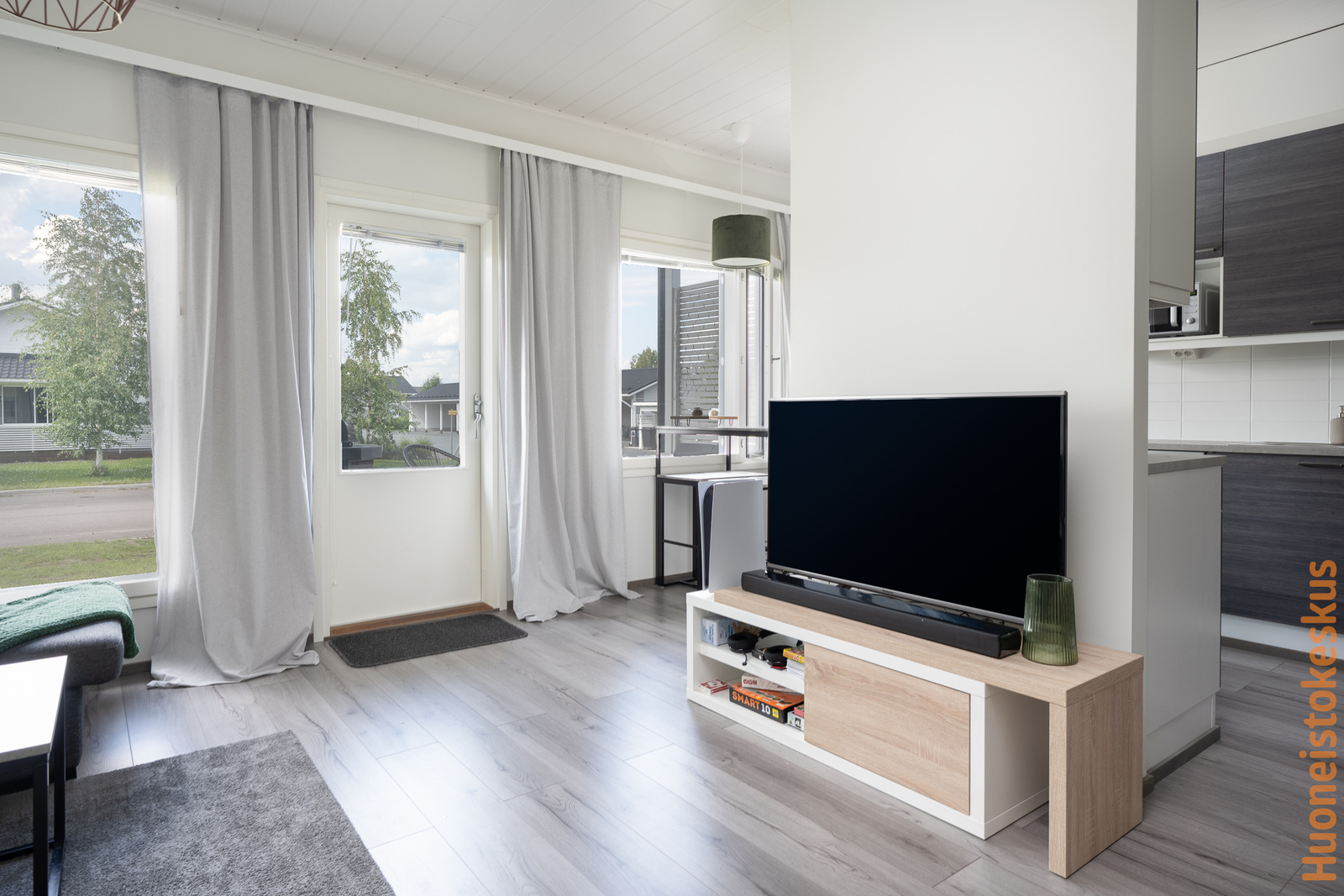 Tässä kodissa on harmoninen värimaailma läpi huoneiston. Lattiat ovat laminaattia/laattaa ja seinät on maalattu. Keittiössä on nykyaikainen varustetaso ja hyvin kaappi- ja laskutilaa. Säilytystilaa on makuuhuoneen kaapistoissa ja sisäänkäynnin vieressä olevassa varastossa. Oleskelupiha on länsiauringon puolella ja olohuoneesta on käynti katetulle terassille.