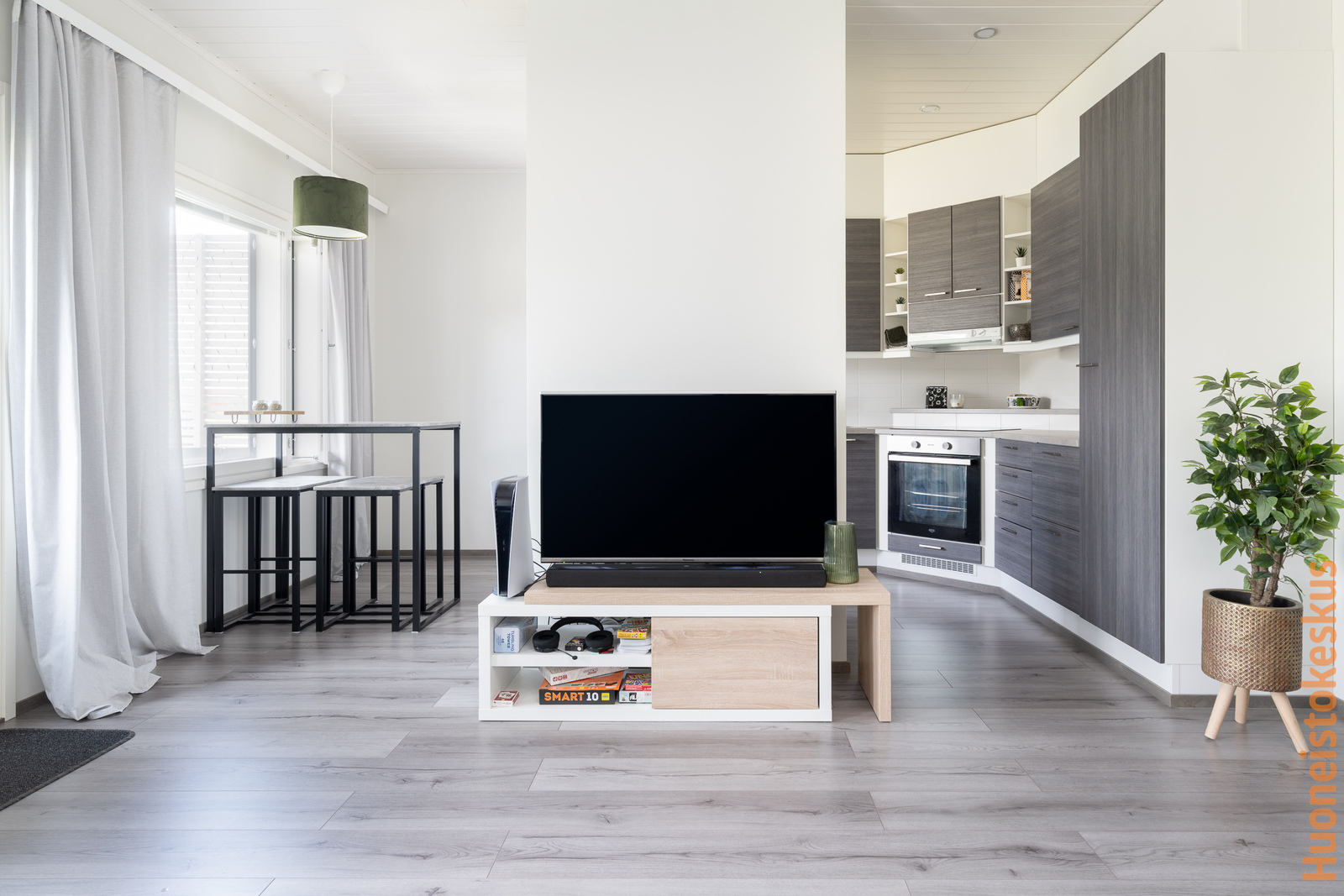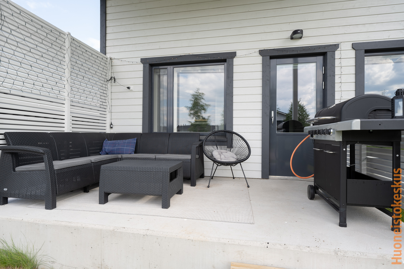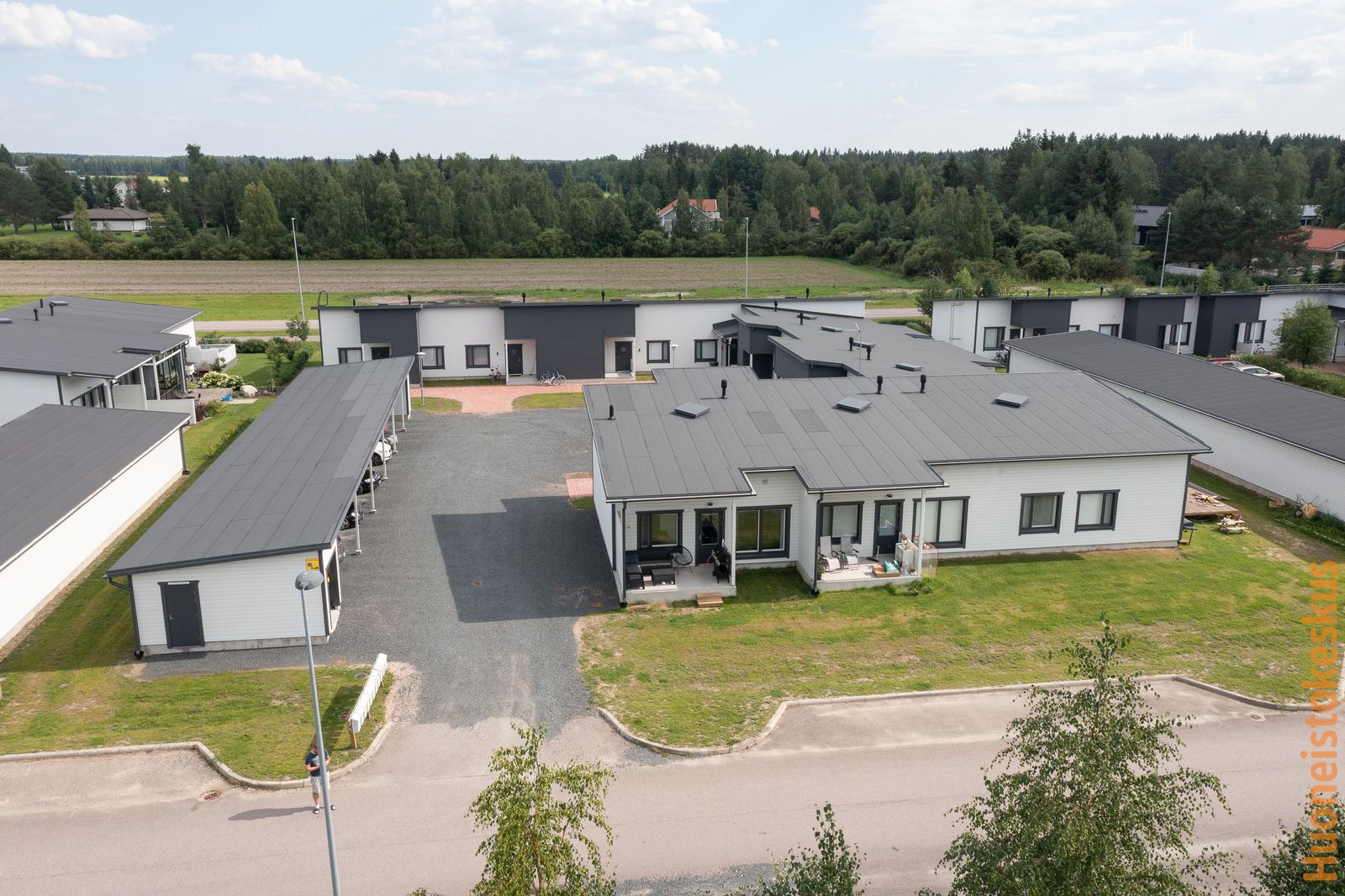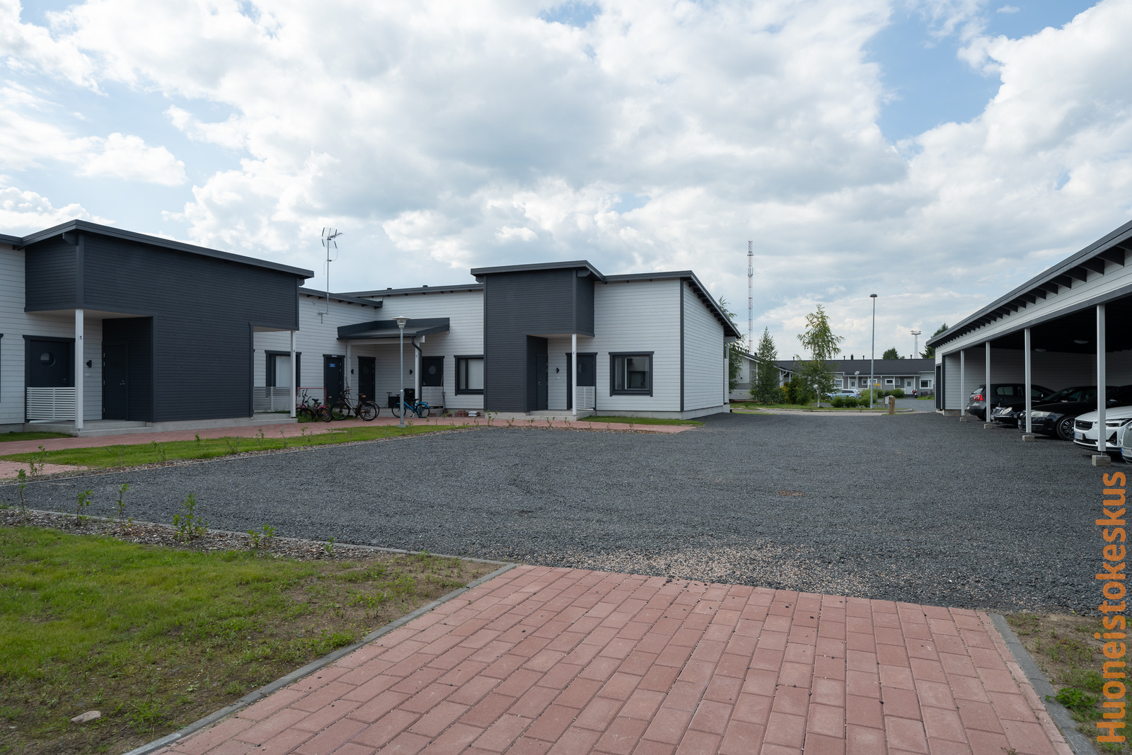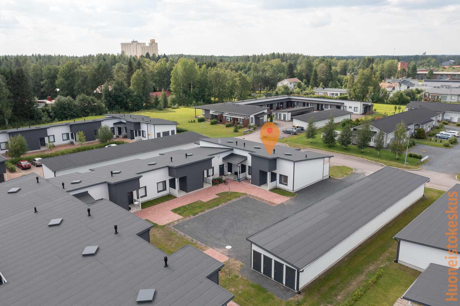 Tässä kodissa on harmoninen värimaailma läpi huoneiston. Lattiat ovat laminaattia/laattaa ja seinät on maalattu. Keittiössä on nykyaikainen varustetaso ja hyvin kaappi- ja laskutilaa. Säilytystilaa on makuuhuoneen kaapistoissa ja sisäänkäynnin vieressä olevassa varastossa. Oleskelupiha on länsiauringon puolella ja olohuoneesta on käynti katetulle terassille.