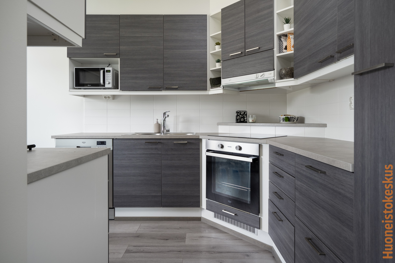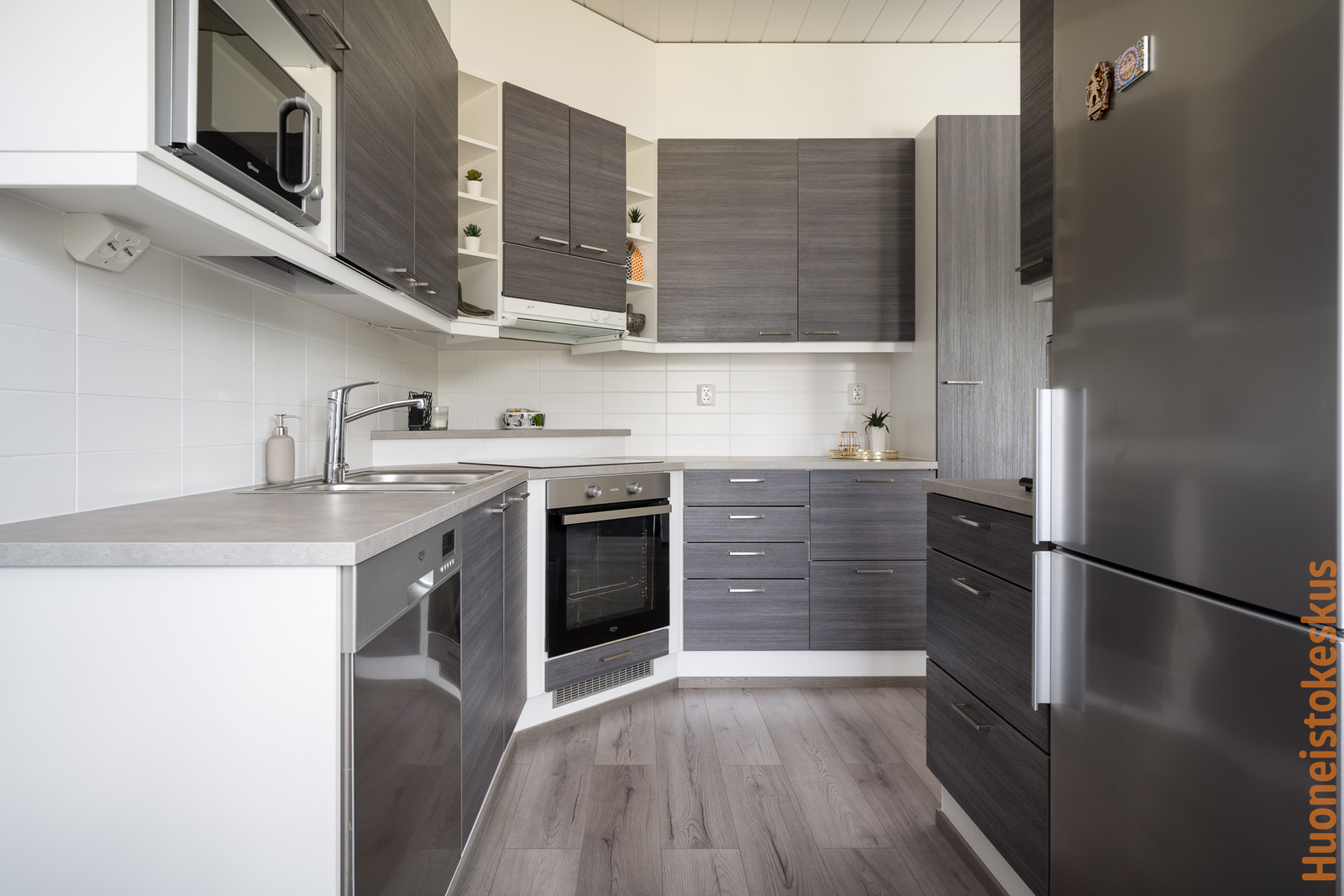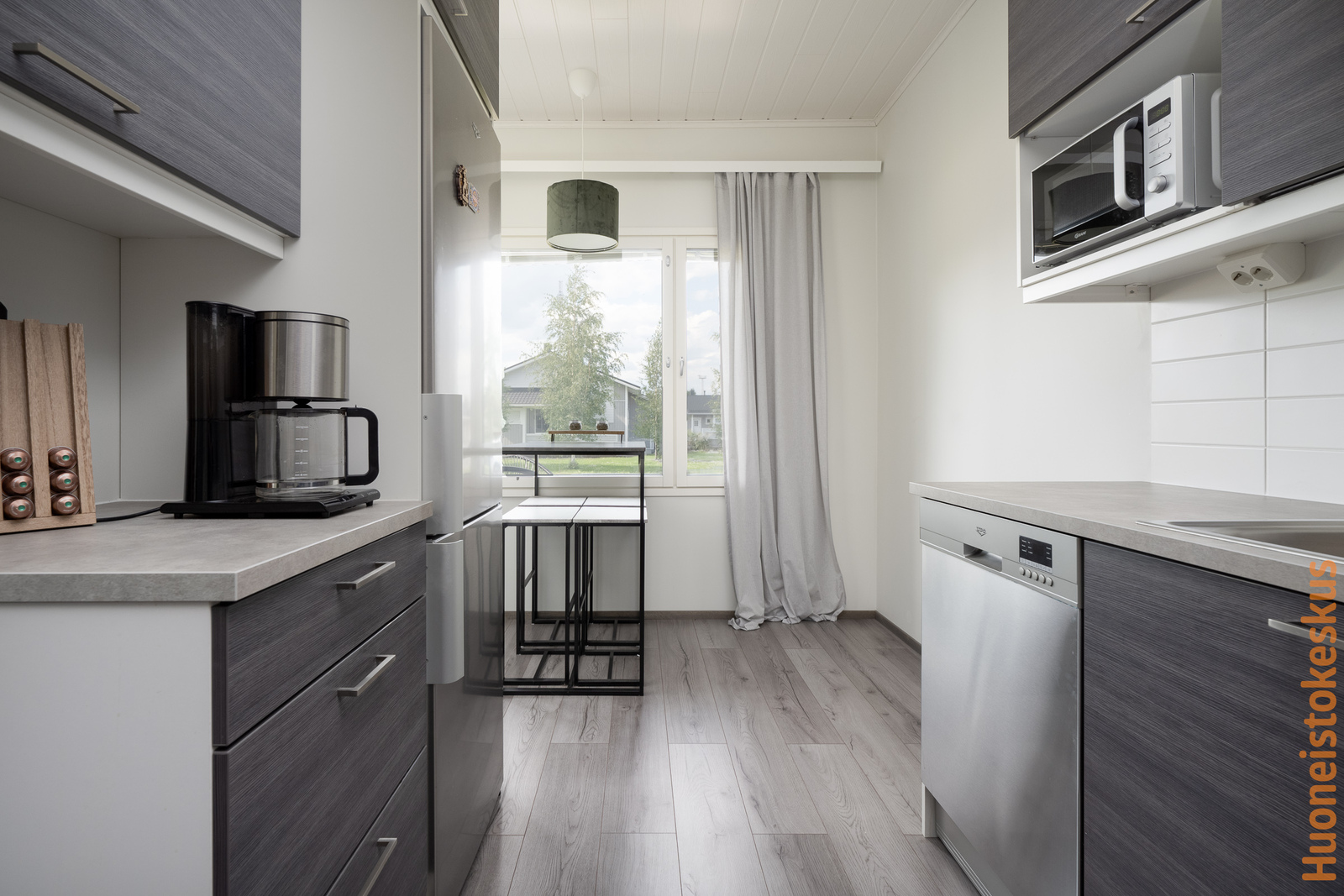 | Keittiön kuvaus | Liesi (Induktioliesi), työtasot (laminaatti), seinät (maali), lattiat (laminaatti), erillisuuni, jääkaappipakastin, liesituuletin, astianpesukone ja kiinteät valaisimet |