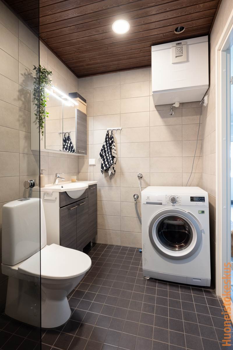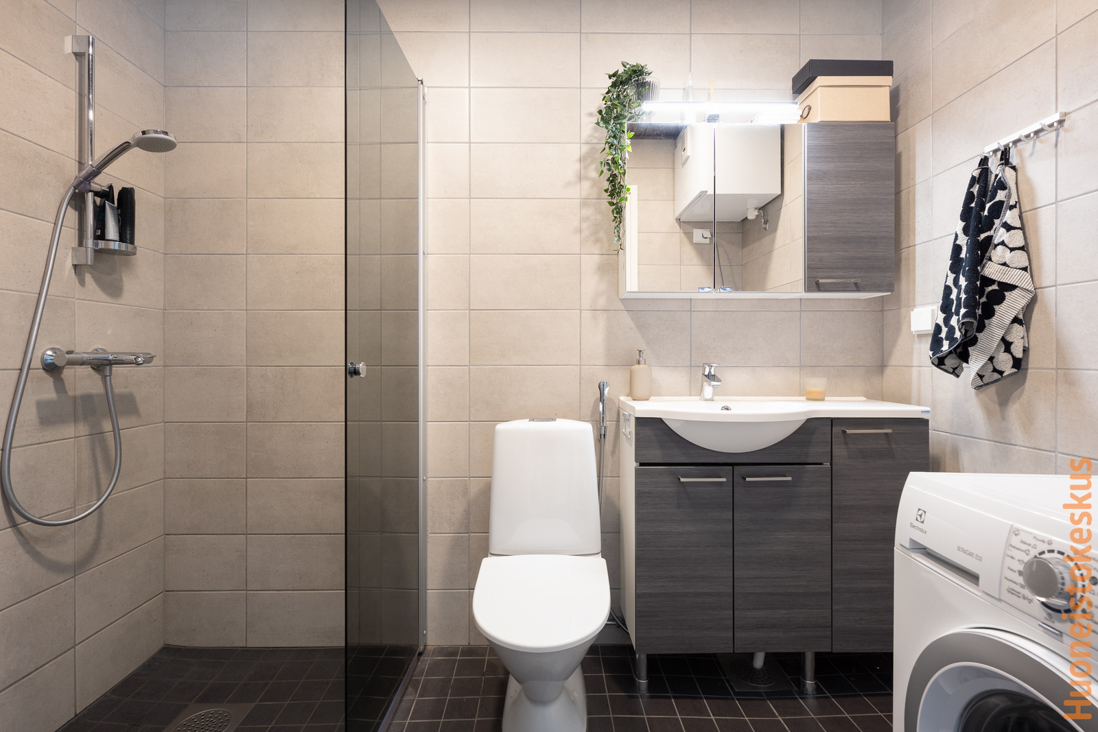 | Kylpyhuoneen kuvaus | Suihku, allaskaappi, lattialämmitys, suihkuseinä, wc-istuin, peilikaappi, pesukoneliitäntä, bidee-suihku ja kiinteät valaisimet, seinät (kaakeli), lattiat (laatta) |