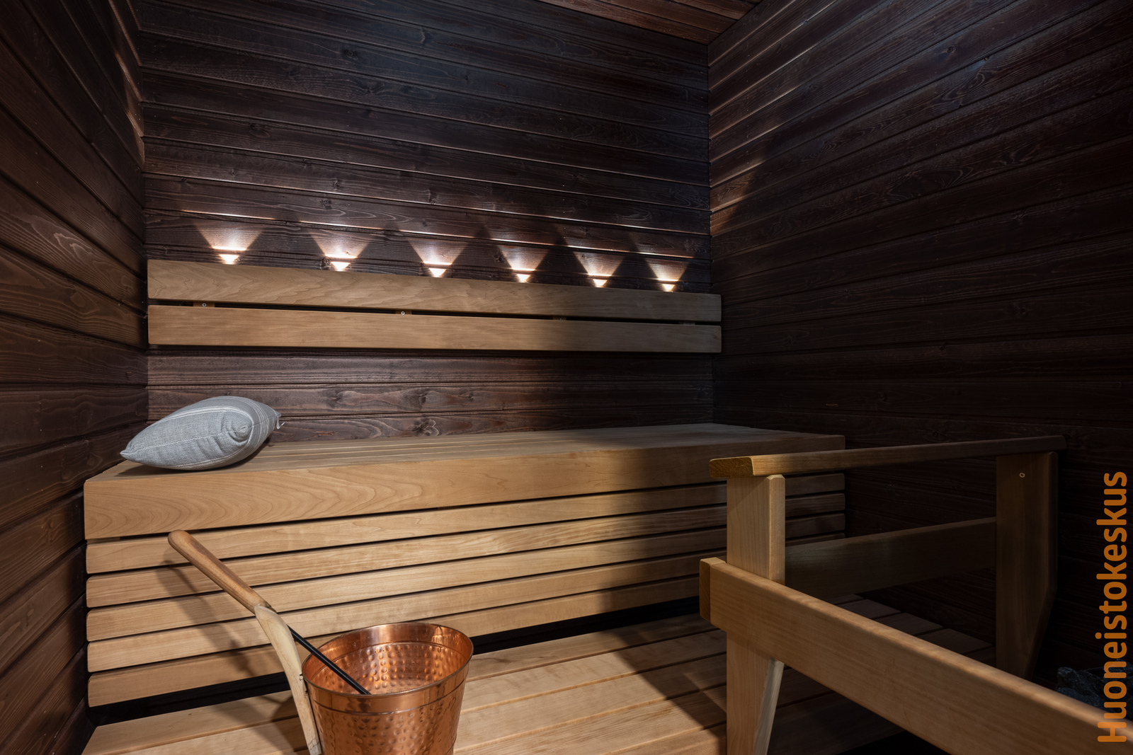 | Saunan kuvaus | Seinät (paneeli), lattiat (laatta), Sähkökiuas |