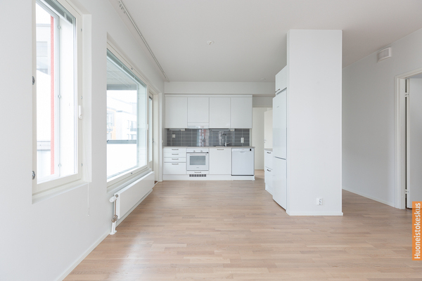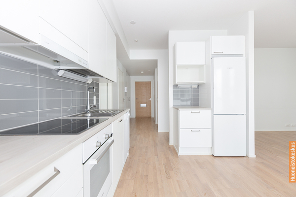 Liesi (Keraaminen liesi ja erillisuuni), työtasot (laminaatti), seinät (maali), lattiat (parketti), erillisuuni, liesituuletin, jääkaappipakastin, astianpesukone ja kiinteät valaisimet |