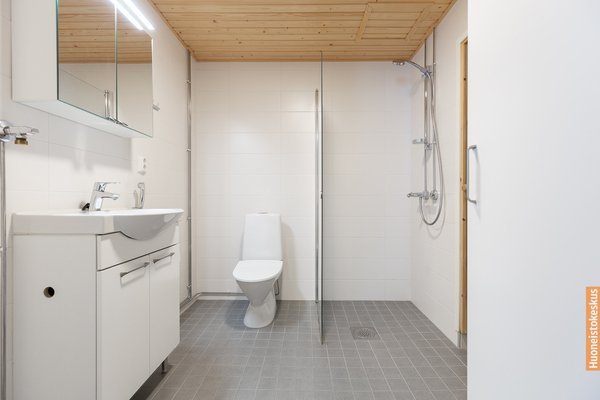 Suihku, wc-istuin, peilikaappi, pesukoneliitäntä, suihkuseinä ja allaskaappi, seinät (kaakeli), lattiat (laatta) |