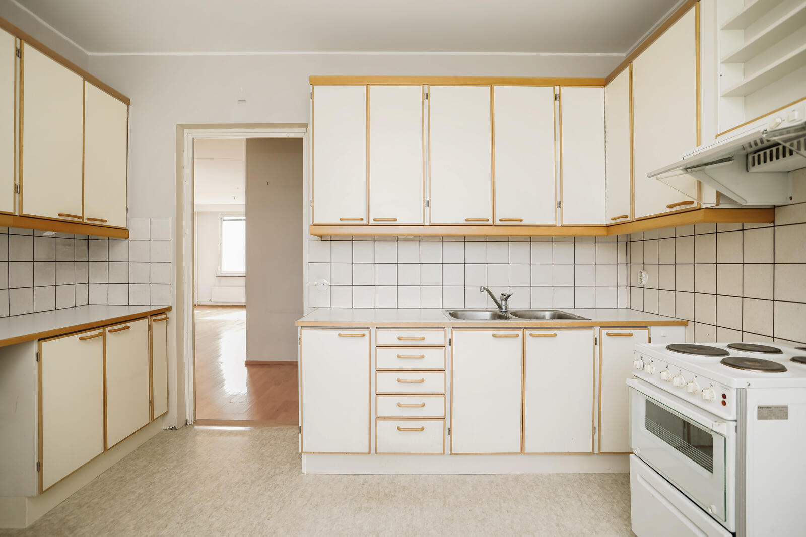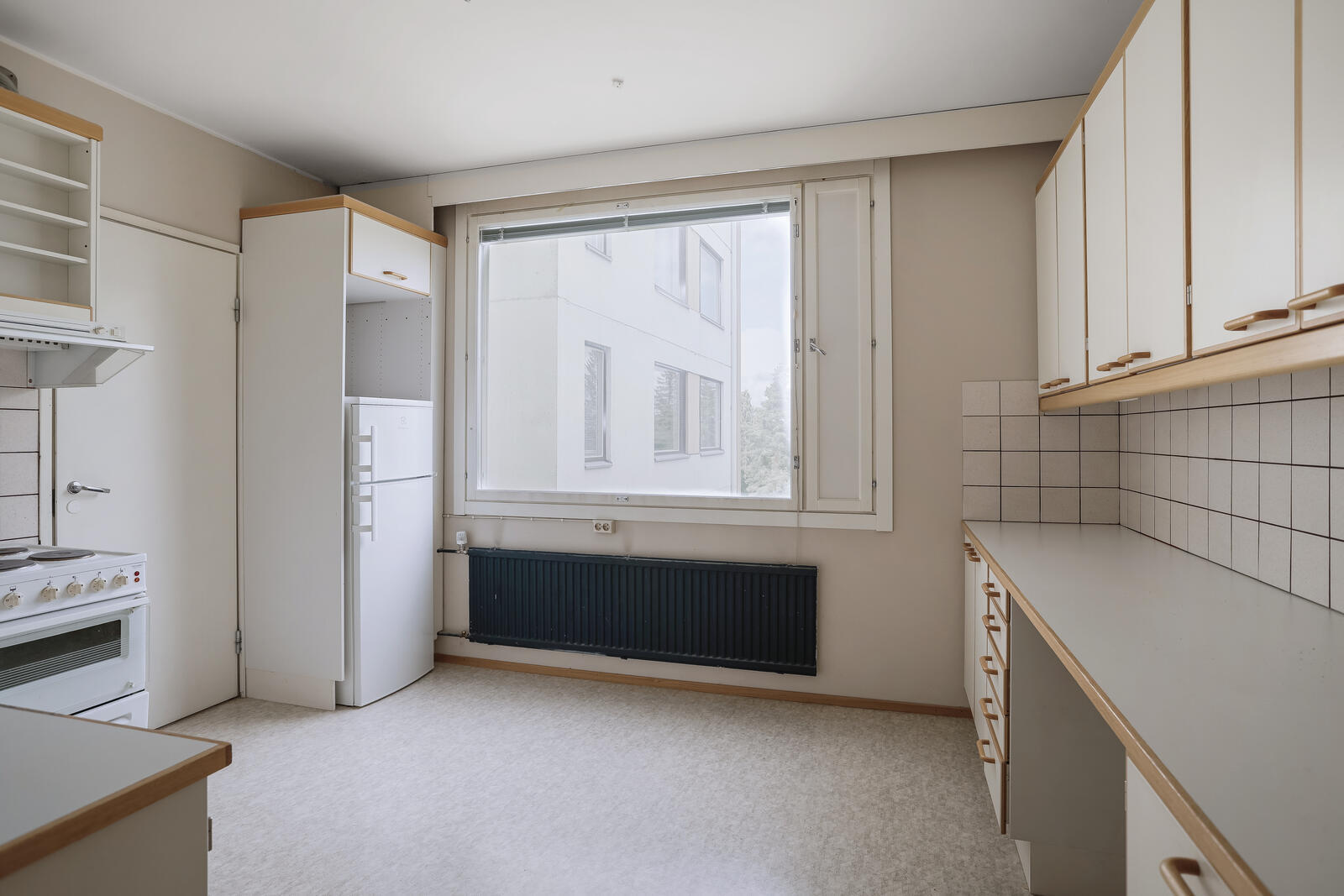 | Keittiön kuvaus | Liesi (sähköliesi), seinät (laatta ja maali), lattiat (muovimatto), liesi, liesituuletin, jenkkikaappi ja kiinteät valaisimet |