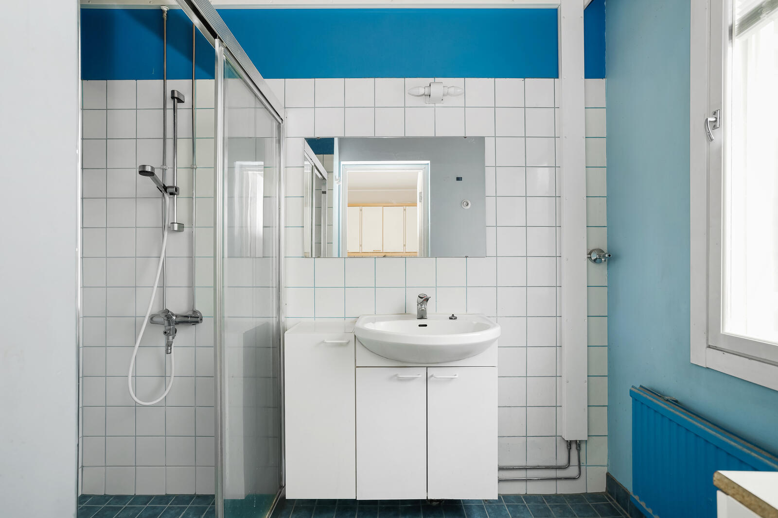 | Kylpyhuoneen kuvaus | Suihkukaappi, pesukoneliitäntä ja kiinteät valaisimet, seinät (maali), lattiat (laatta), Uusittu taloyhtiön toimesta vuosina 2003-2008. |