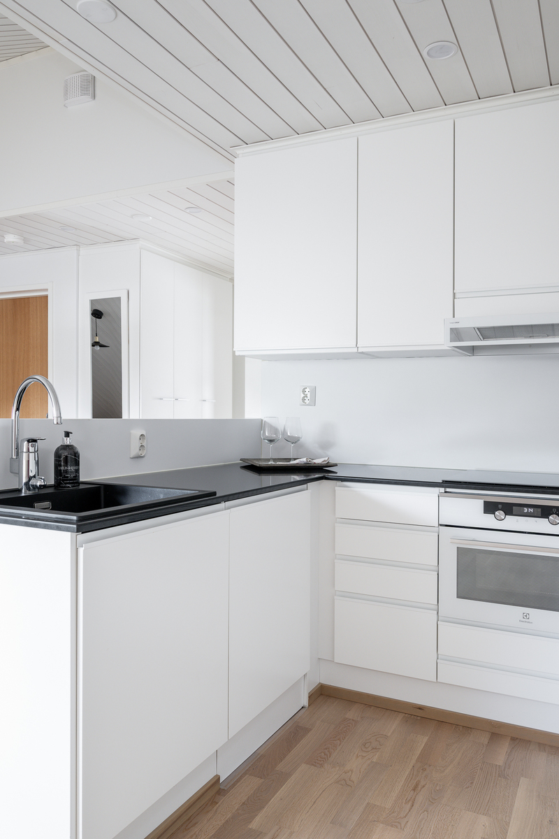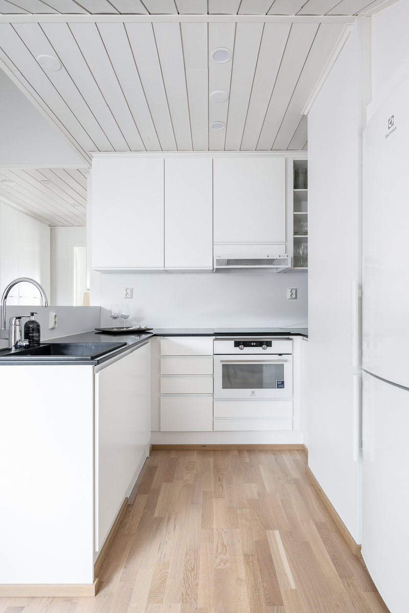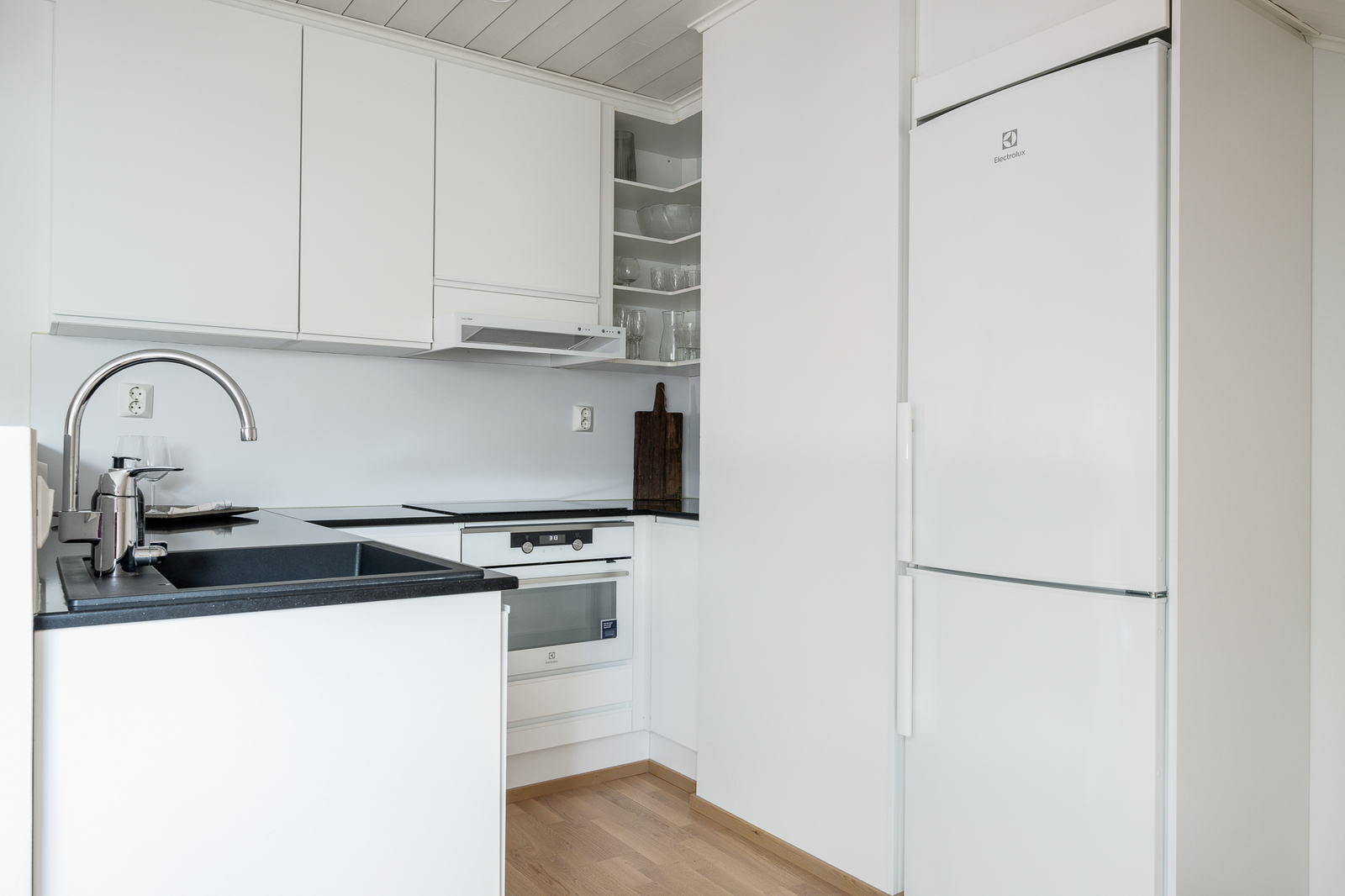 | Keittiön kuvaus | Liesi (Induktioliesi ja muu), työtasot (laminaatti), seinät (maali), lattiat (parketti), liesi, jääkaappipakastin, astianpesukone, liesituuletin ja kiinteät valaisimet |