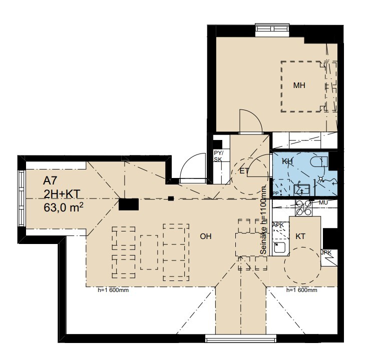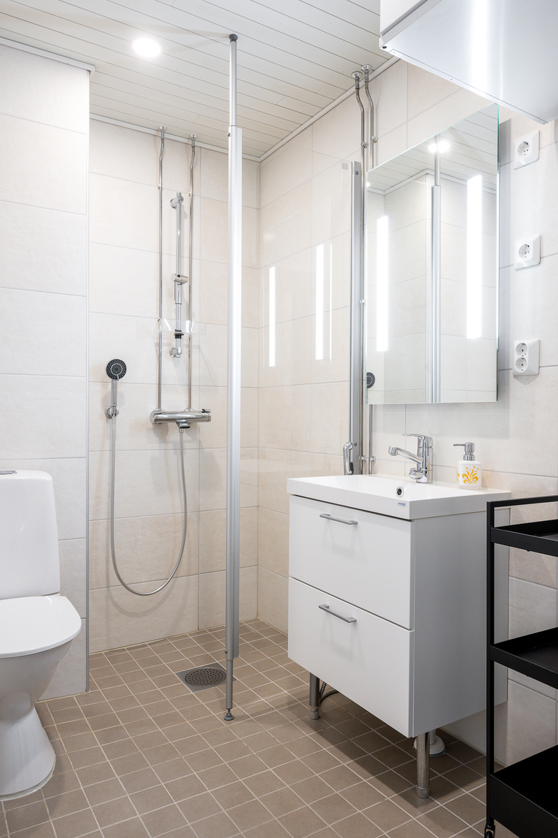 | Kylpyhuoneen kuvaus | WC-istuin, lattialämmitys, allaskaappi, peili, suihkuseinä, pesukoneliitäntä, suihku ja kiinteät valaisimet, seinät (kaakeli), lattiat (laatta) |