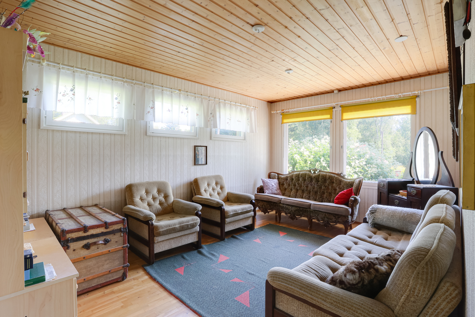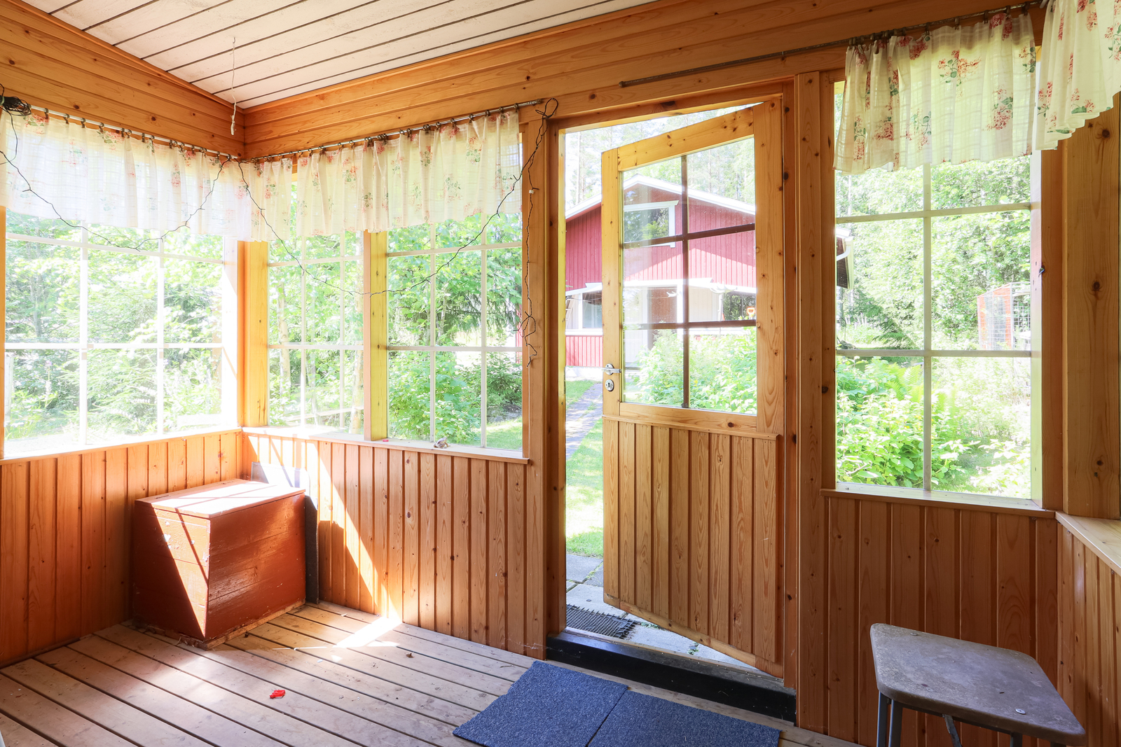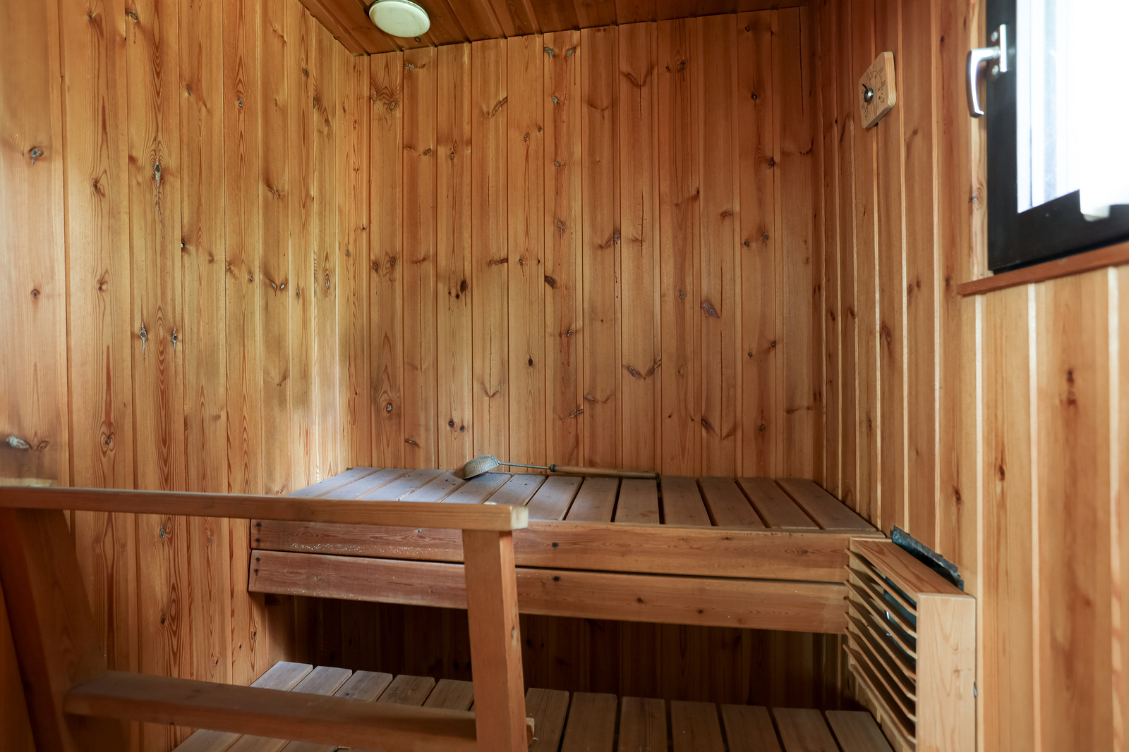 Seinät (puu), lattiat (laatta), Sähkökiuas, Laatoitettu lattia. Paneloidut seinät ja katot. |