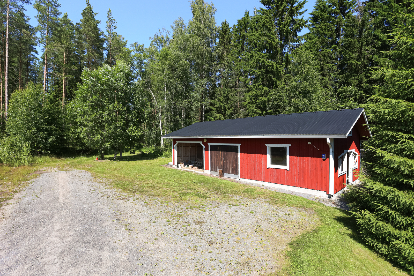 Tilavahko ulkorakennus, jossa tilava autokatos sekä erillisiä varastohuoneita.