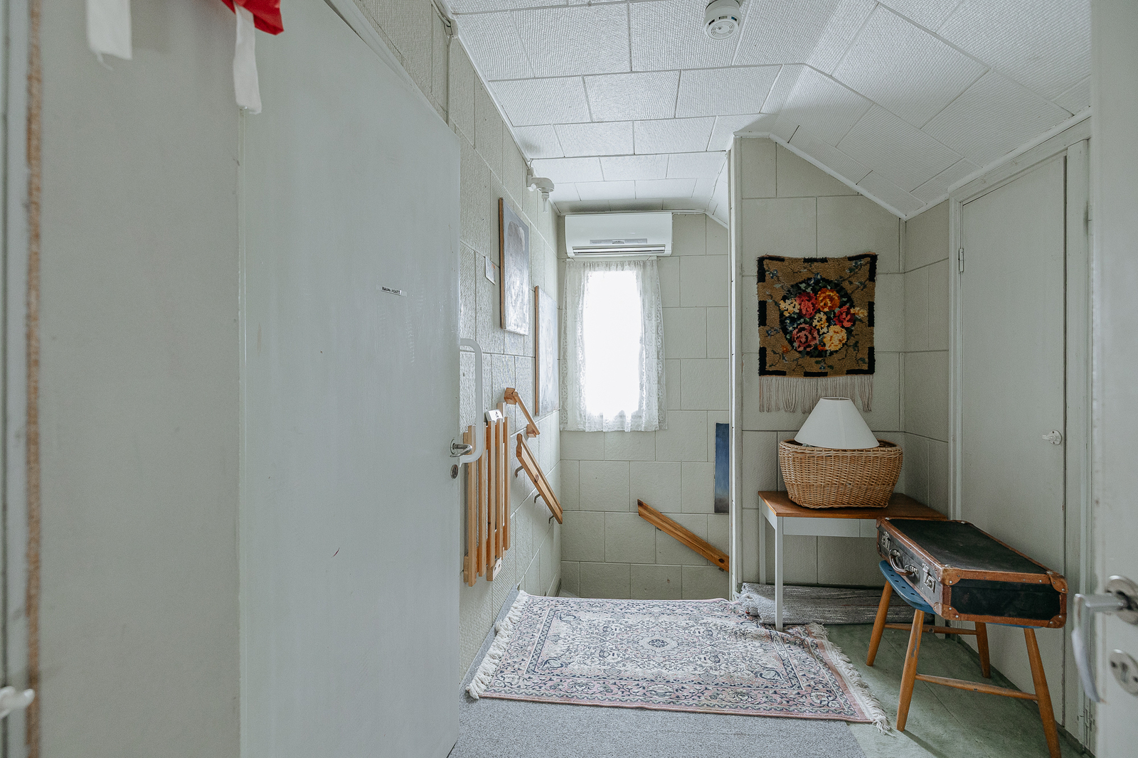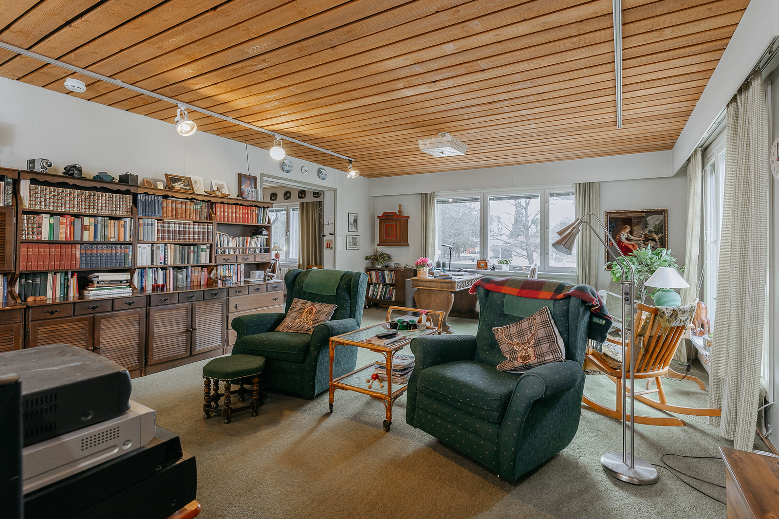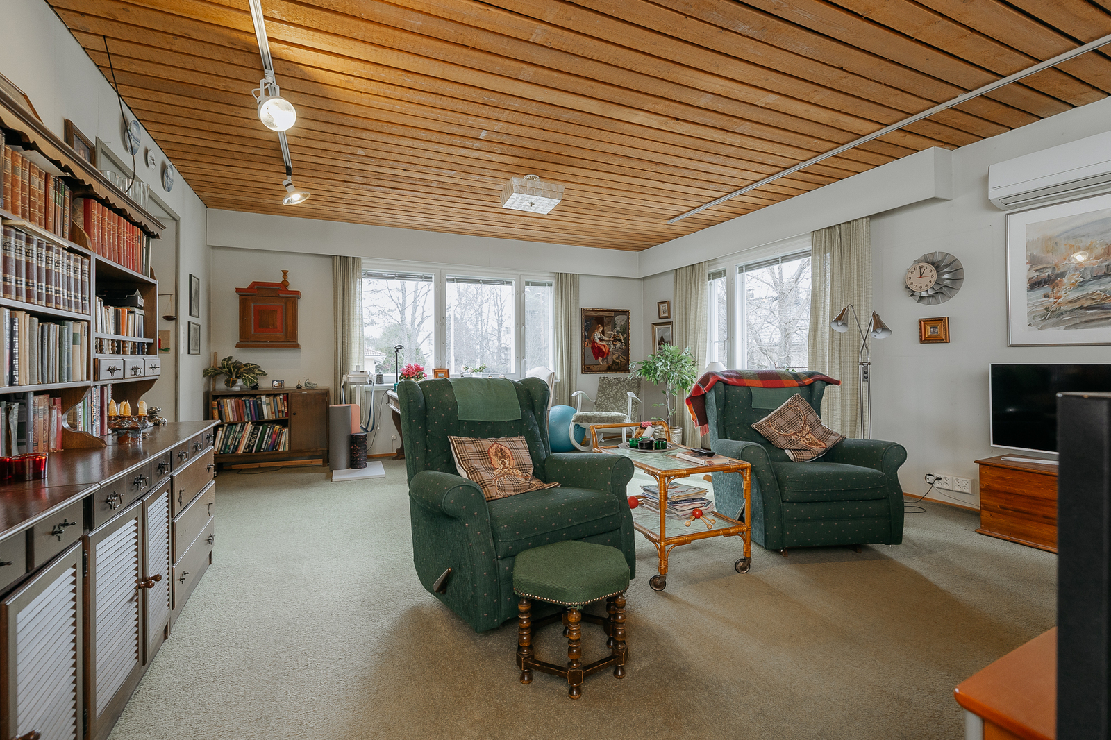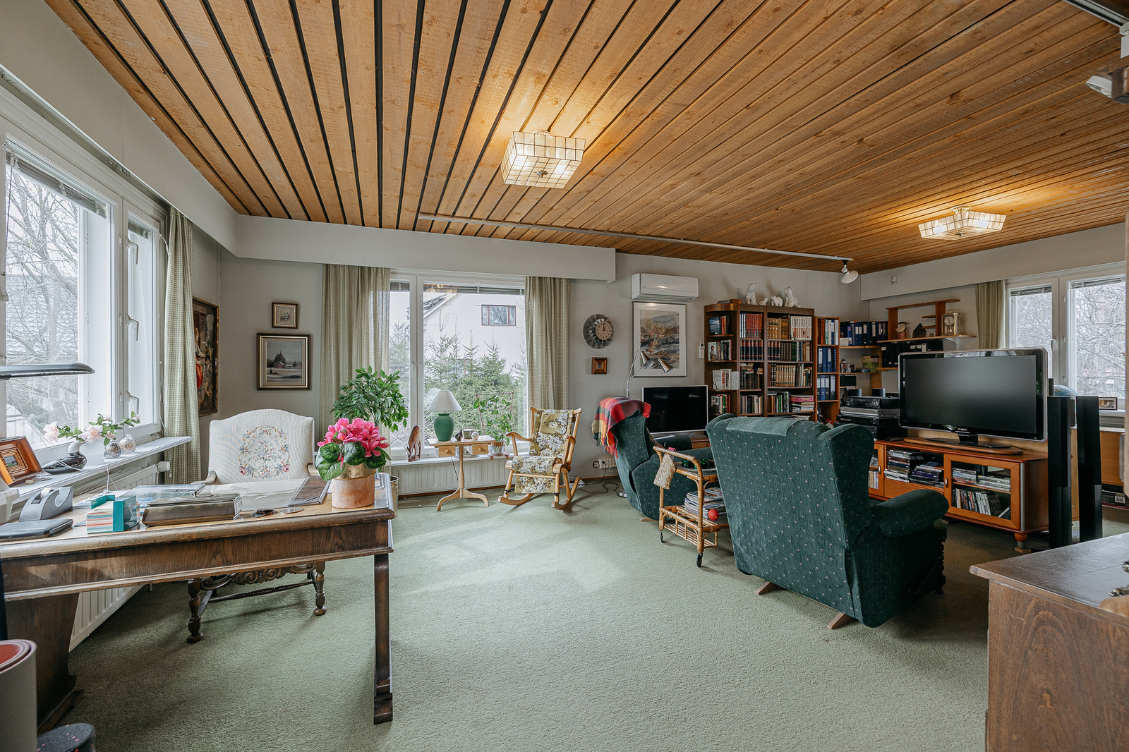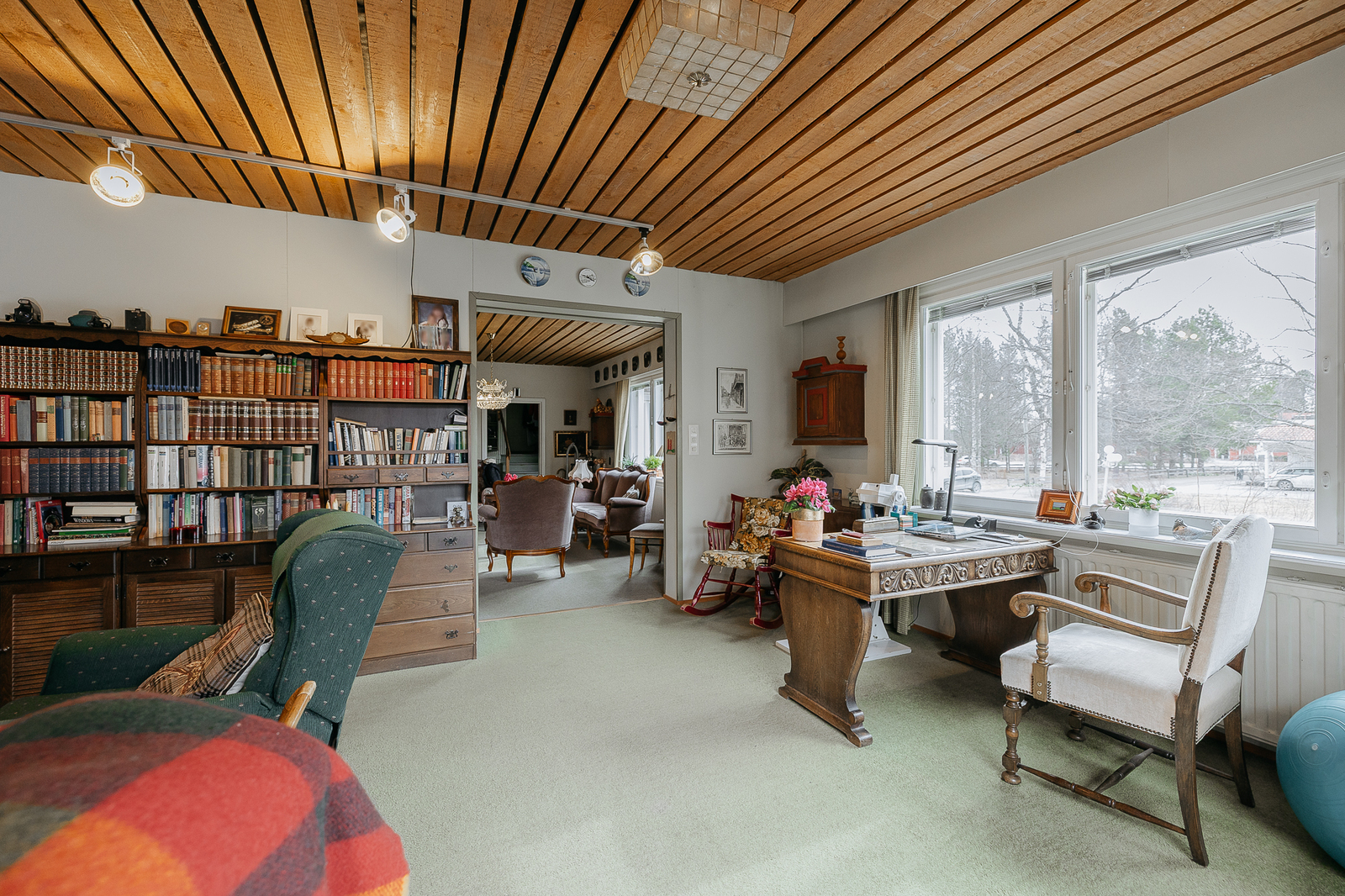 | Tilojen kuvaus | Kirjasto/tv-huoneessa kokolattiamatto, seinät maalattu ja katossa puupaneeli. Todella ison Kirjasto/tv-huoneen pystyisi tarvittaessa jakamaan kahdeksi eri huoneeksi. Eteisessä kokolattiamatto, seinillä sormipaneelin tapainen puupaneeli ja katossa Halltex-levyä. Iso lämmin kellari/työtila omalla sisäänkäynnillä sekä lämmin varastohuone. |