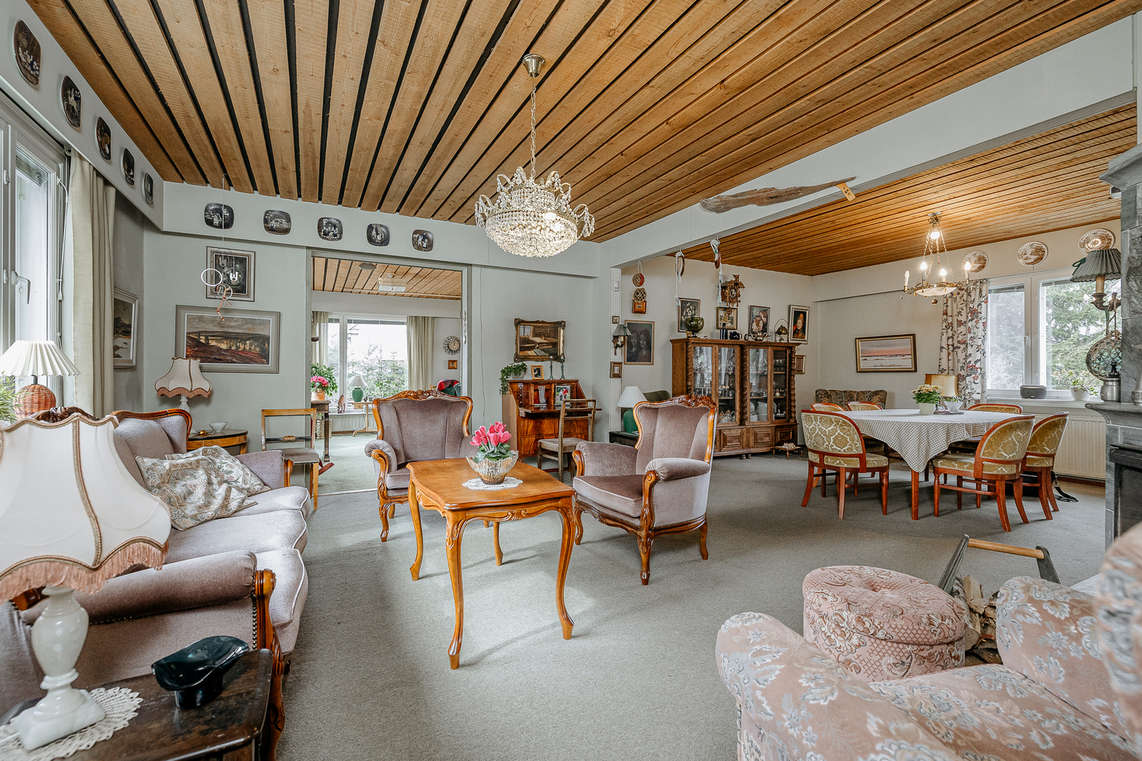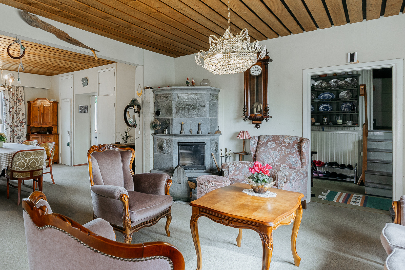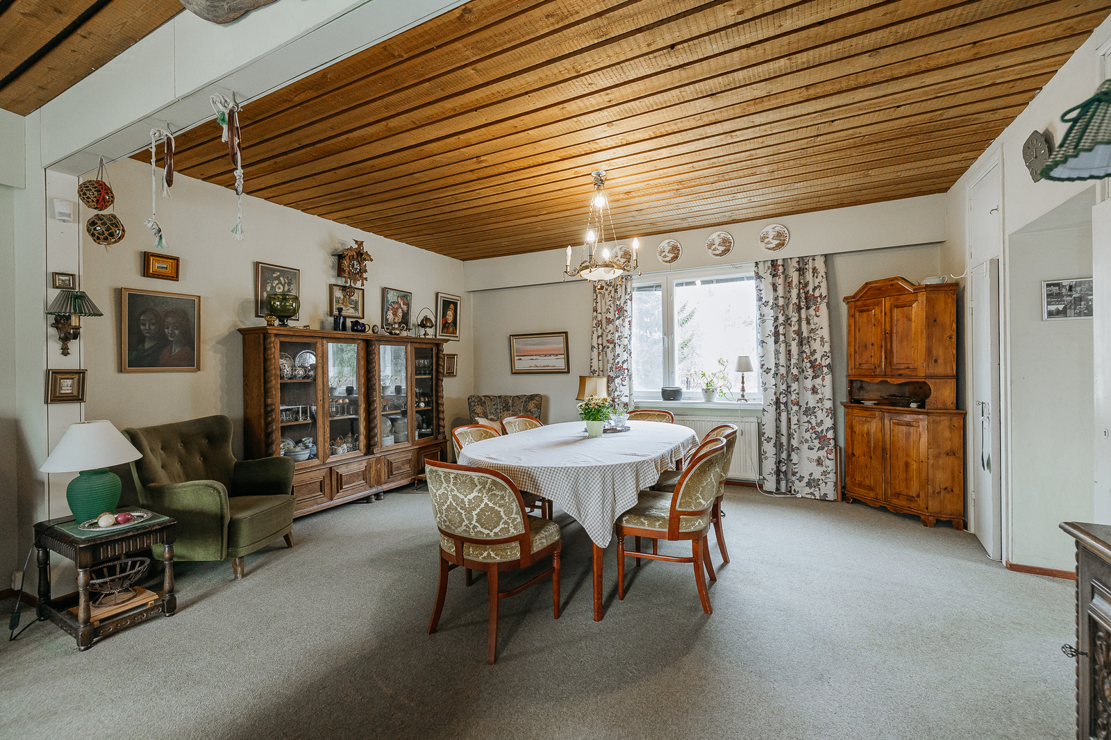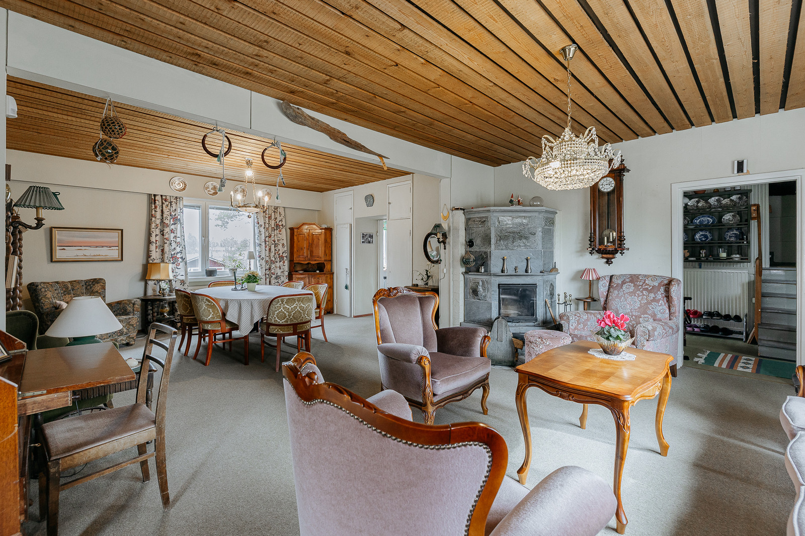 | Olohuoneen kuvaus | Seinät (tapetti), Olohuoneessa kokolattiamatto, katossa puupaneeli. Todella reilunkokoinen olohuone, mihin mahtuu hyvin erillinen ruokailutila, Olohuoneen sydämenä toimii varaava vuolukivitakka. |