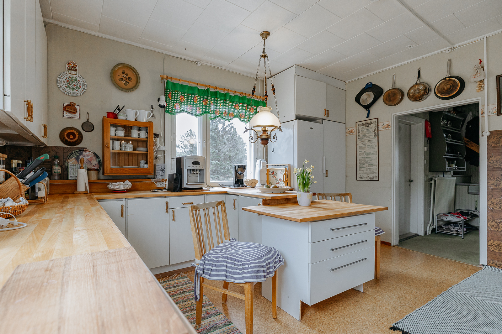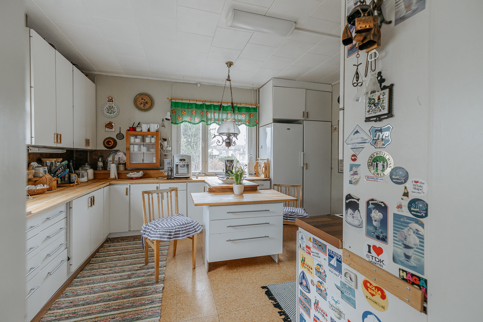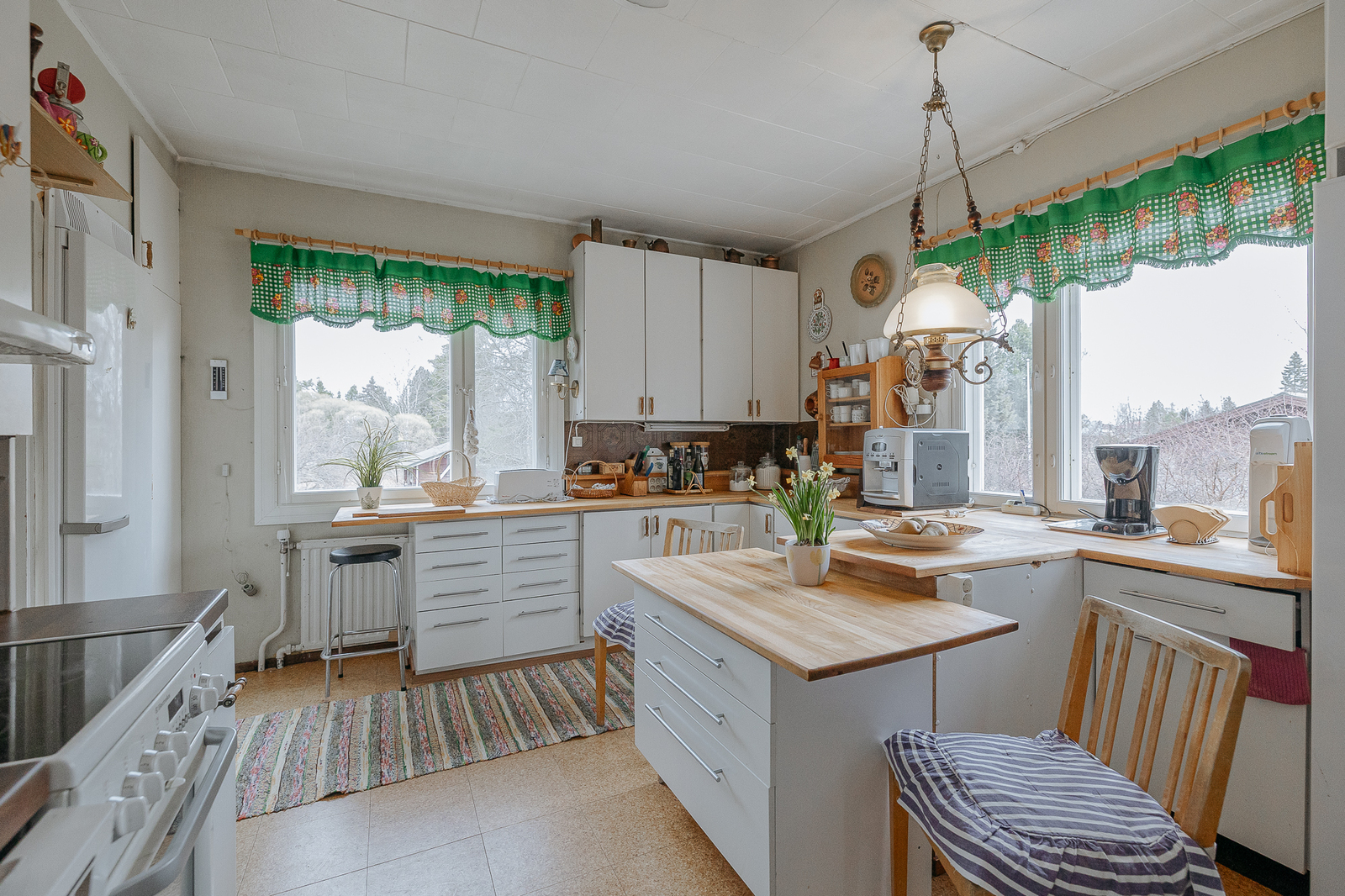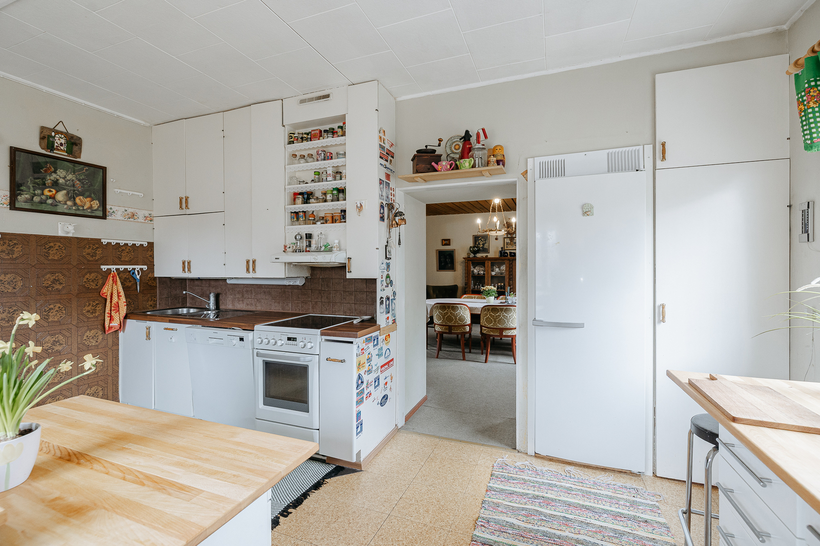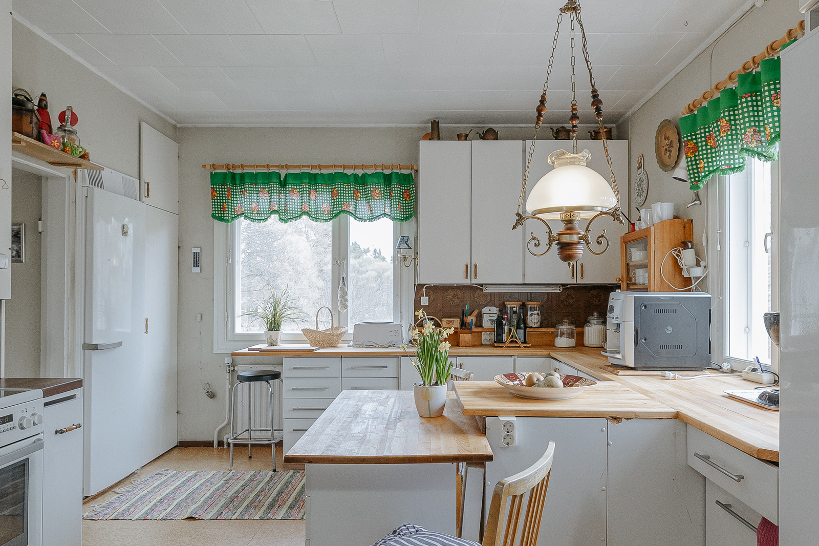 | Keittiön kuvaus | Liesi (Induktioliesi), työtasot (puu), seinät (maali), lattiat (korkki), liesi, astianpesukone, jääkaappi, erillinen pakastin ja kiinteät valaisimet, liesituuletin / hormi |