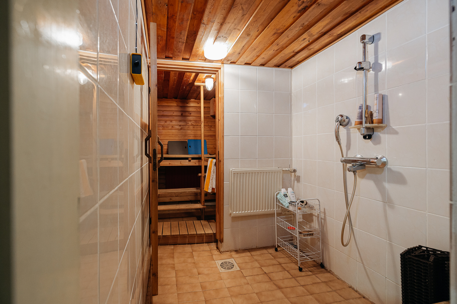 | Saunan kuvaus | Seinät (puu), lattiat (laatta), Heti valmis -sähkökiuas, Tilava sauna kellarissa. Katossa puupaneeli. |