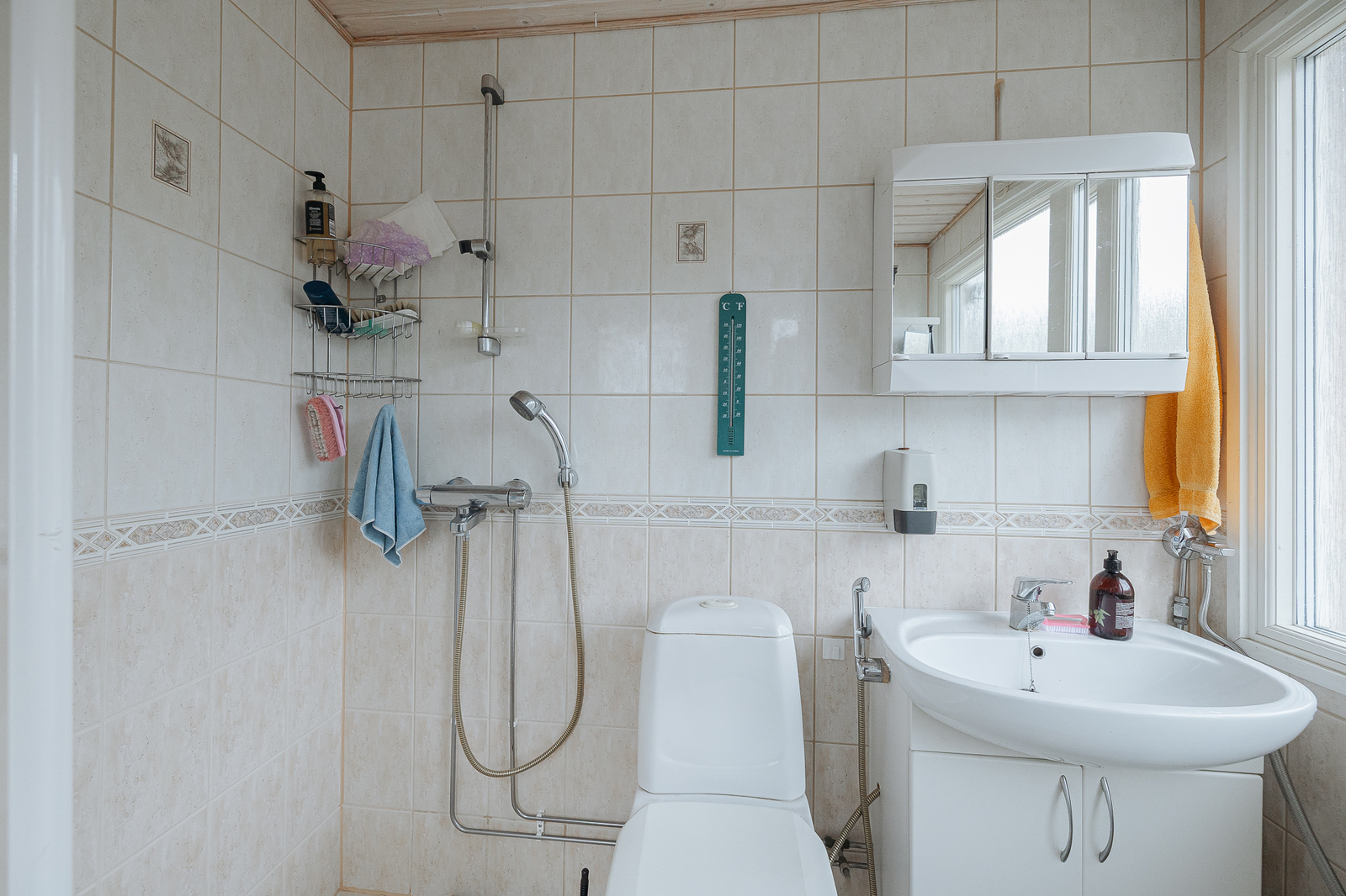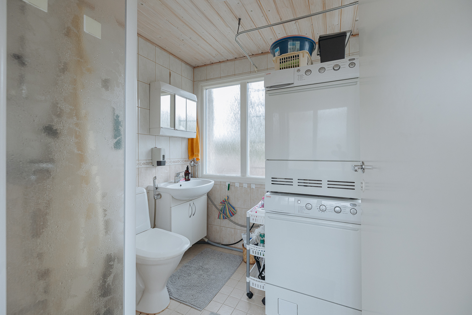 | Kylpyhuoneen kuvaus | Pesukoneliitäntä, lattialämmitys, suihkuseinä, peilikaappi, pesukone, kuivausrumpu, suihku, wc-istuin ja kiinteät valaisimet, seinät (kaakeli), lattiat (laatta) |