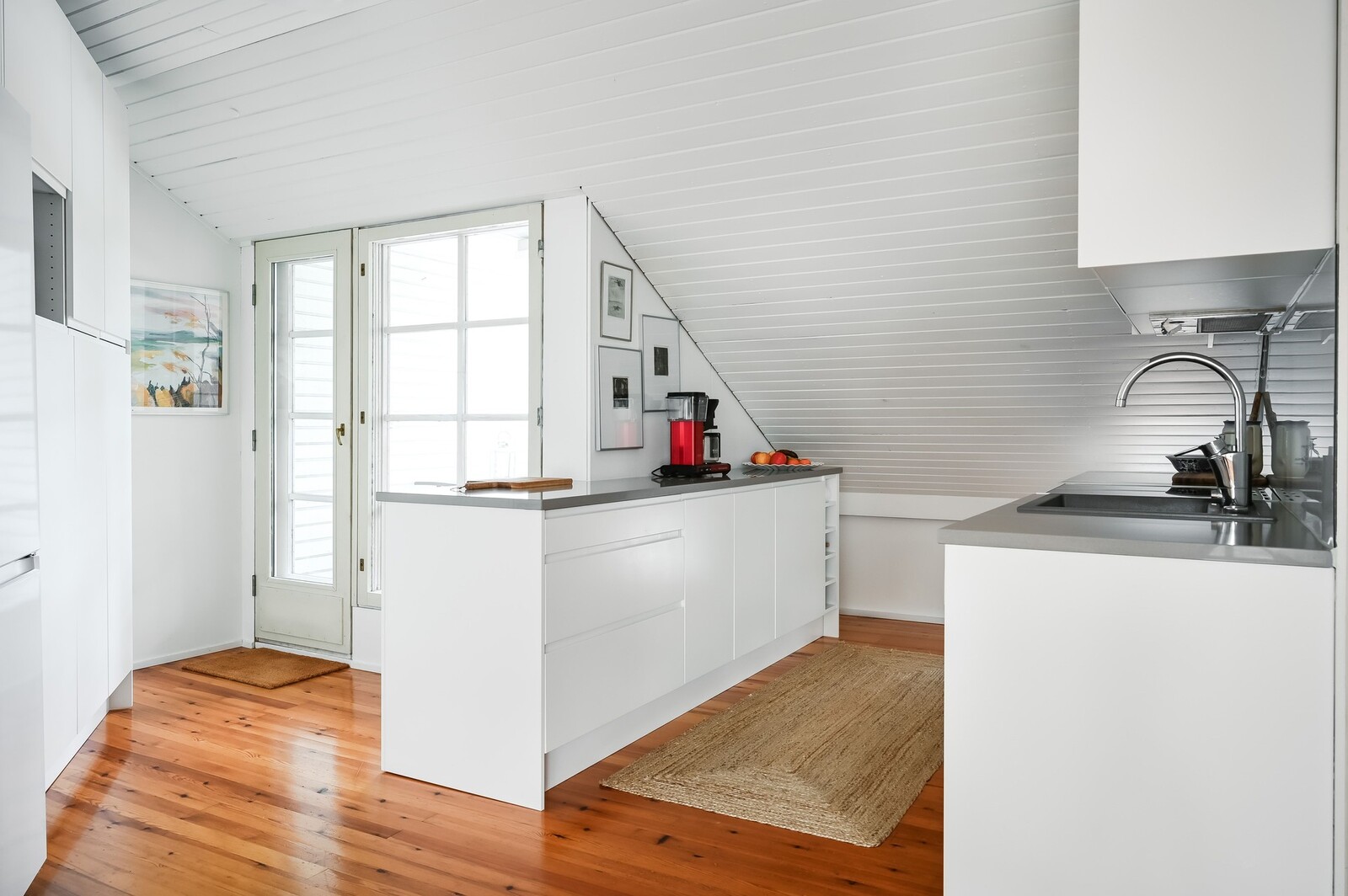 Yläkertaan valoa ja avaruutta tuo viistokatto, jossa kattoikkunat sekä parveke upeilla näkymillä.