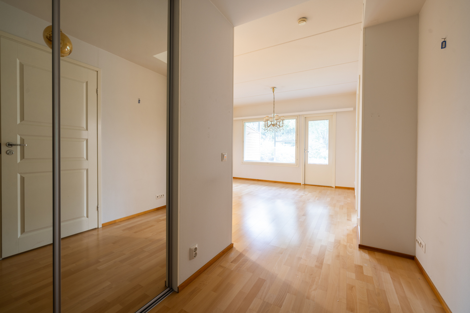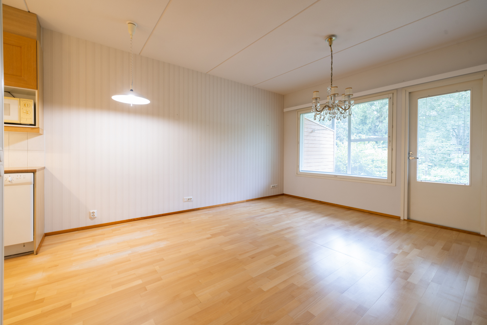 | Olohuoneen kuvaus | Seinät (tapetti), lattiat (parketti), Tilava olohuone. Olohuoneesta käynti terassille. Olohuoneen katto maalattu. |