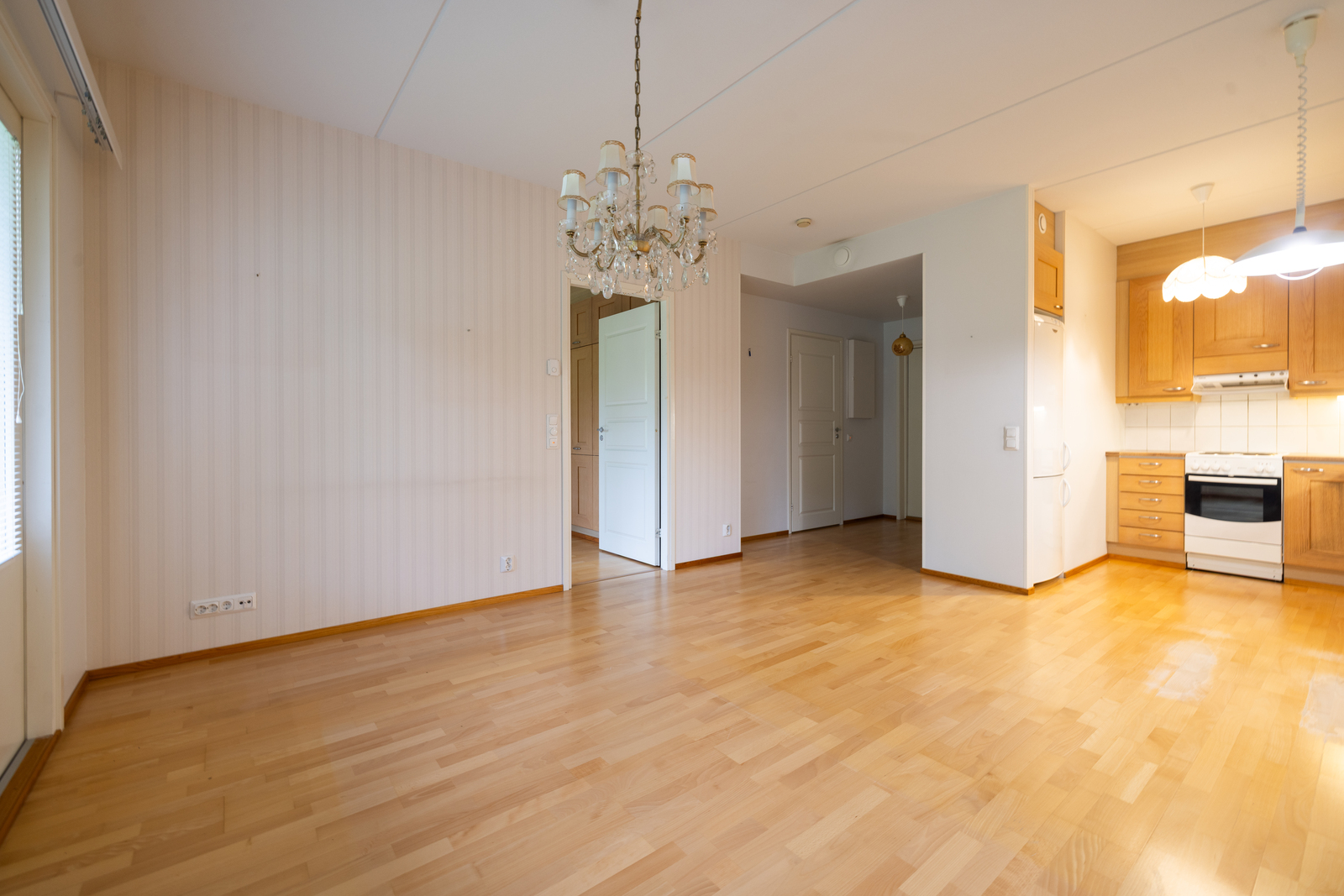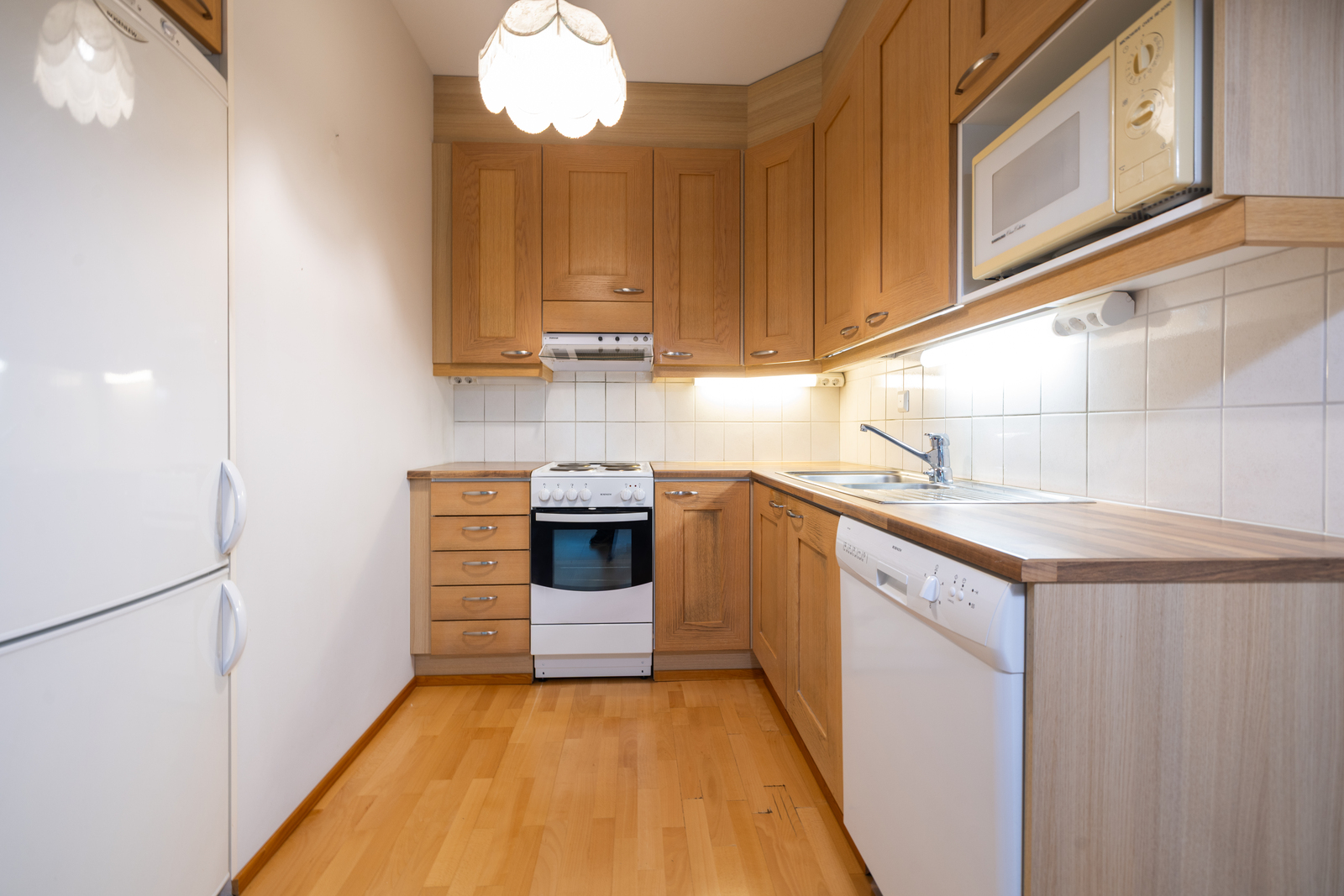 | Keittiön kuvaus | Liesi (sähköliesi), työtasot (laminaatti), seinät (maali ja laatta), lattiat (parketti), jääkaappipakastin, liesi, liesituuletin, astianpesukone ja kiinteät valaisimet |