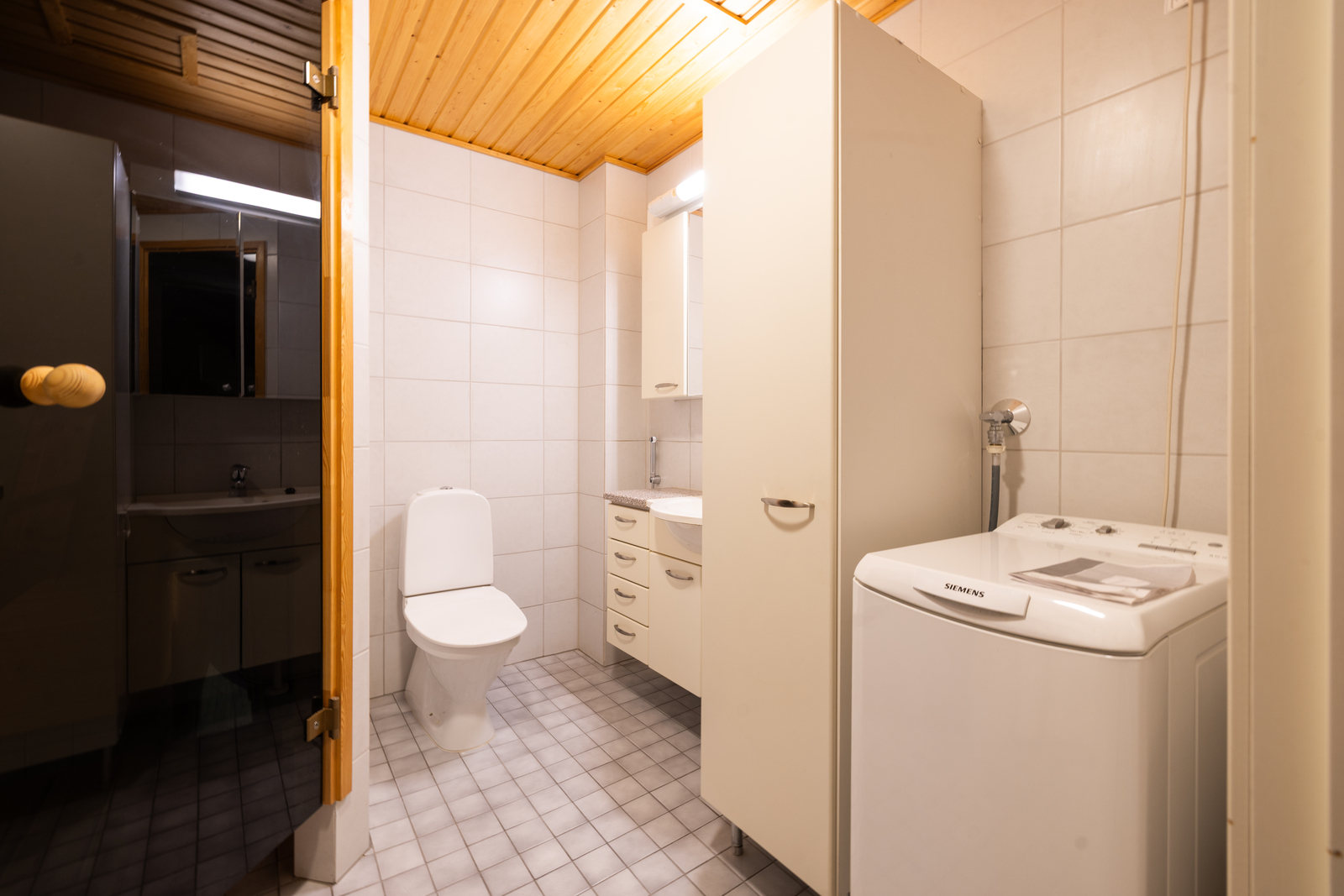 | Kylpyhuoneen kuvaus | Suihku, allaskaappi, lattialämmitys, wc-istuin, peilikaappi, pesukoneliitäntä ja kiinteät valaisimet, seinät (kaakeli), lattiat (laatta) |