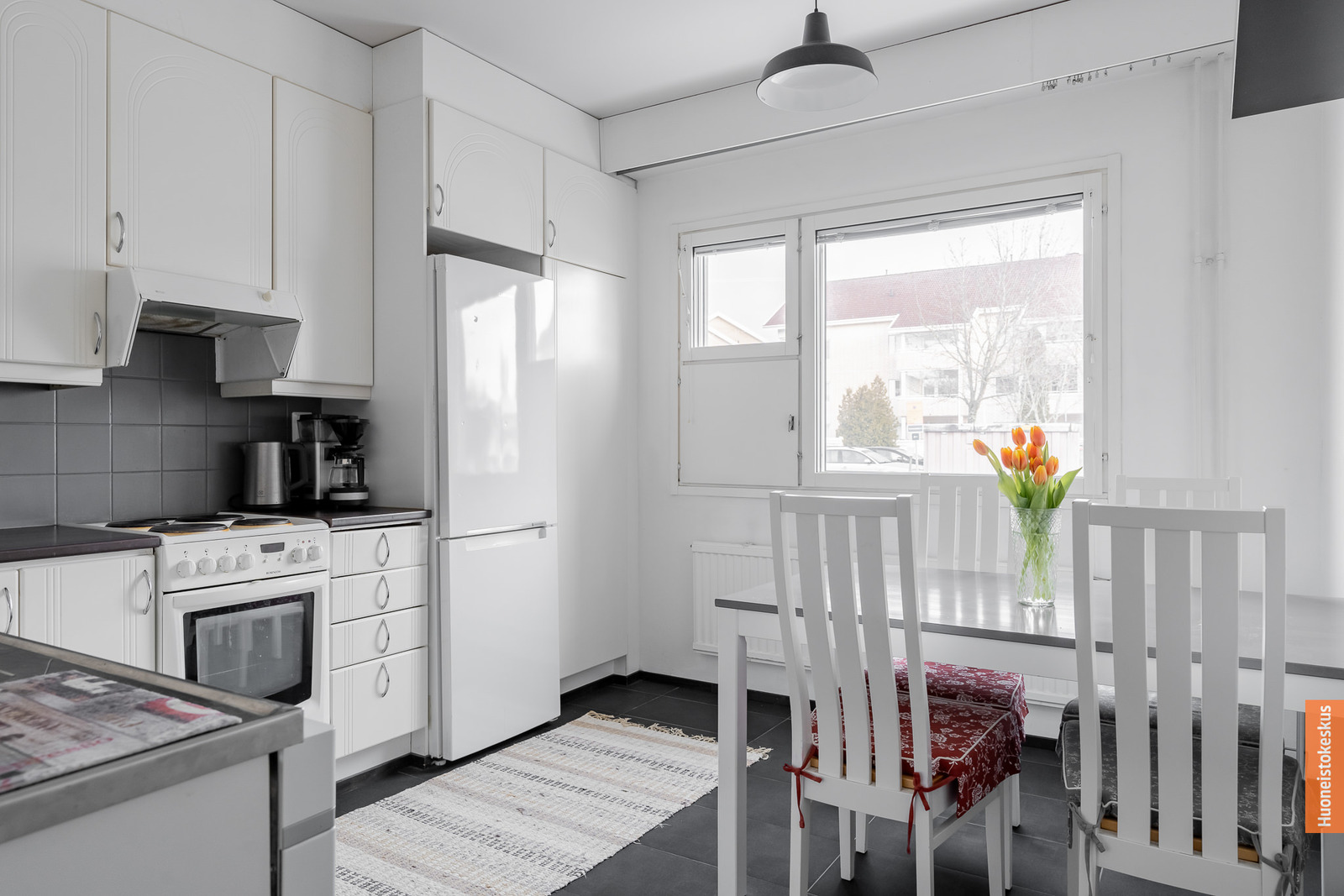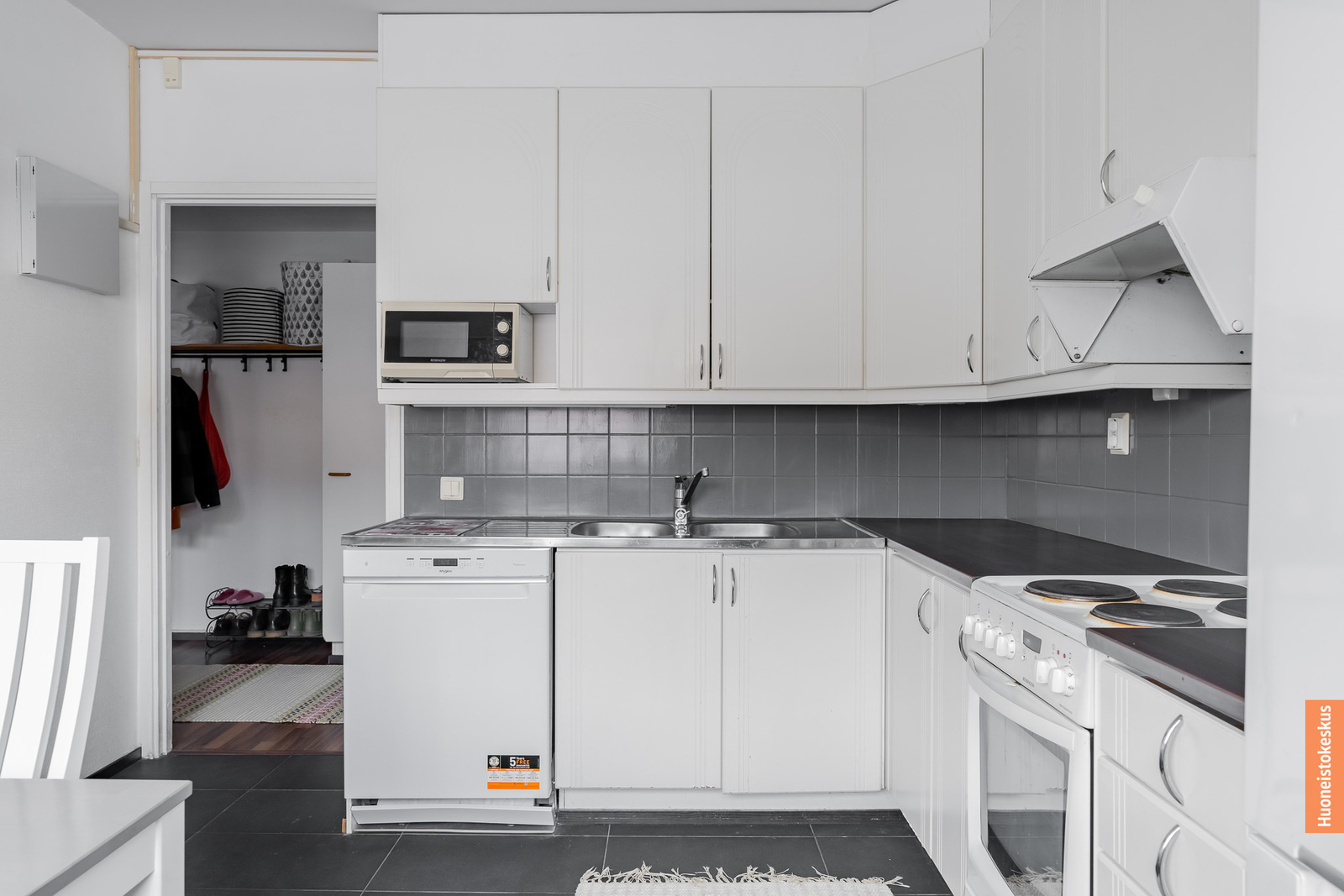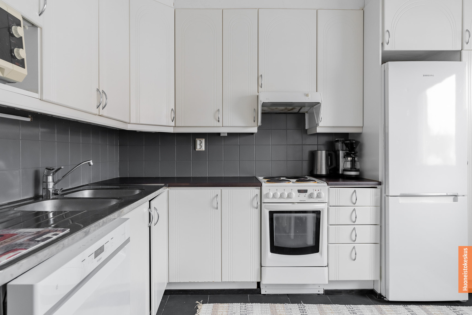 | Keittiön kuvaus | Liesi (sähköliesi), seinät (maali ja osalaatoitus, lasikuitutapetti), lattiat (laatta), liesituuletin, liesi, astianpesukone ja jääkaappipakastin |