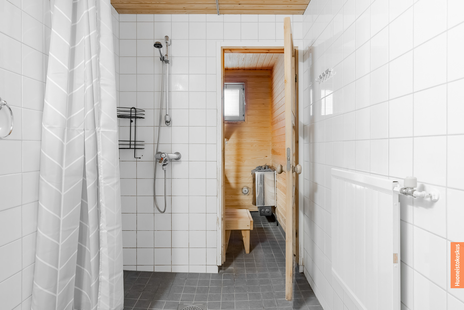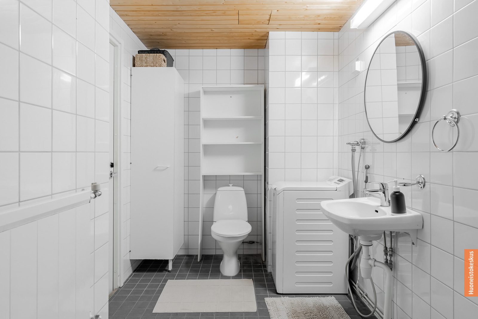 | Kylpyhuoneen kuvaus | Pesukoneliitäntä, suihku, wc-istuin ja pesukone, seinät (kaakeli), lattiat (laatta) |