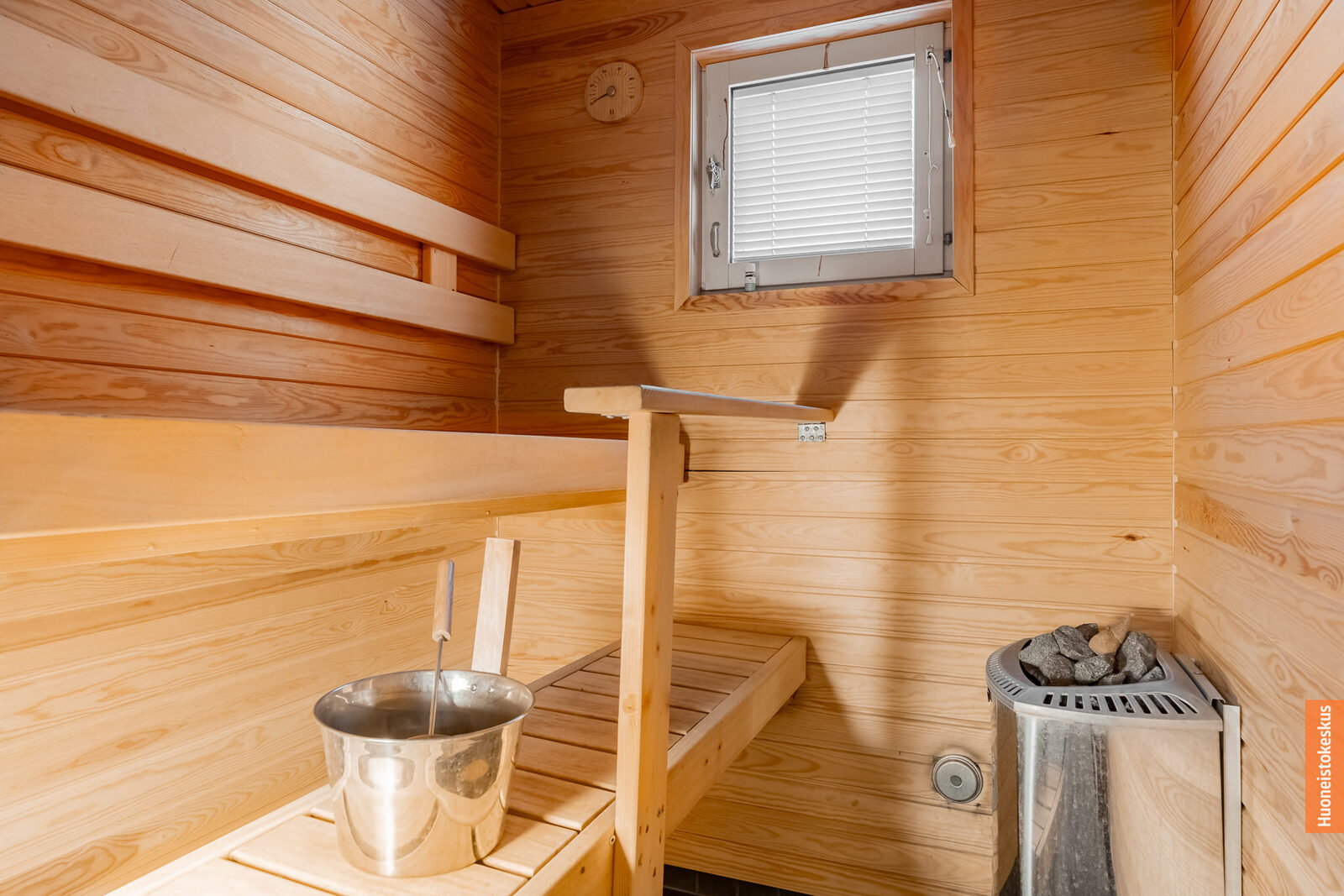 | Saunan kuvaus | Seinät (puu), lattiat (laatta), Sähkökiuas |