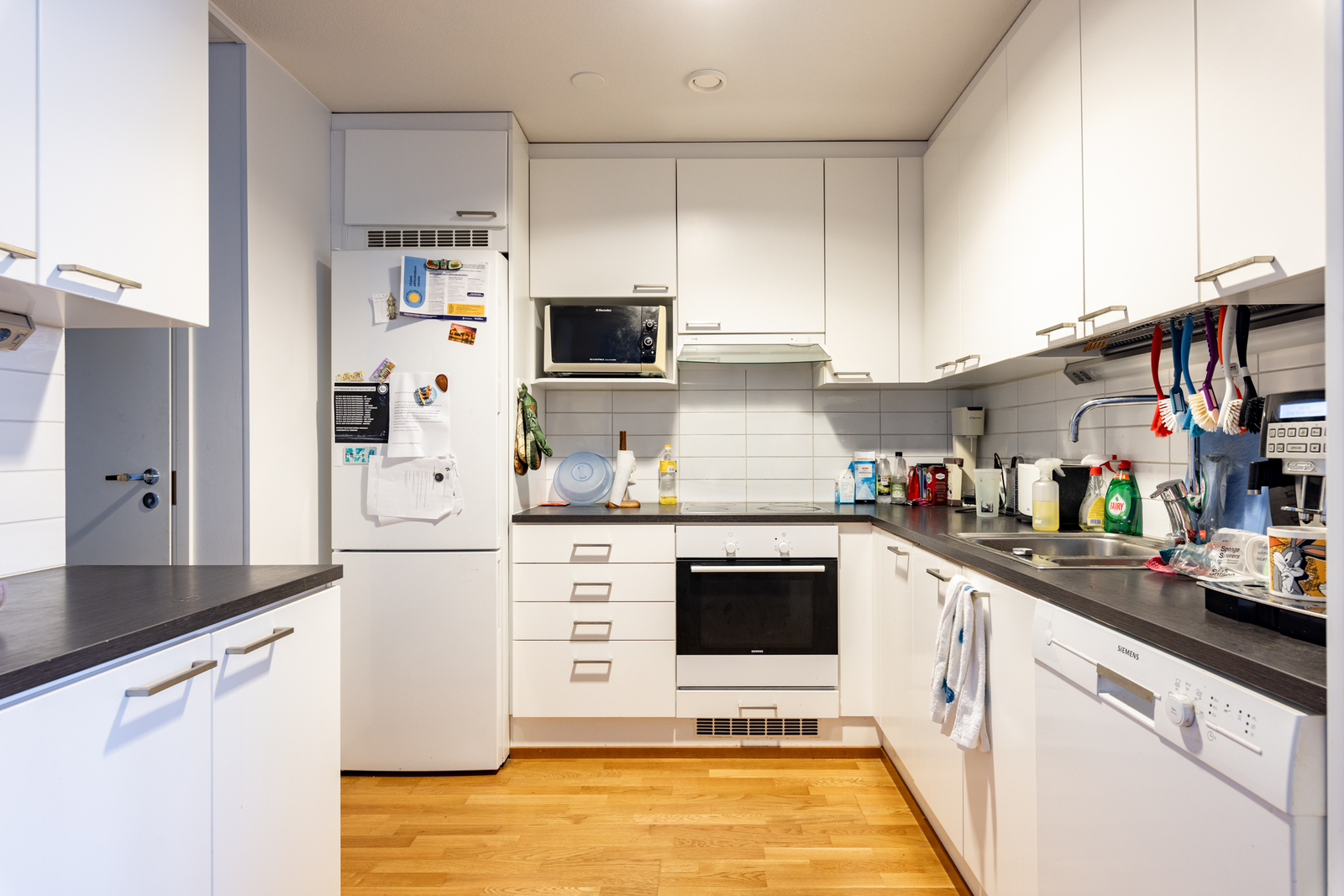 | Keittiön kuvaus | Liesi (Keraaminen liesi), työtasot (laminaatti), seinät (maali ja osalaatoitus), lattiat (parketti), astianpesukone, jääkaappipakastin ja liesituuletin |