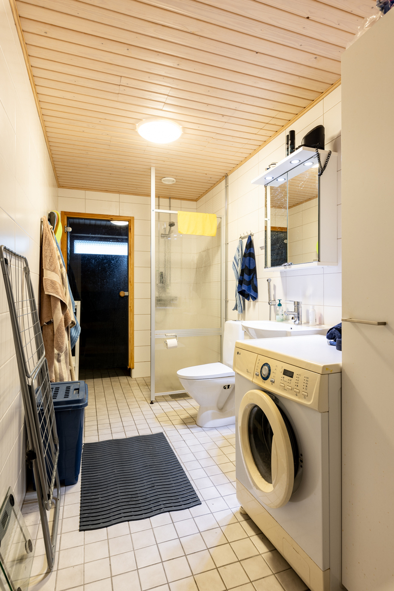 | Kylpyhuoneen kuvaus | Suihkuseinä, pesukoneliitäntä, suihku ja lattialämmitys, seinät (kaakeli), lattiat (laatta) |
