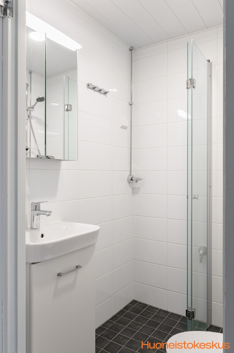 | Kylpyhuoneen kuvaus | Peilikaappi, lattialämmitys, wc-istuin, pesukoneliitäntä, suihku, suihkuseinä, allaskaappi ja kiinteät valaisimet, seinät (kaakeli), lattiat (laatta) |