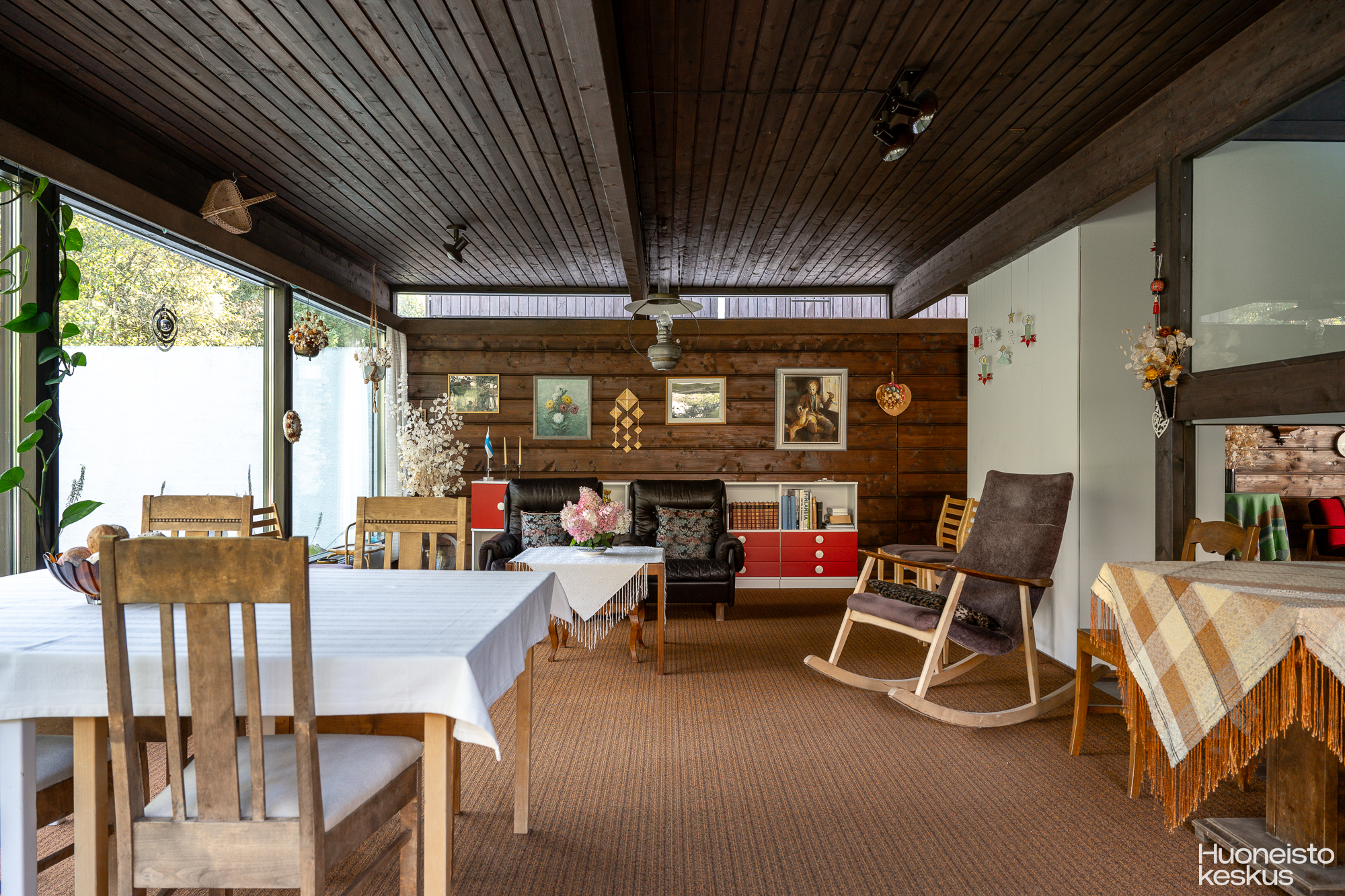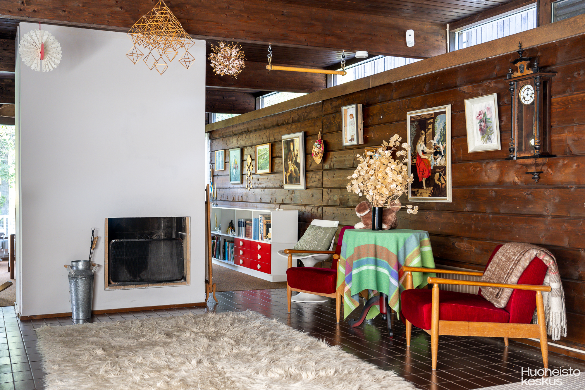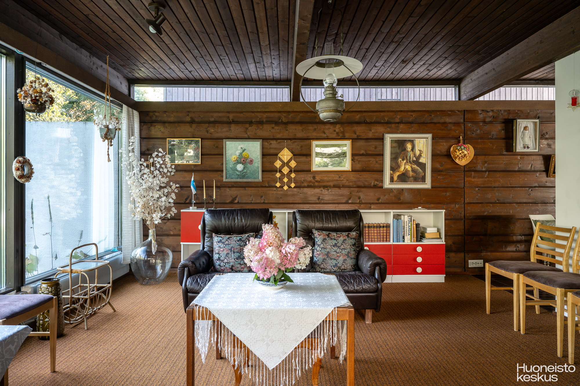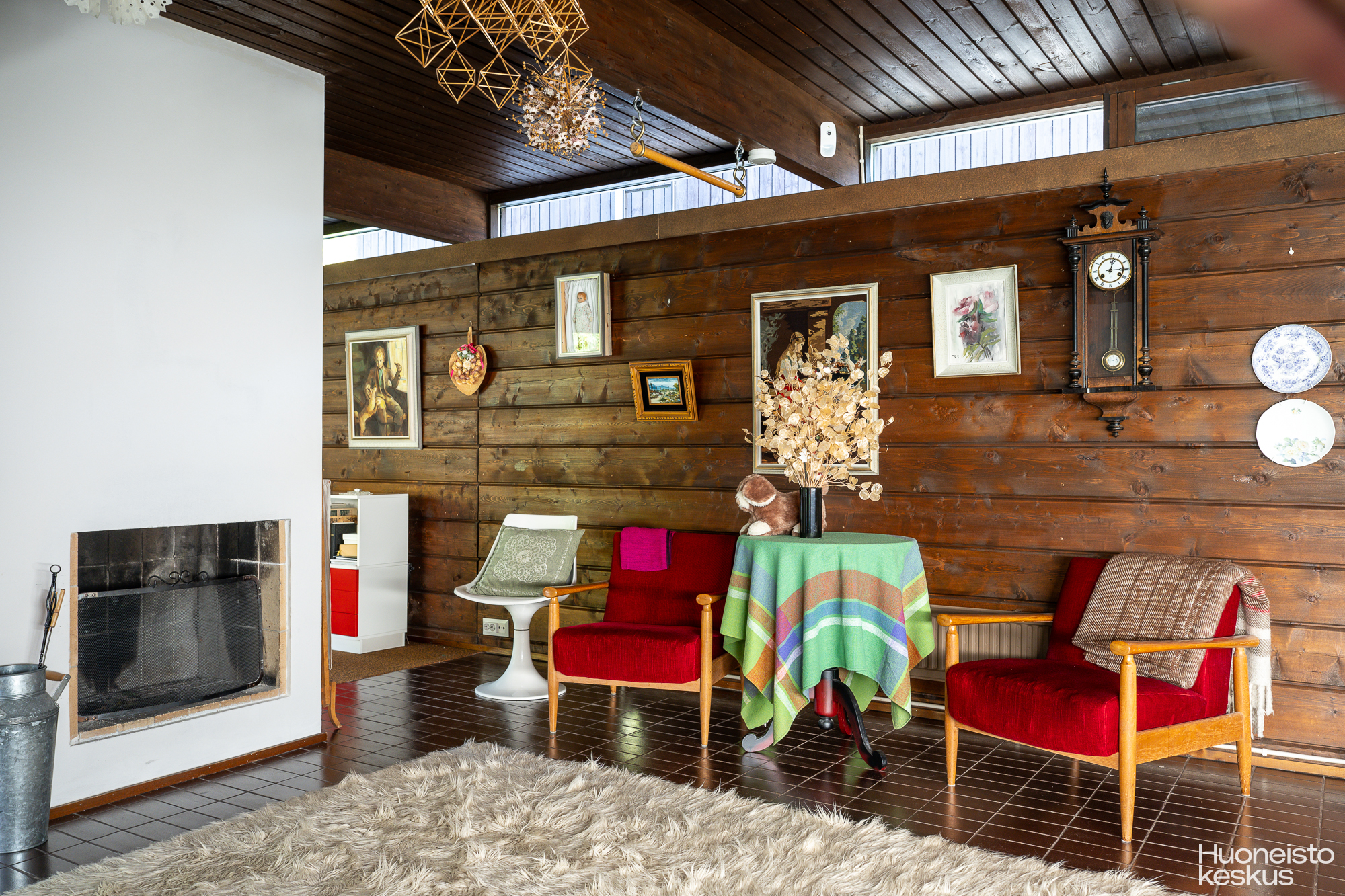 Vuonna 1973 valmistunut talo on kahdessa kerroksessa ja sen 300 neliömetrin asuintilat tarjoavat runsaasti tilaa suuremmallekin perheelle. Talossa on kuusi makuuhuonetta, joten jokaiselle perheenjäsenelle löytyy oma rauhallinen tila. Olohuoneen takka luo lämpöä ja tunnelmaa viileisiin iltoihin.