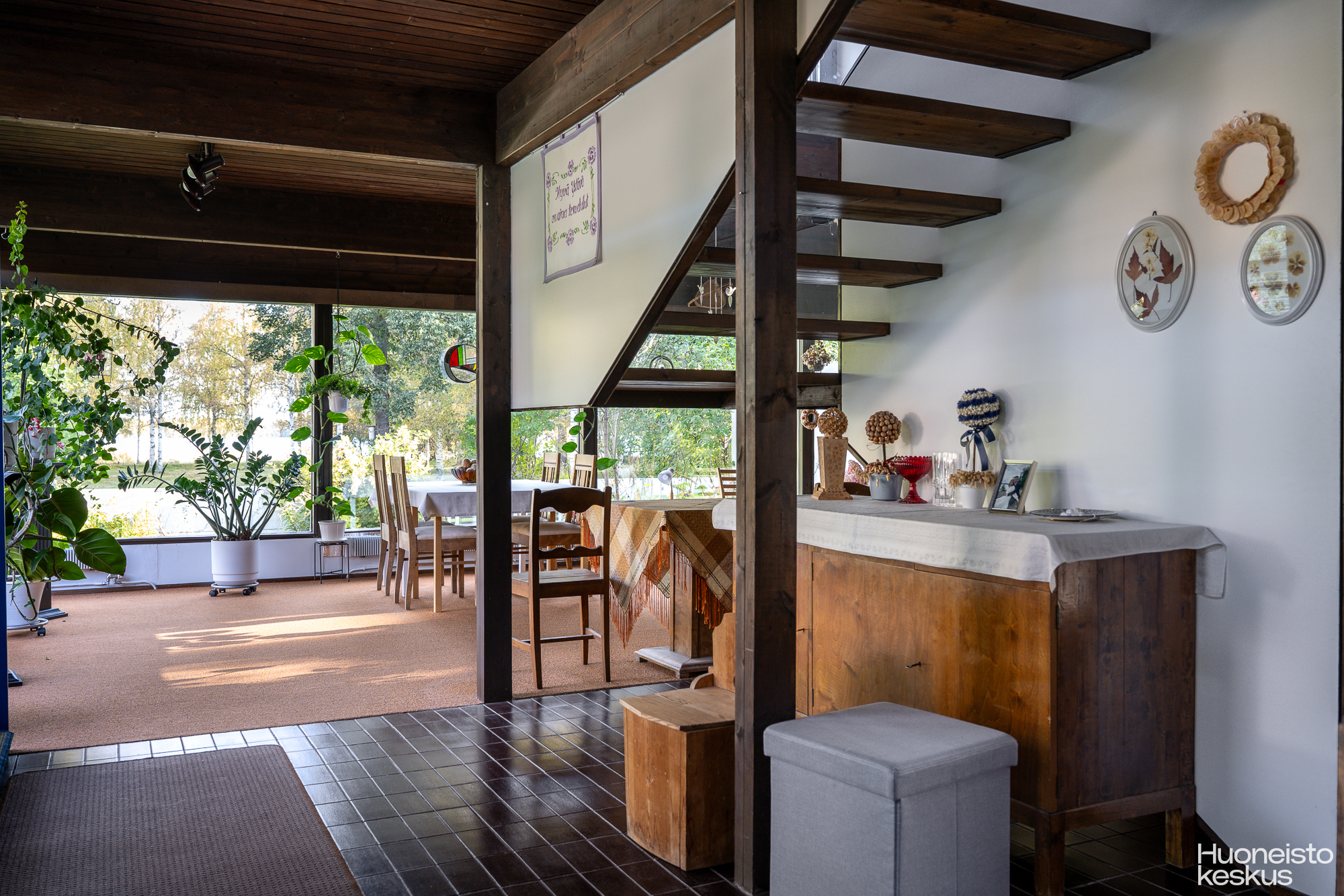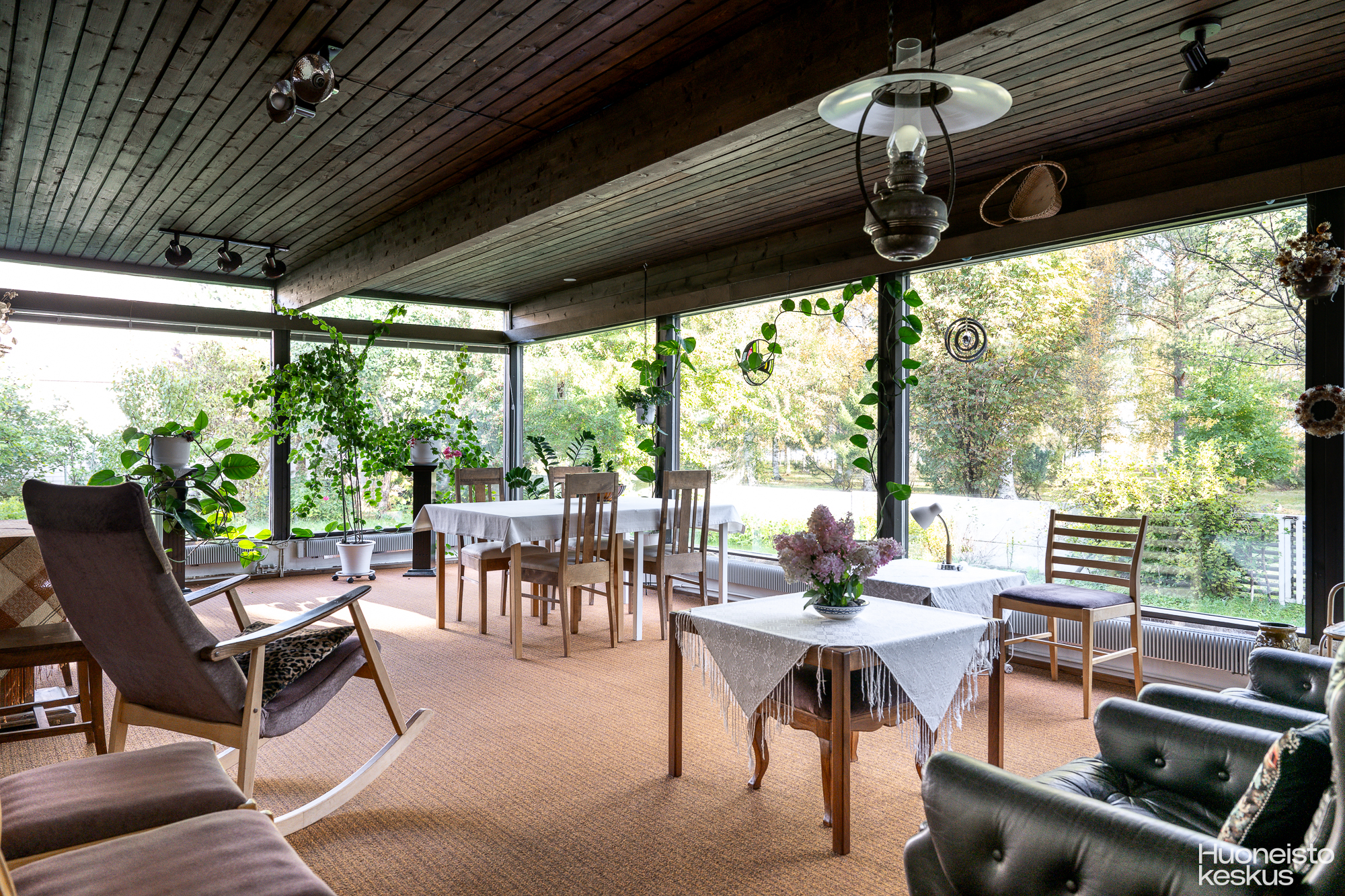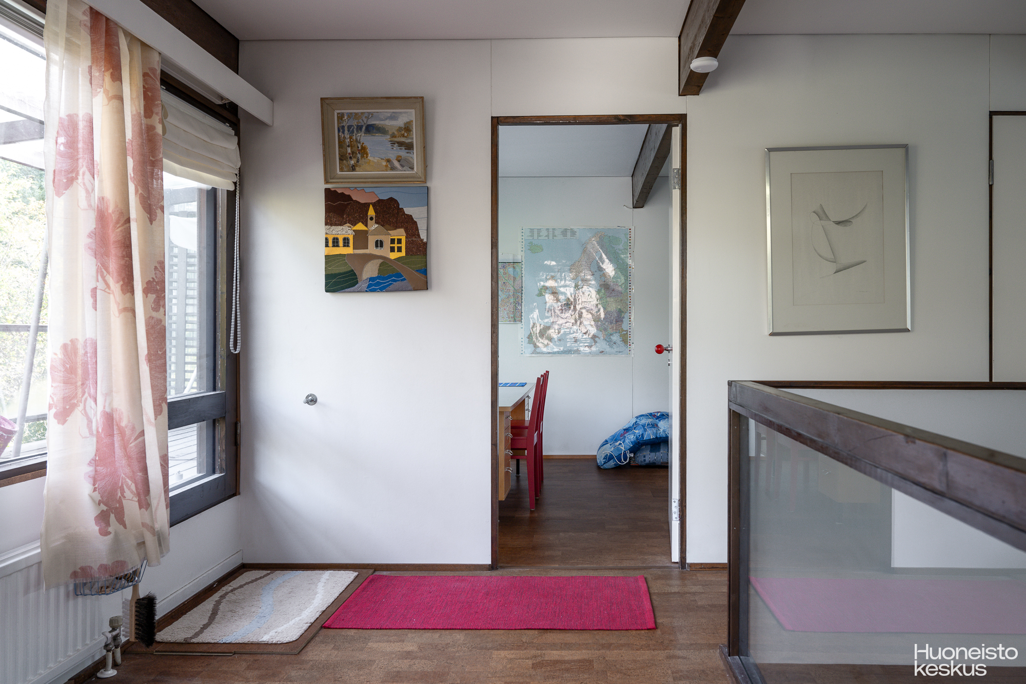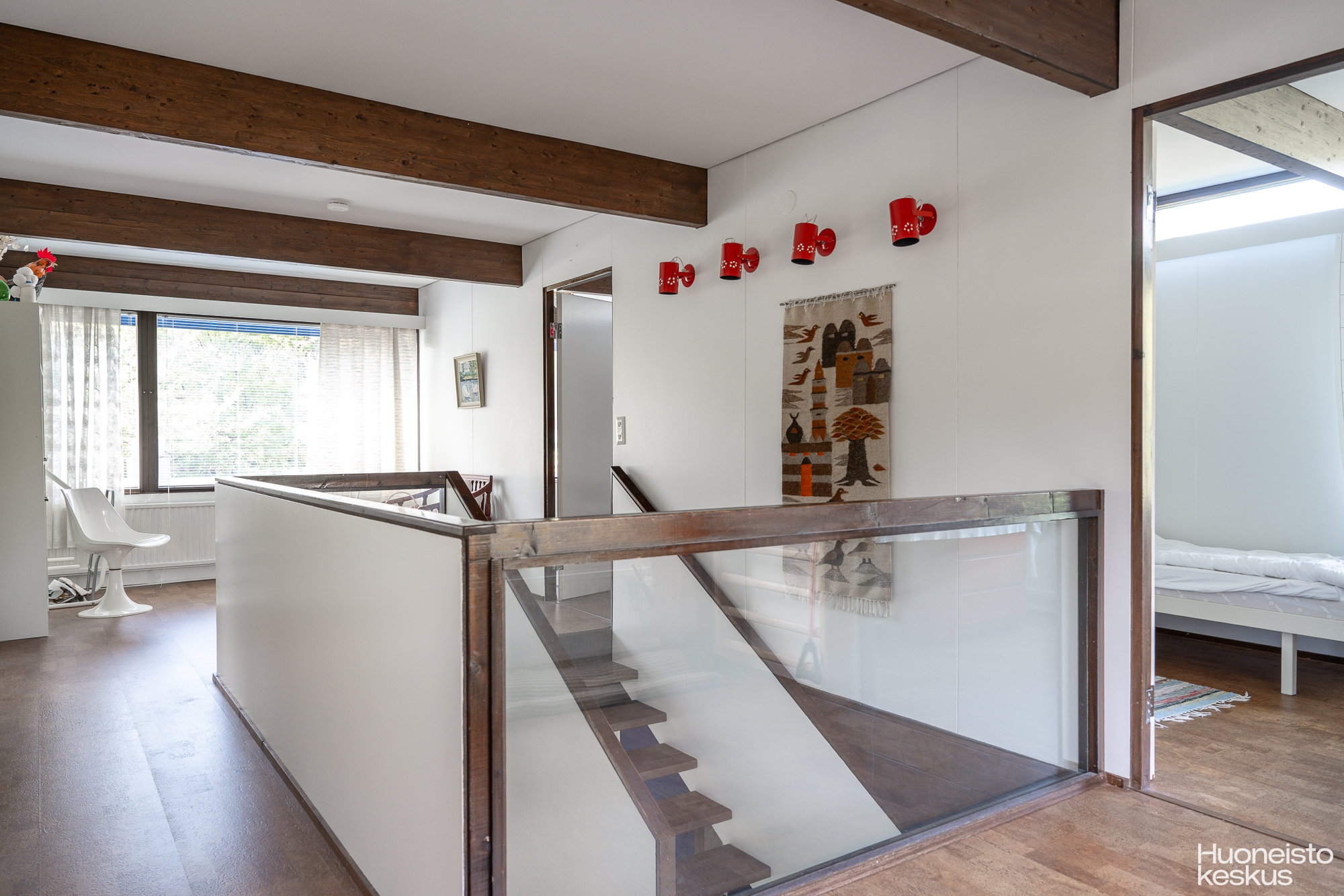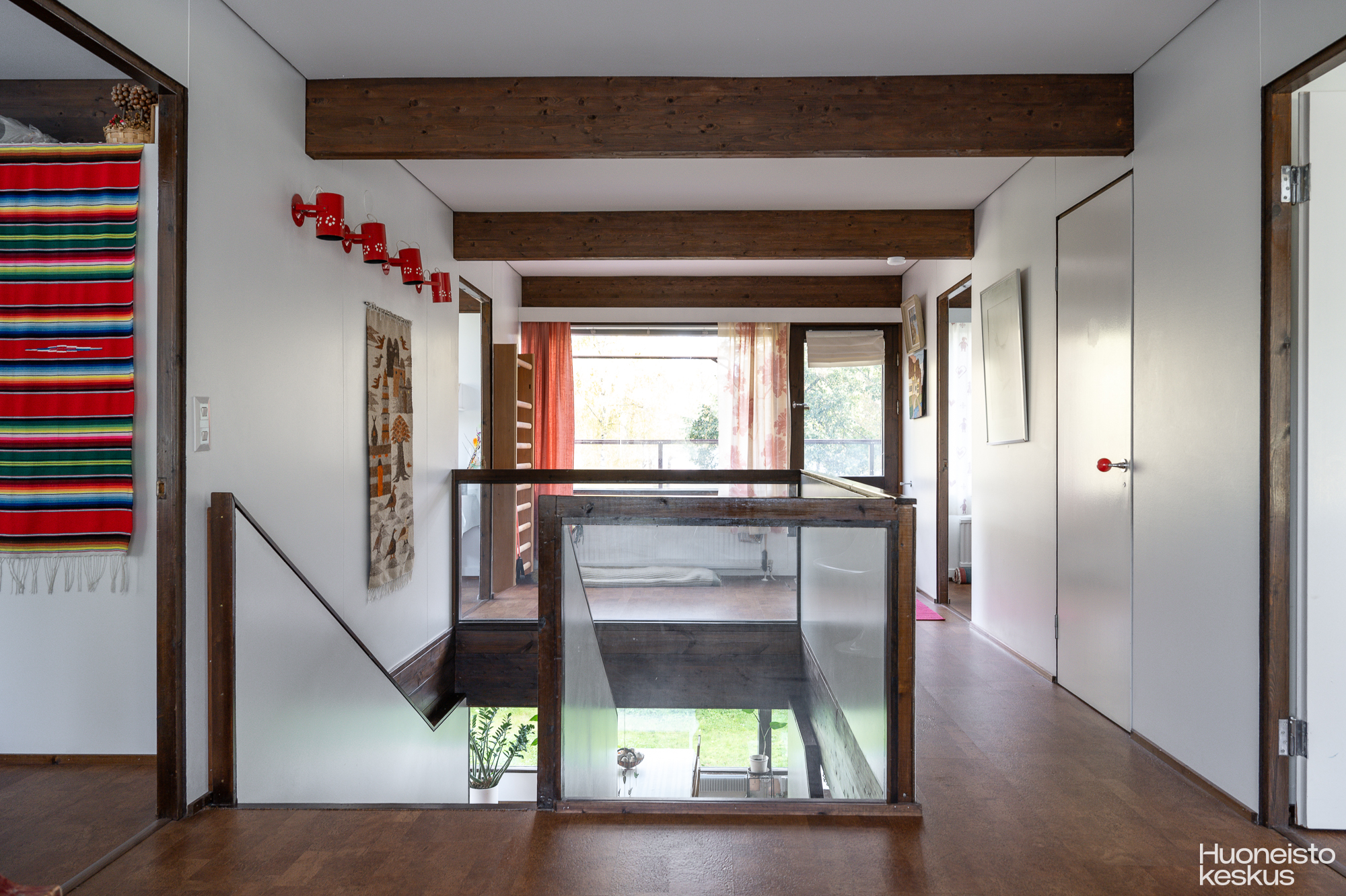 Vuonna 1973 valmistunut talo on kahdessa kerroksessa ja sen 300 neliömetrin asuintilat tarjoavat runsaasti tilaa suuremmallekin perheelle. Talossa on kuusi makuuhuonetta, joten jokaiselle perheenjäsenelle löytyy oma rauhallinen tila. Olohuoneen takka luo lämpöä ja tunnelmaa viileisiin iltoihin.