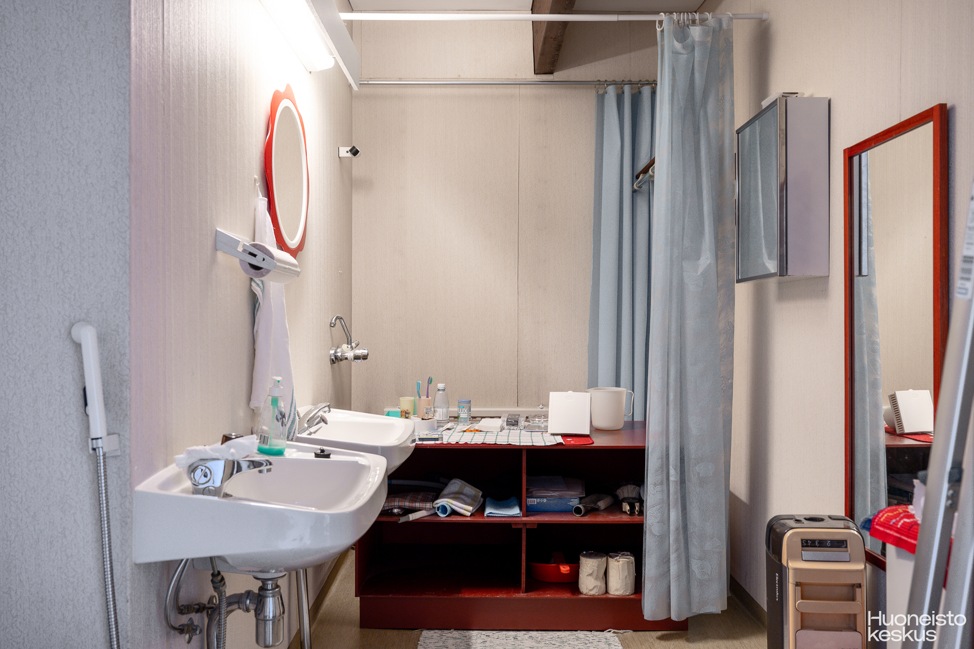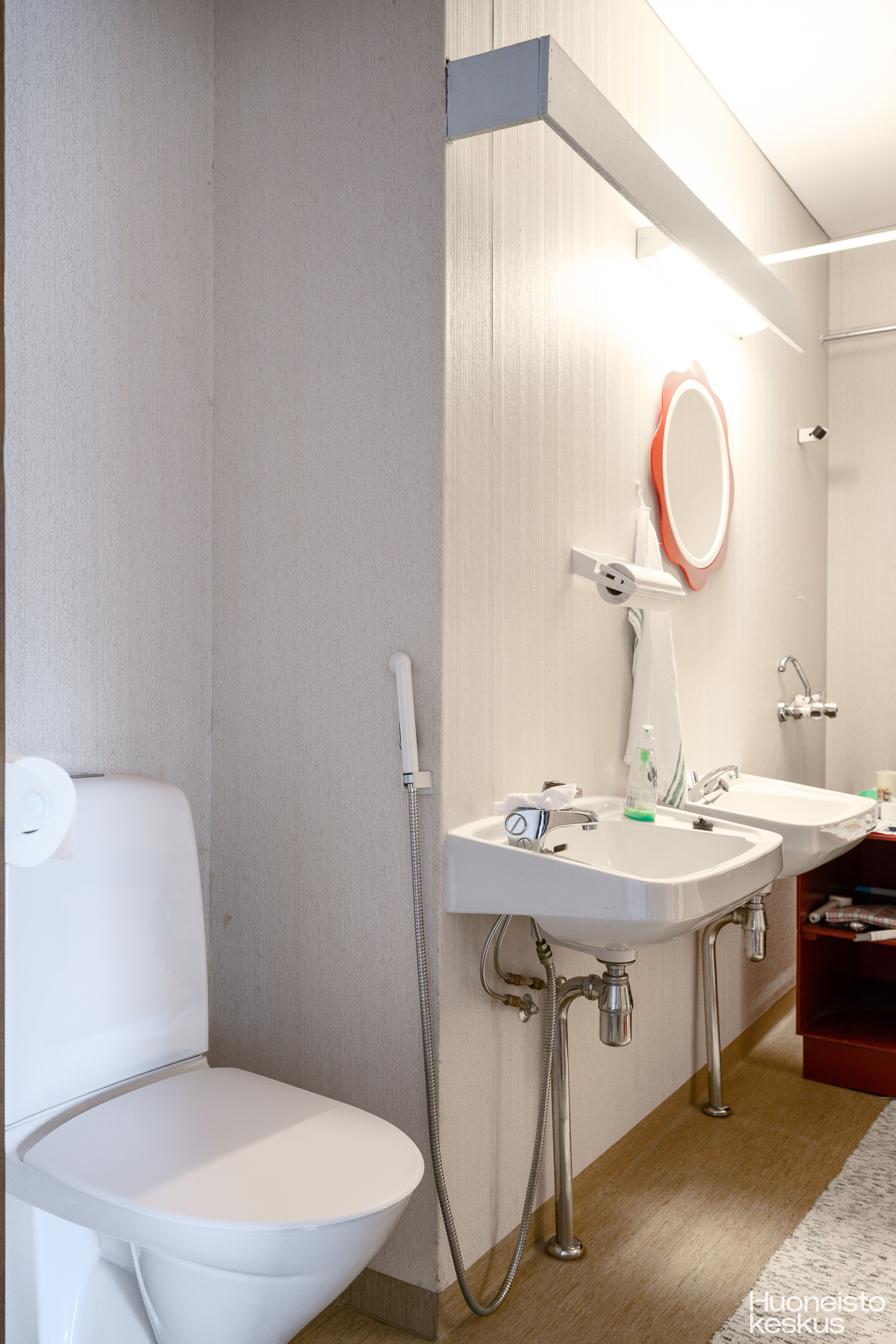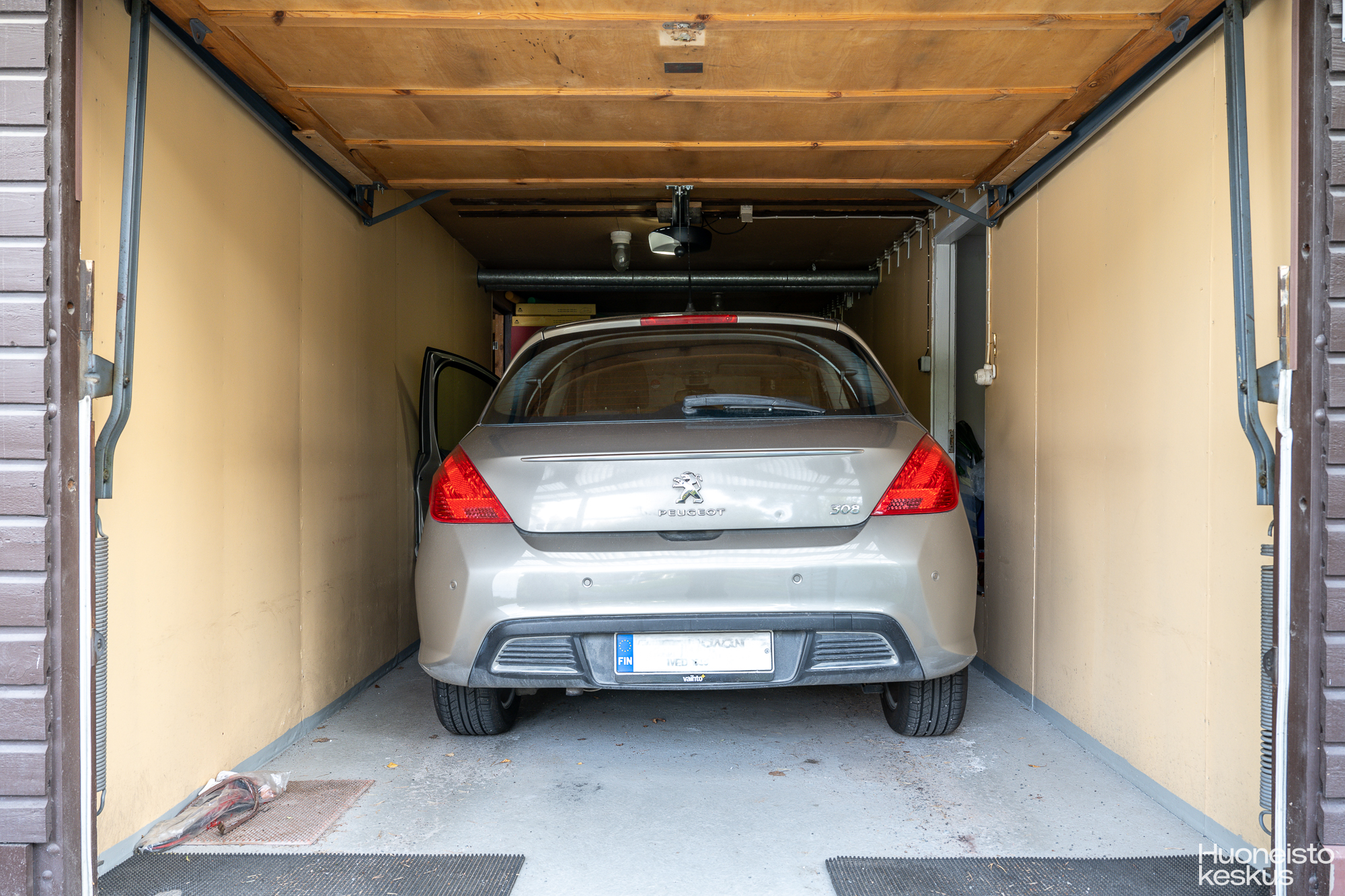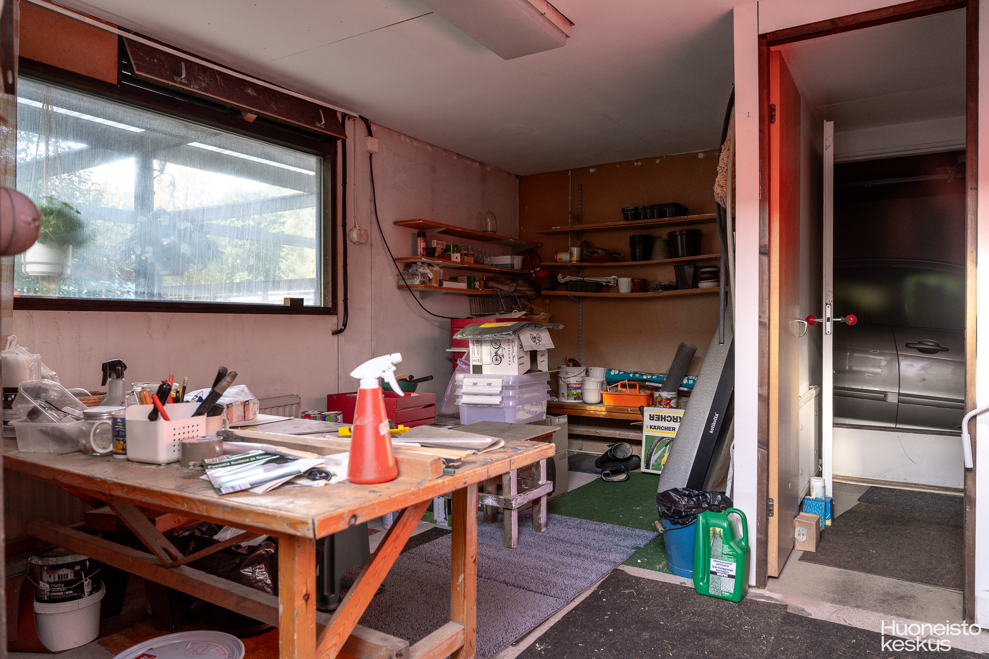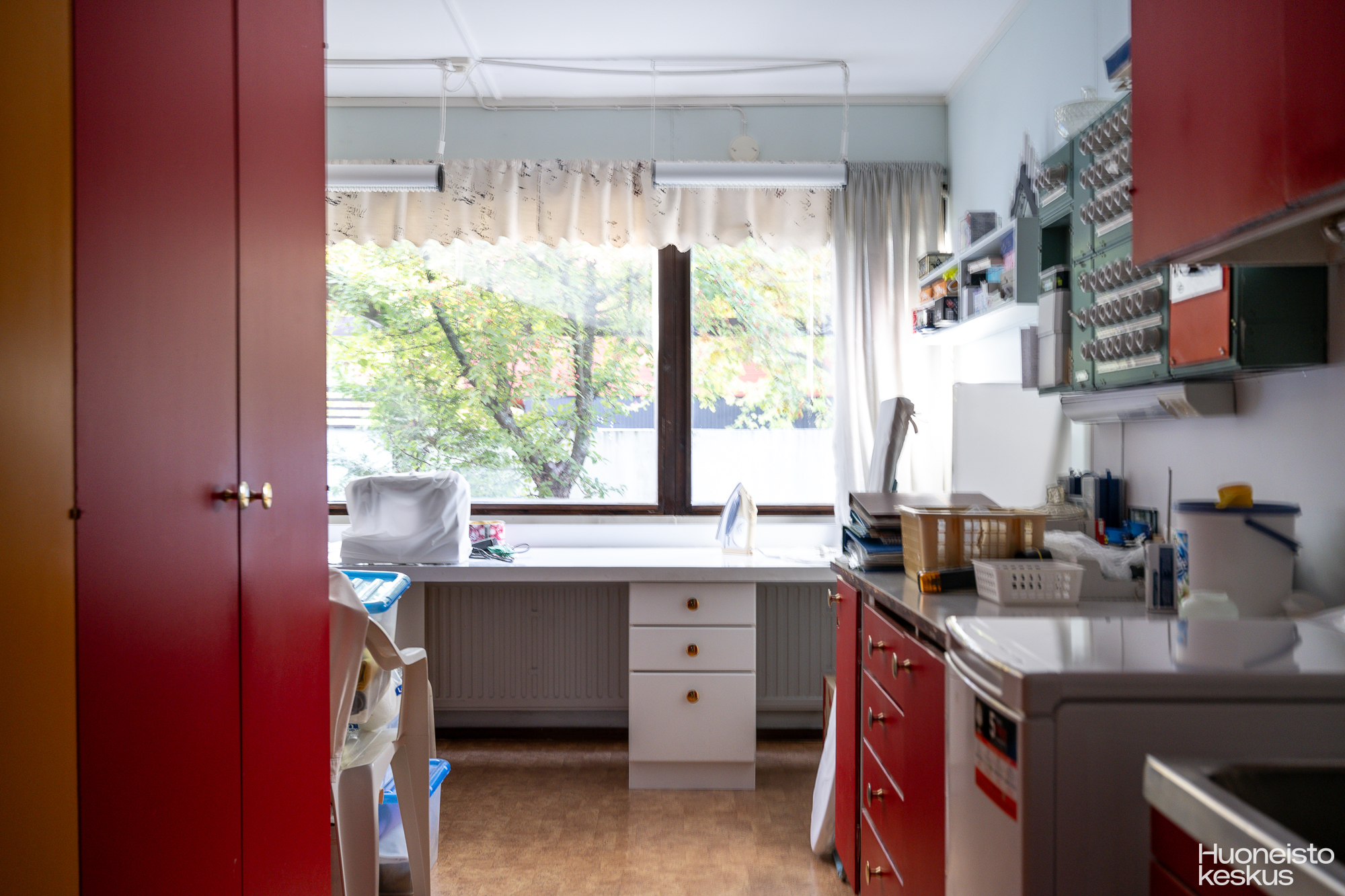 | Kodinhoitohuoneen kuvaus | Pesukoneliitäntä, pöytätaso ja pyykkikaapit, lattiat (muovimatto), seinät (maali) |