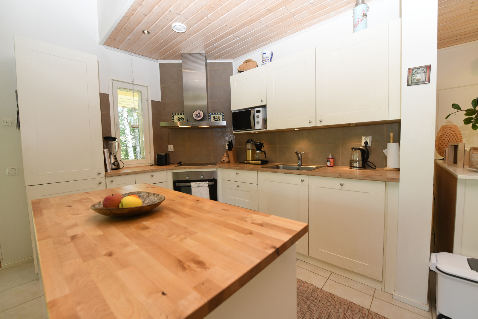 | Keittiön kuvaus | Liesi (erillisuuni, liesitaso), työtasot (laminaatti), seinät (maali), lattiat (laatta), liesituuletin, keittiösaareke, jääkaappipakastin, erillisuuni, astianpesukone ja kiinteät valaisimet, liesitaso |