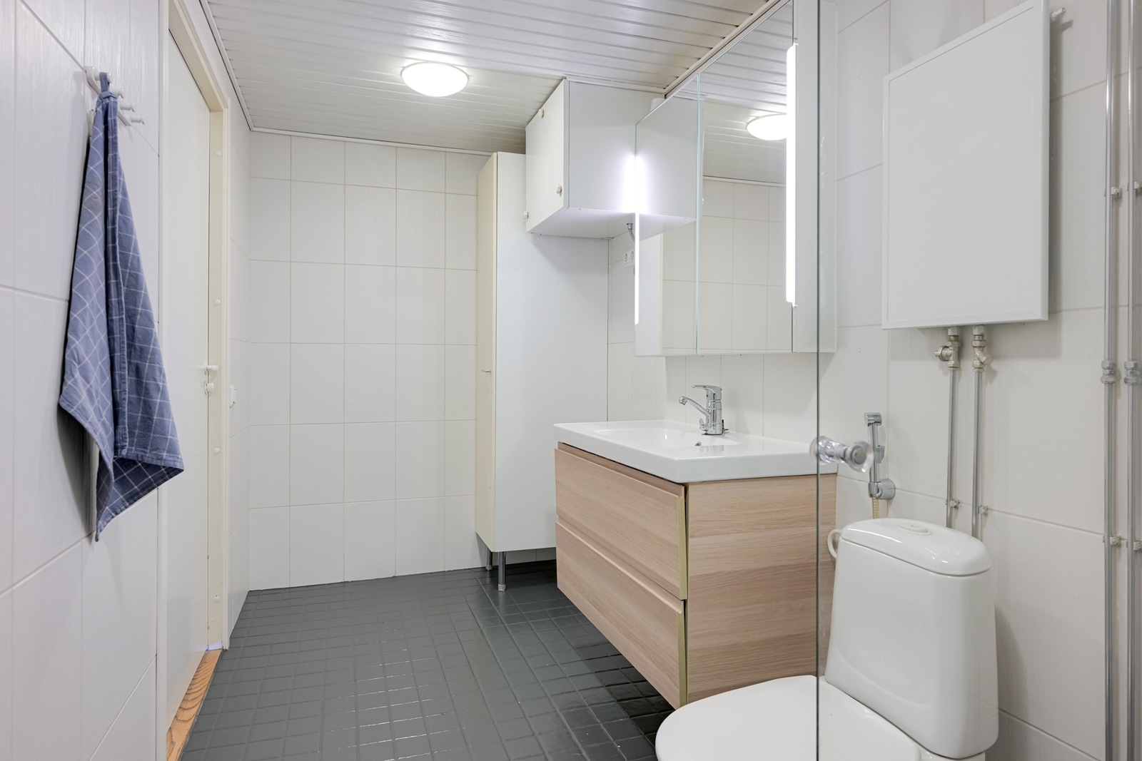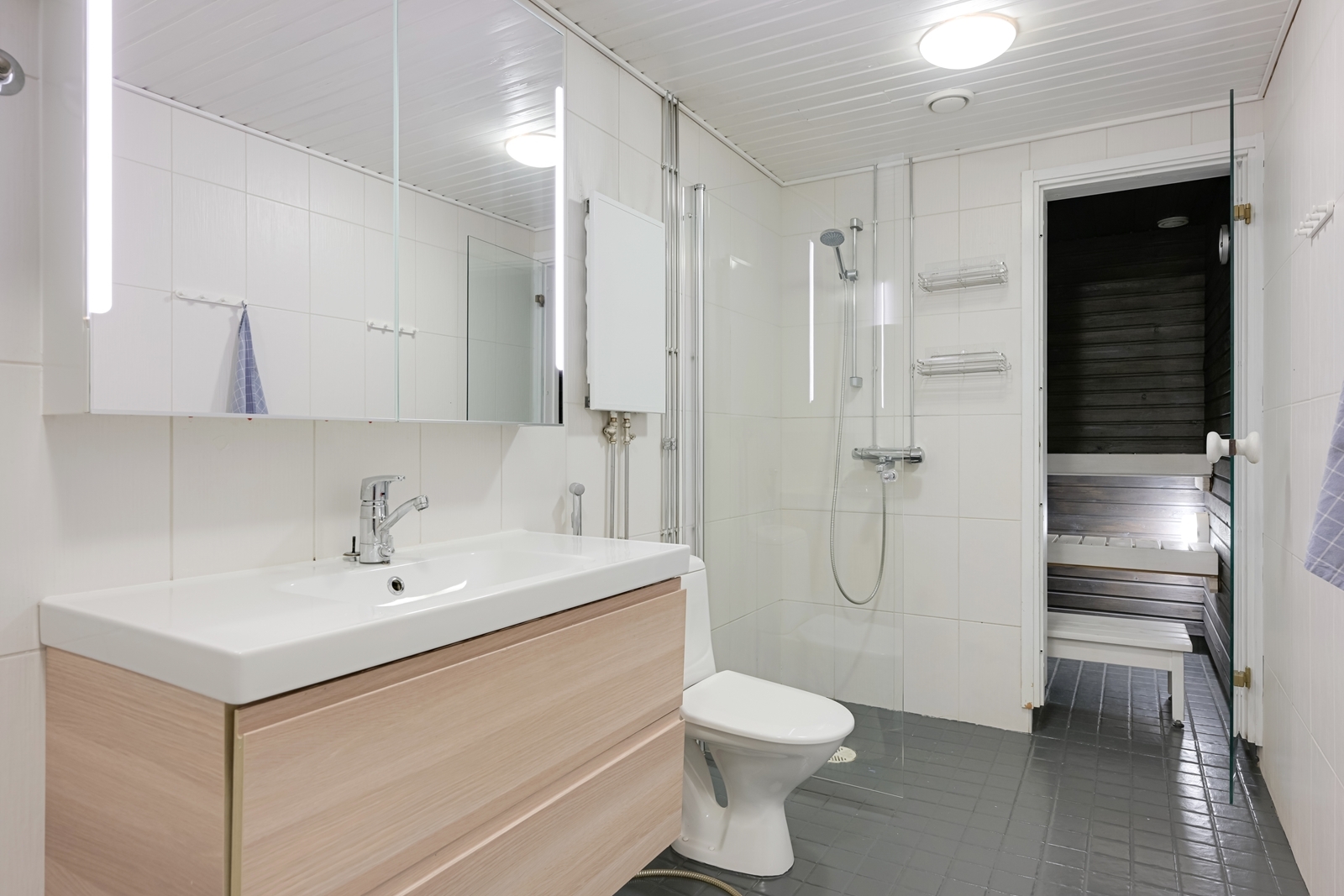 Pesukoneliitäntä, lattialämmitys, wc-istuin ja suihku, seinät (kaakeli), lattiat (laatta) |